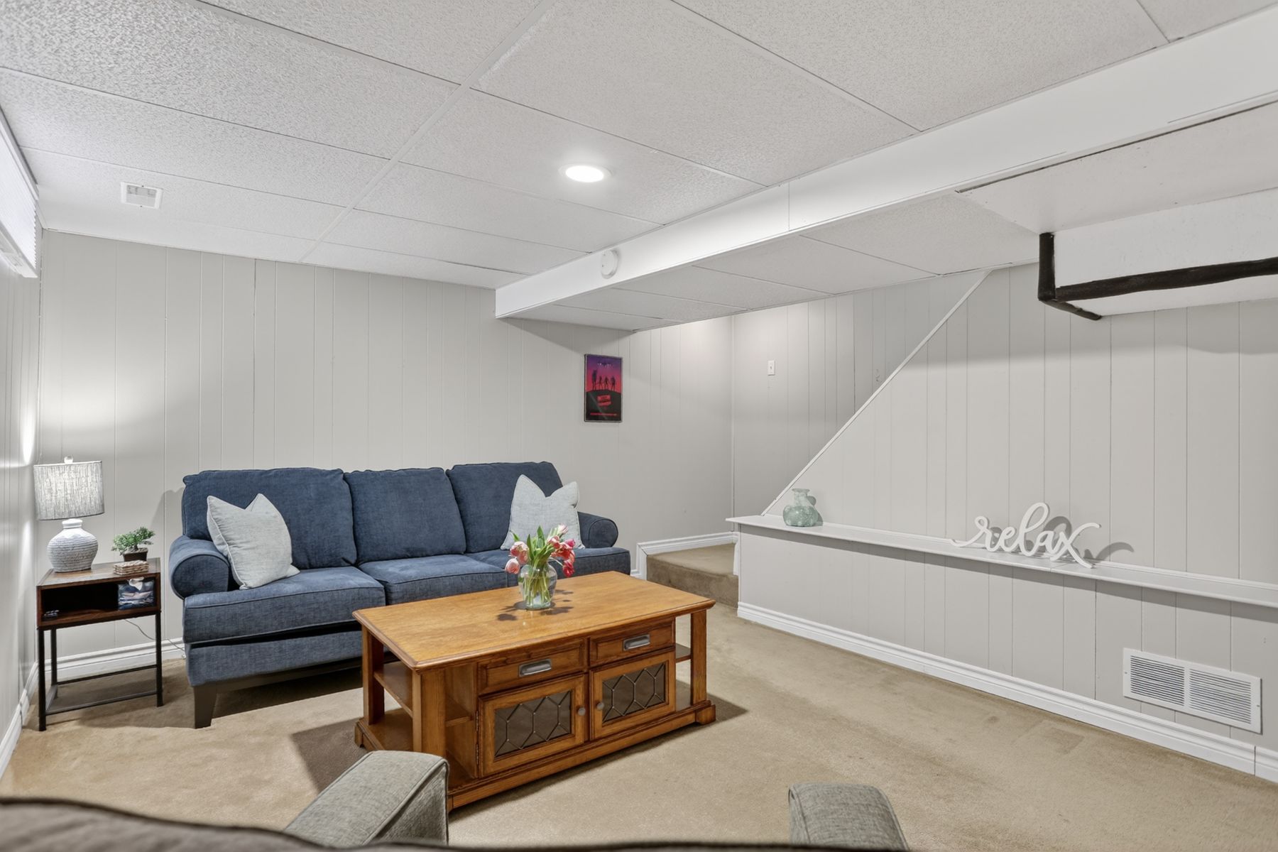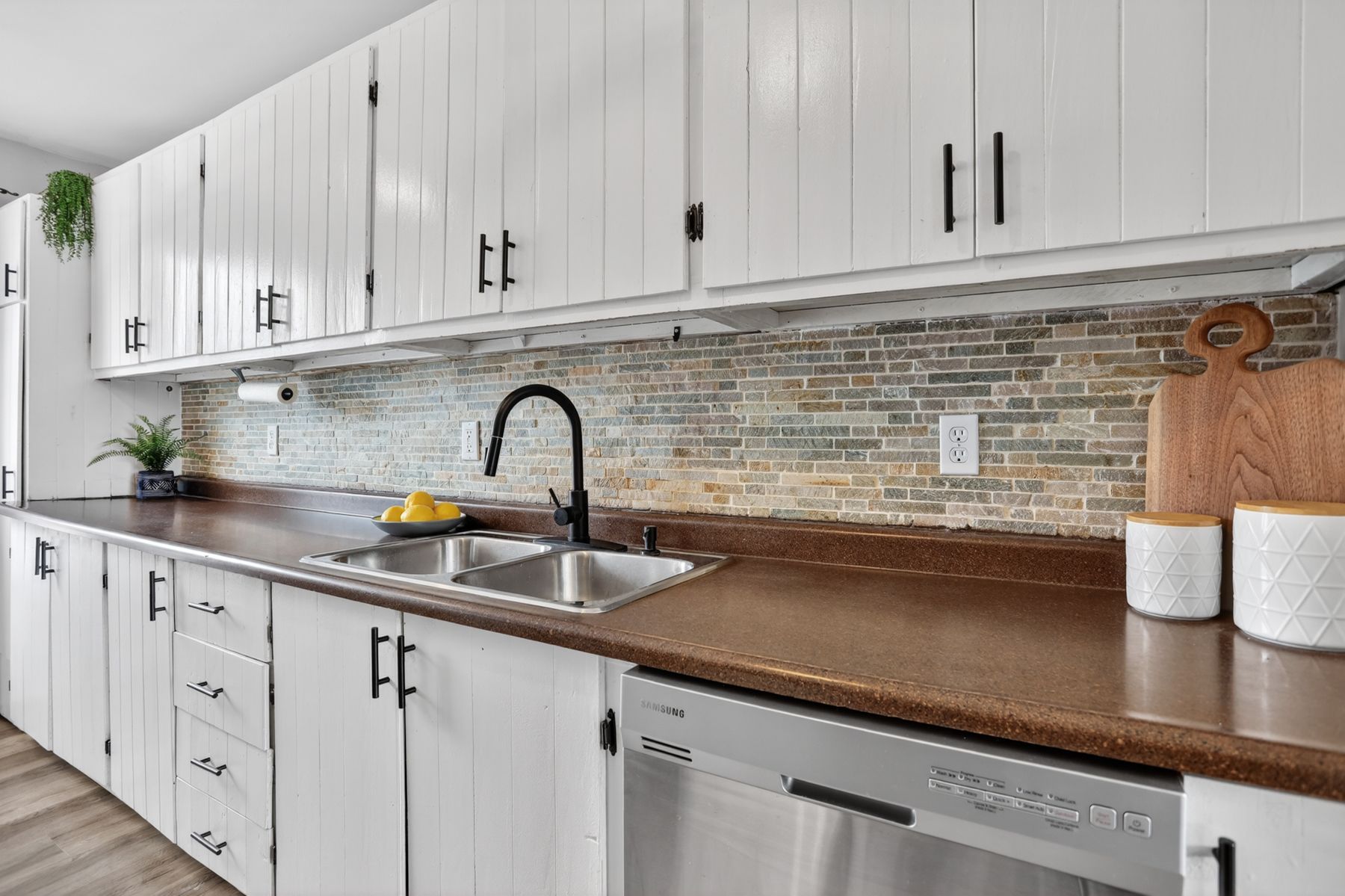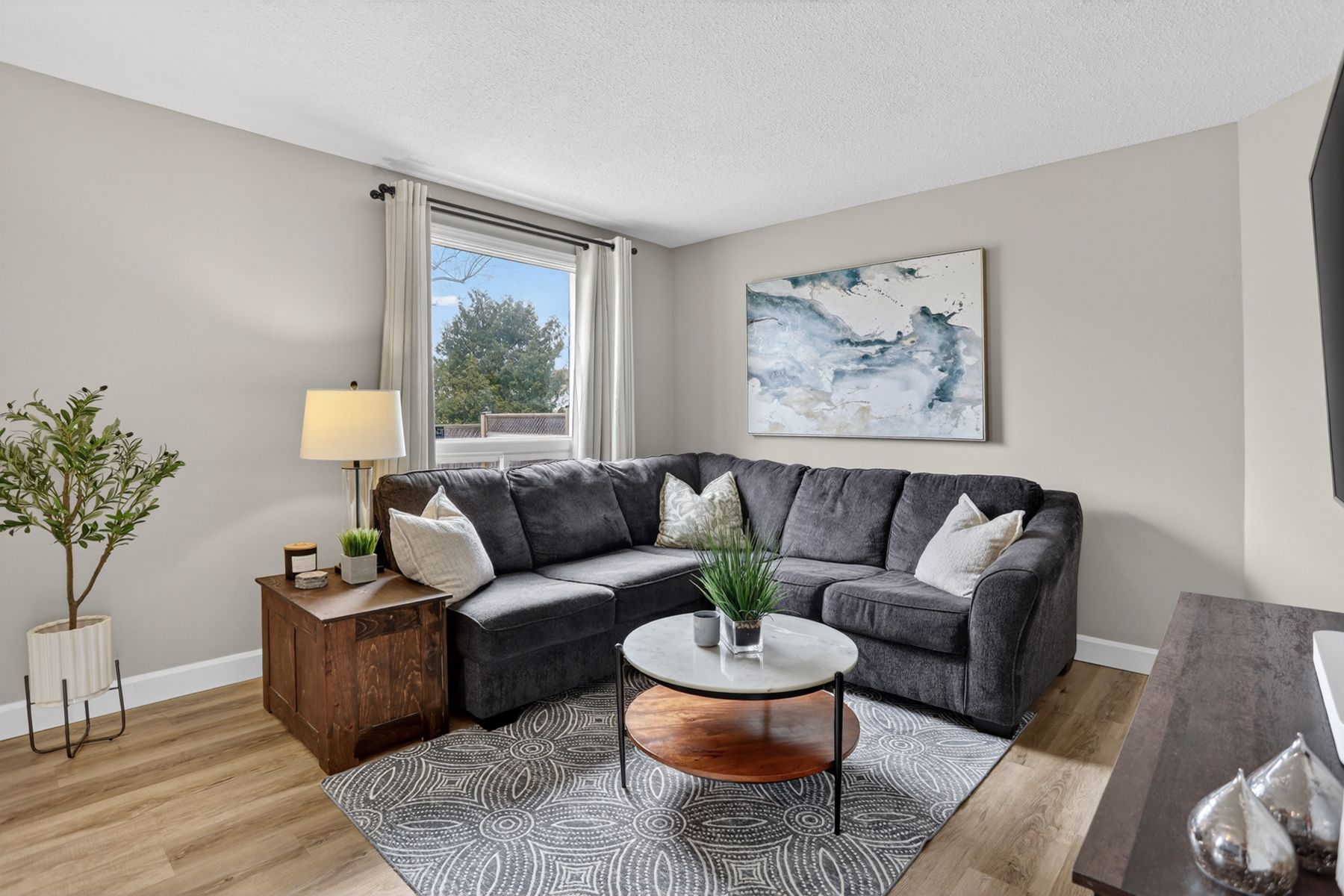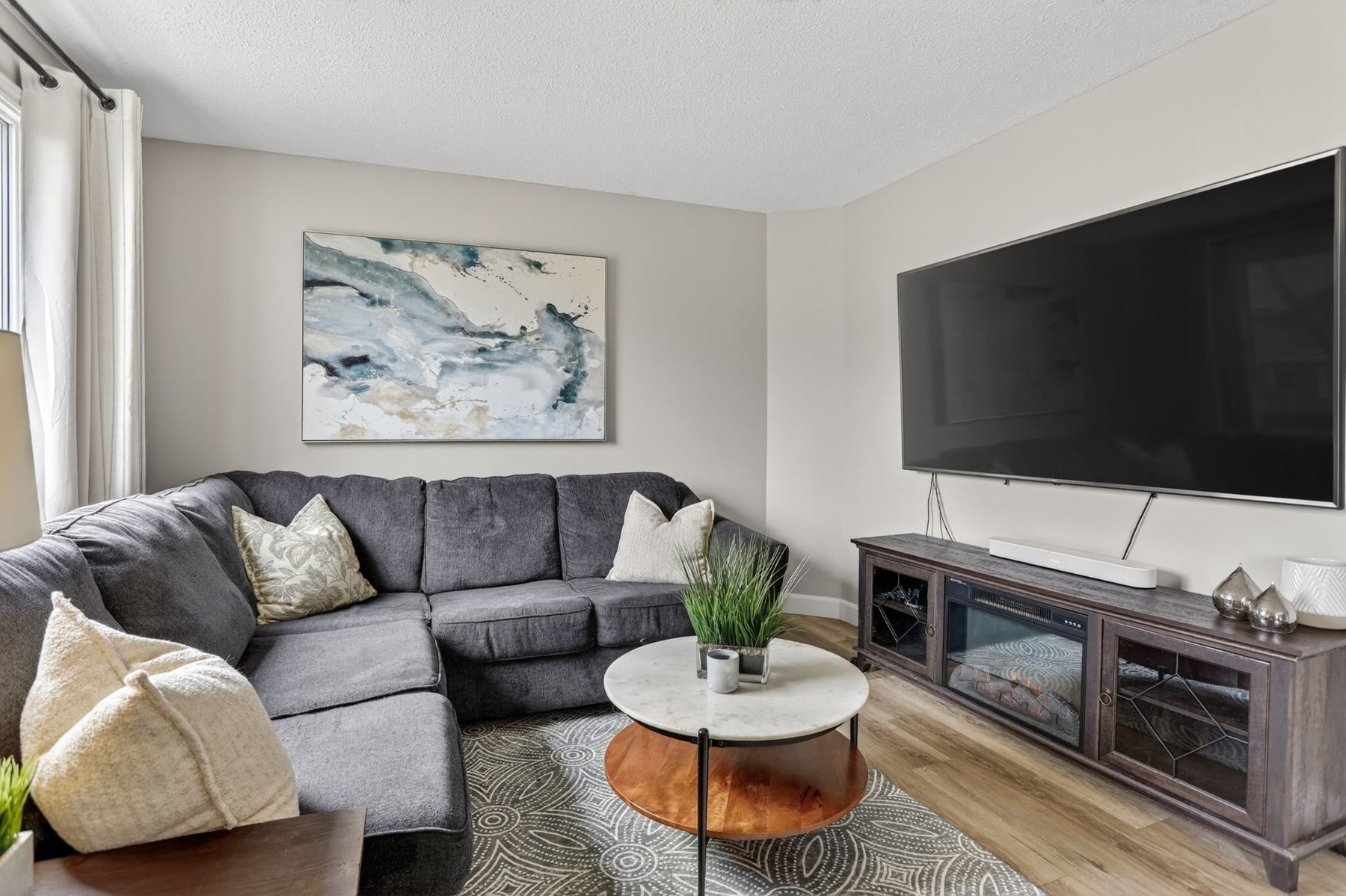 • New flooring and updated powder room enhance modern living.