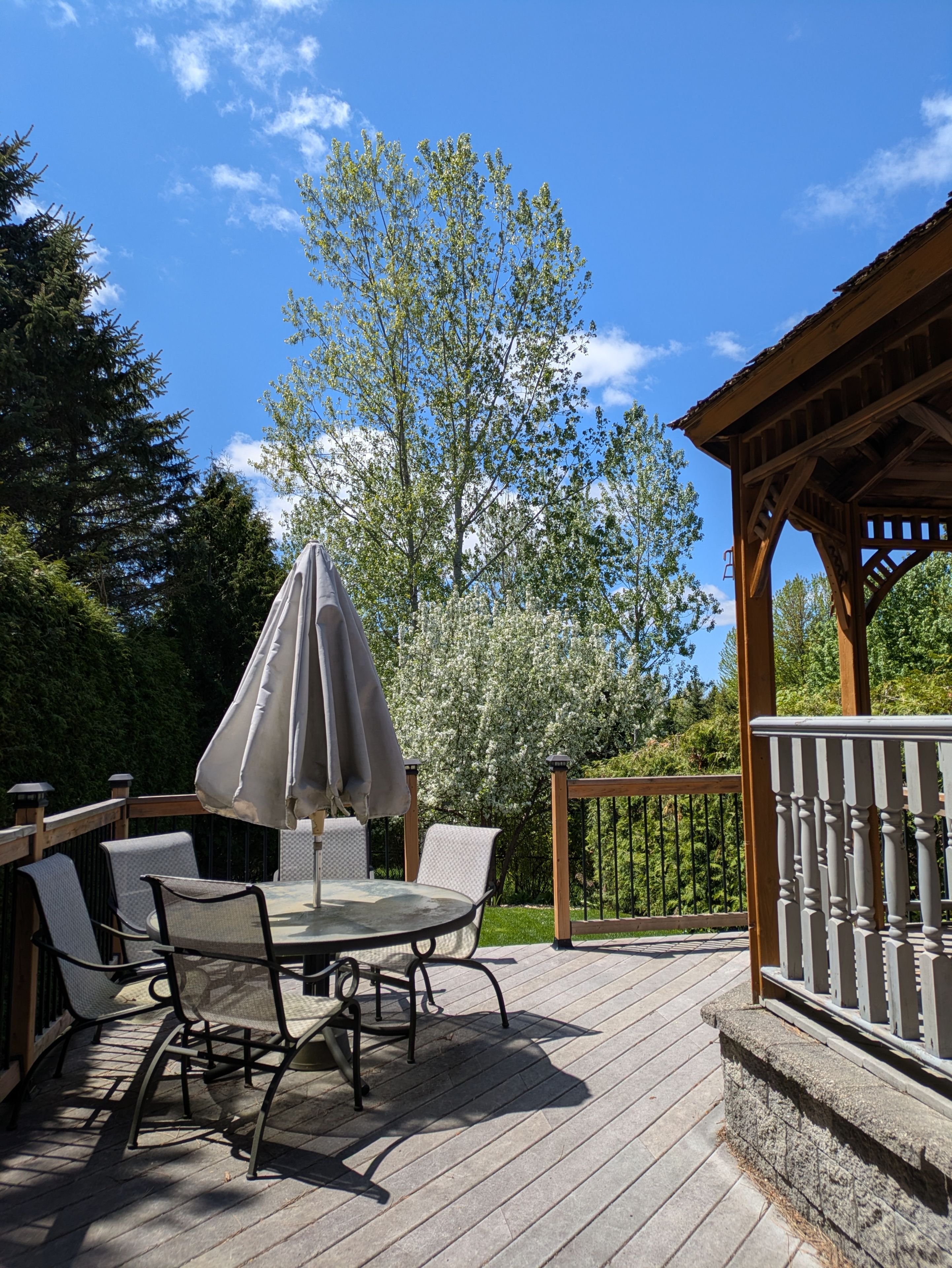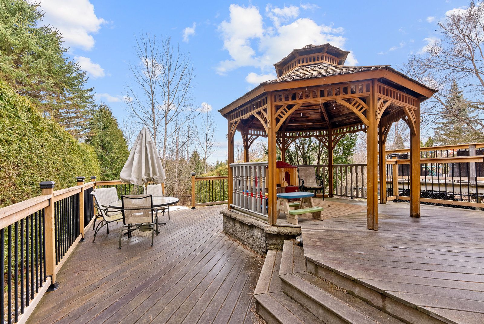 • Backyard oasis with landscaped yard, elevated deck, and gazebo for relaxation.