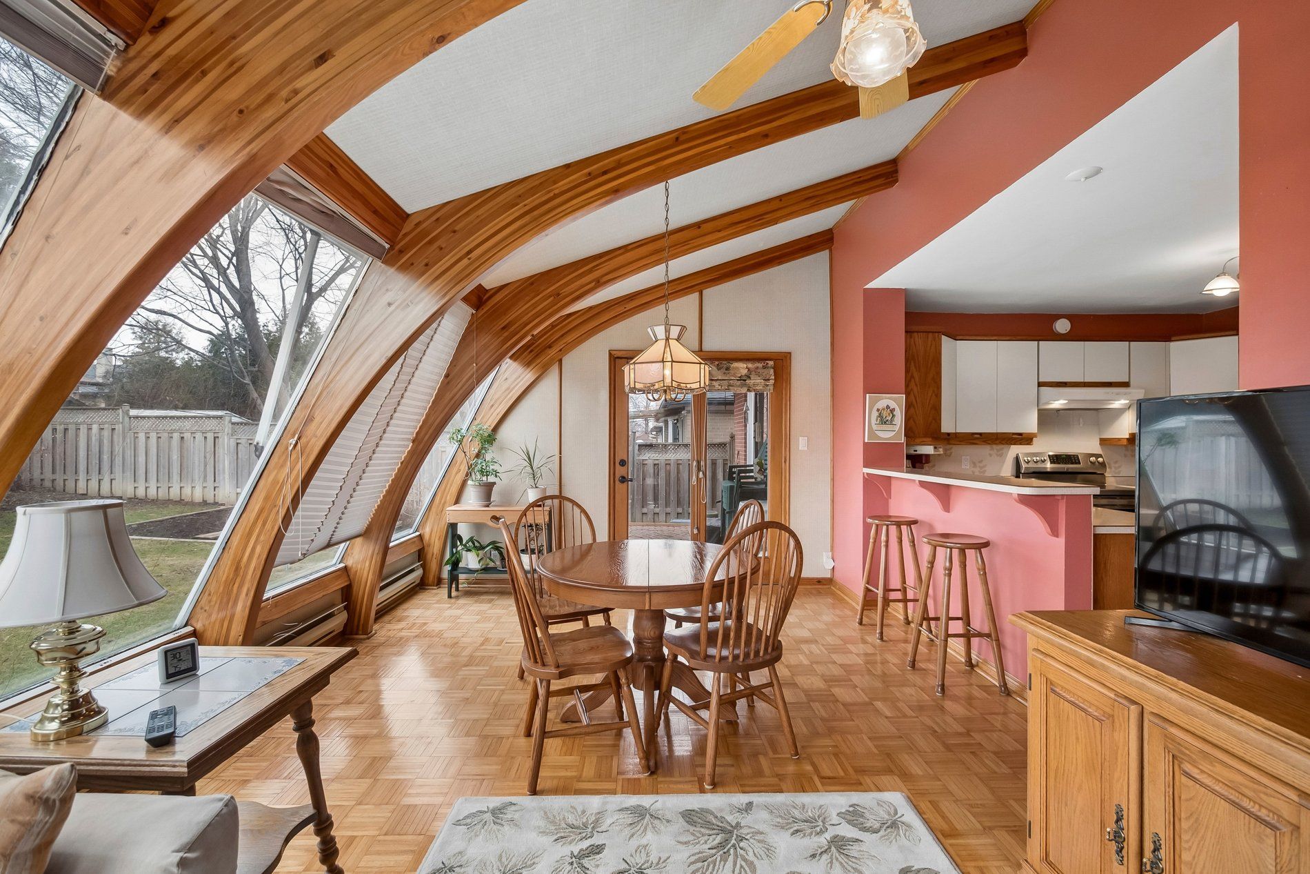 • Large living/dining room featuring a bay window and garden view.