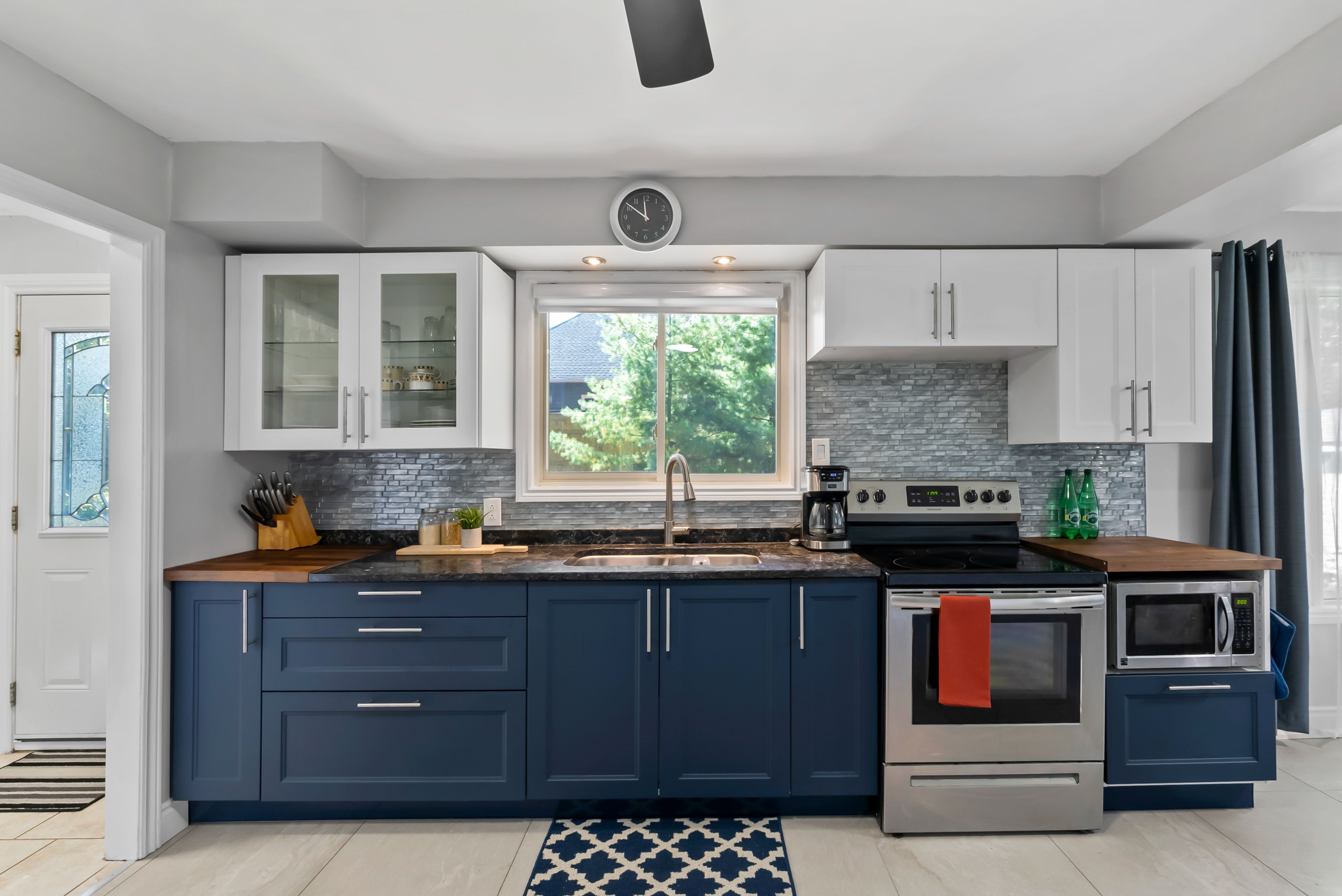 • Modern kitchen features granite countertops and fresh cabinets.