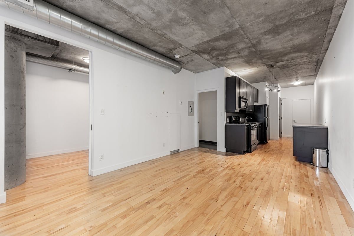 • Open-concept living with lofty concrete ceilings for a modern vibe.