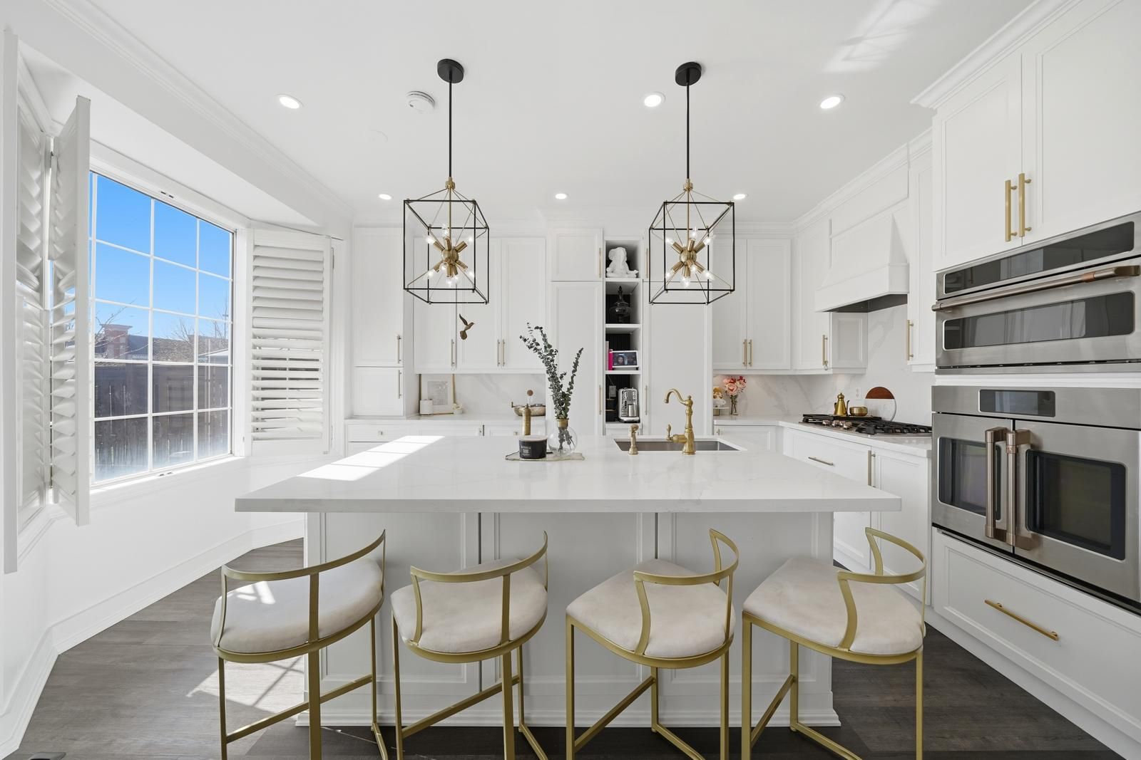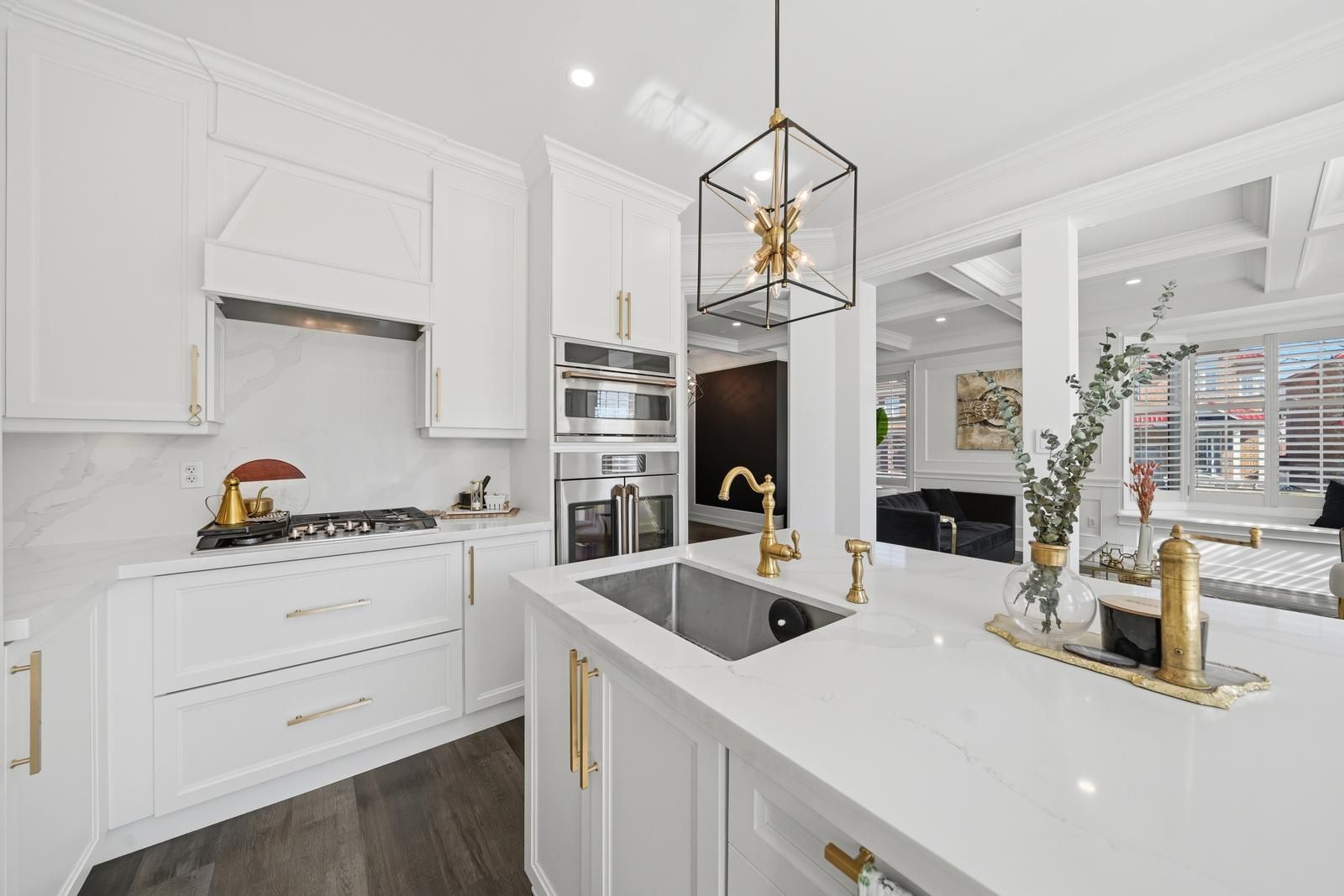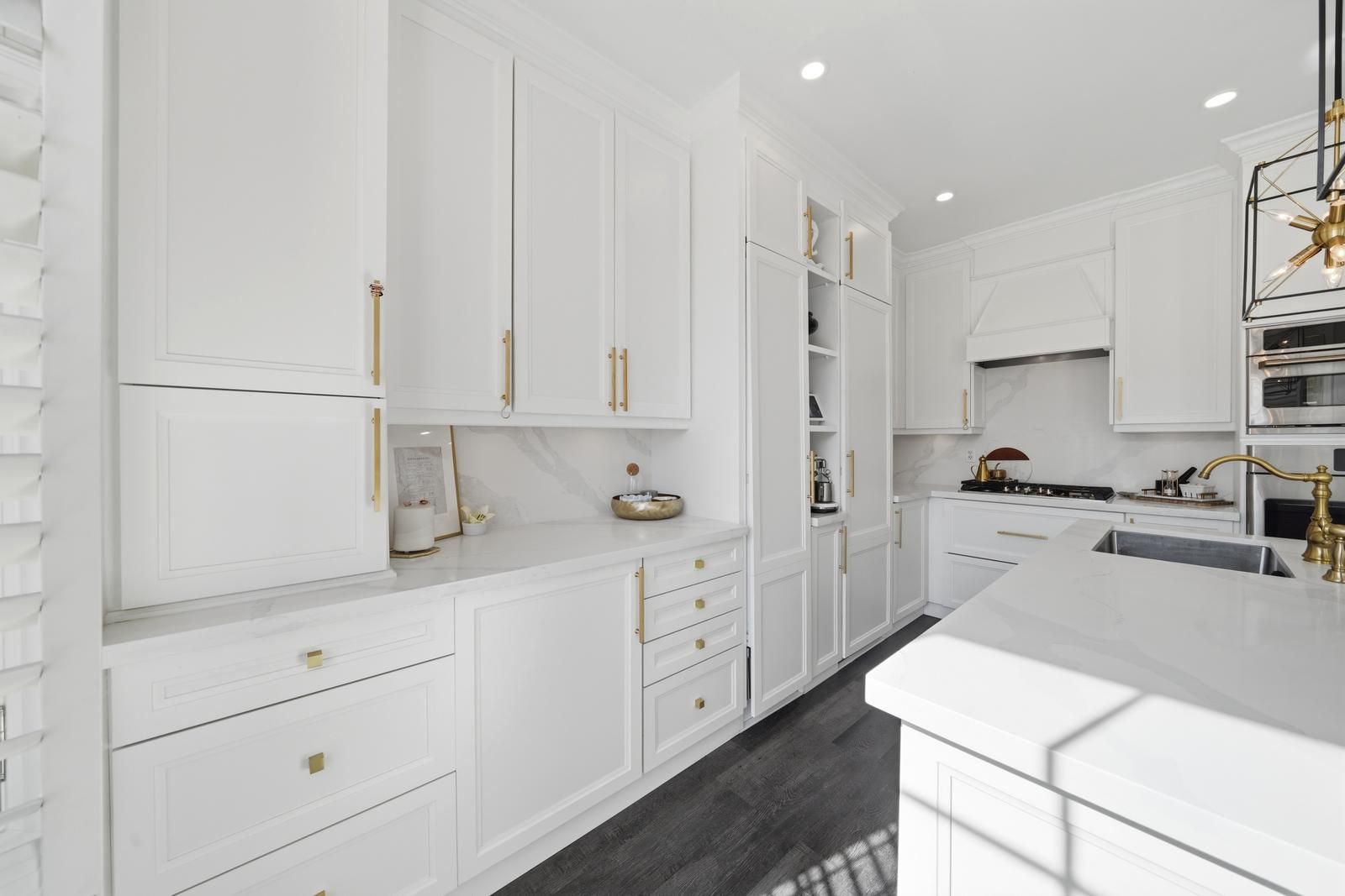 • Custom kitchen with built-in appliances and oversized island for entertaining.