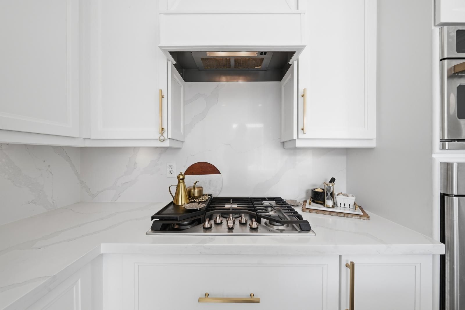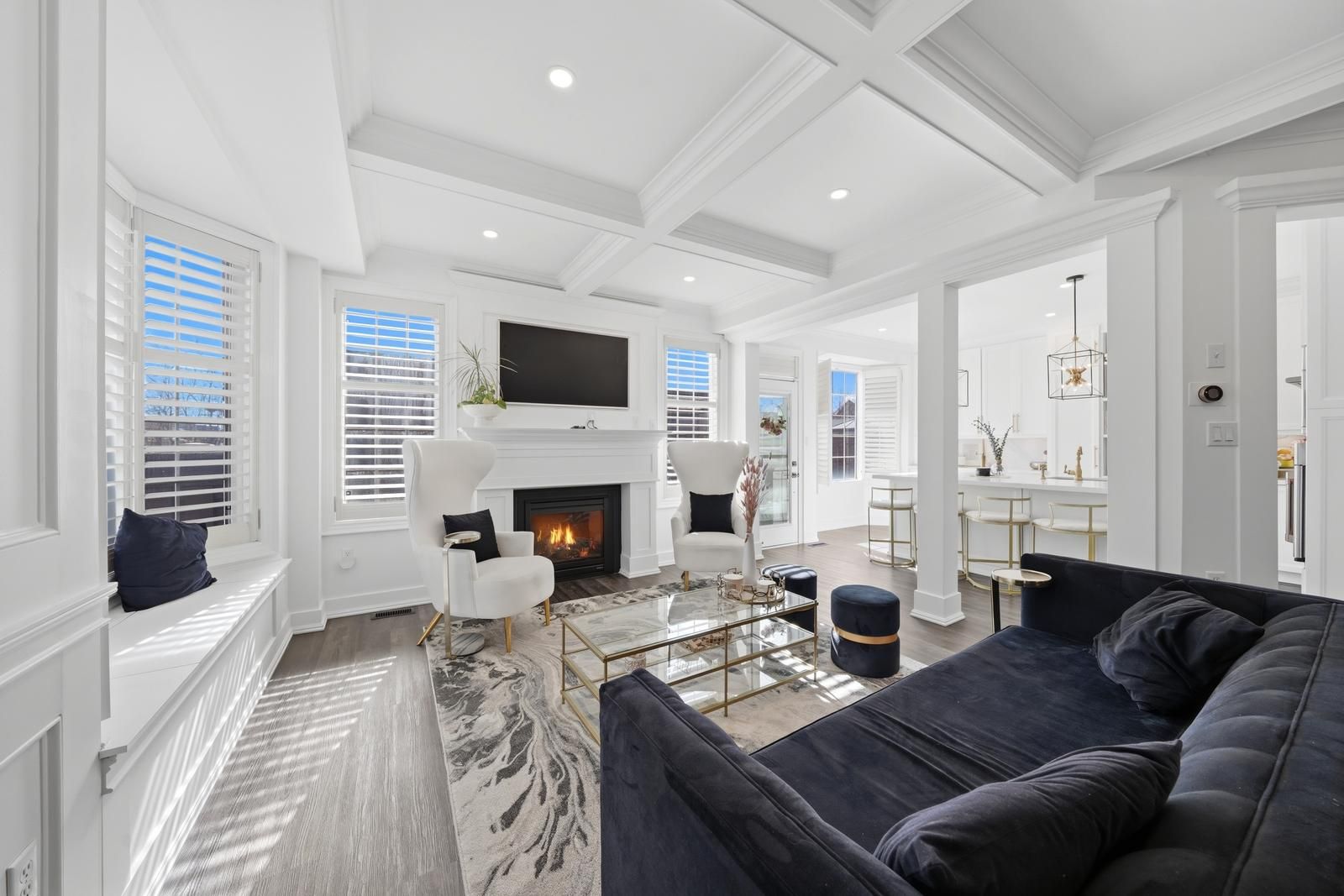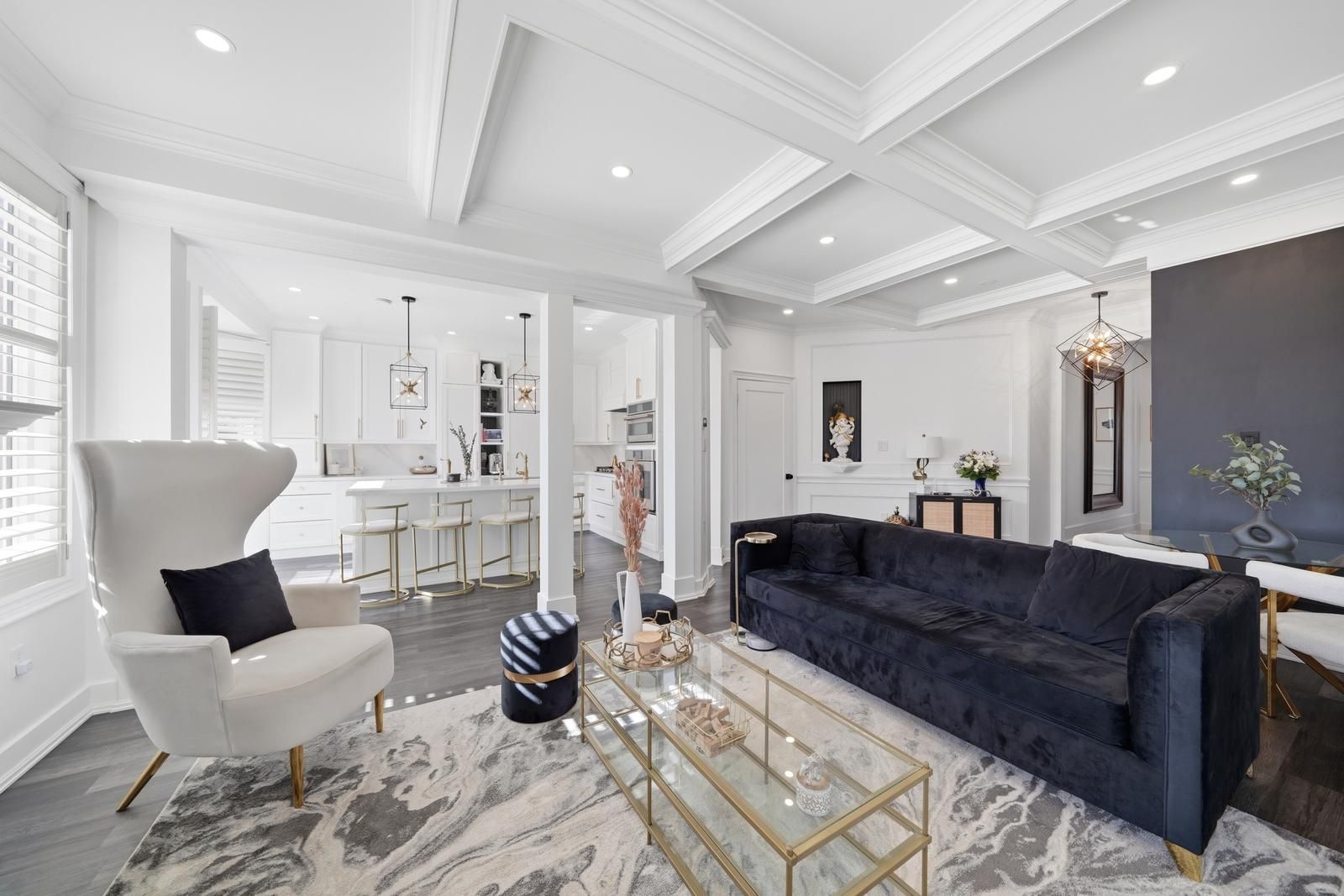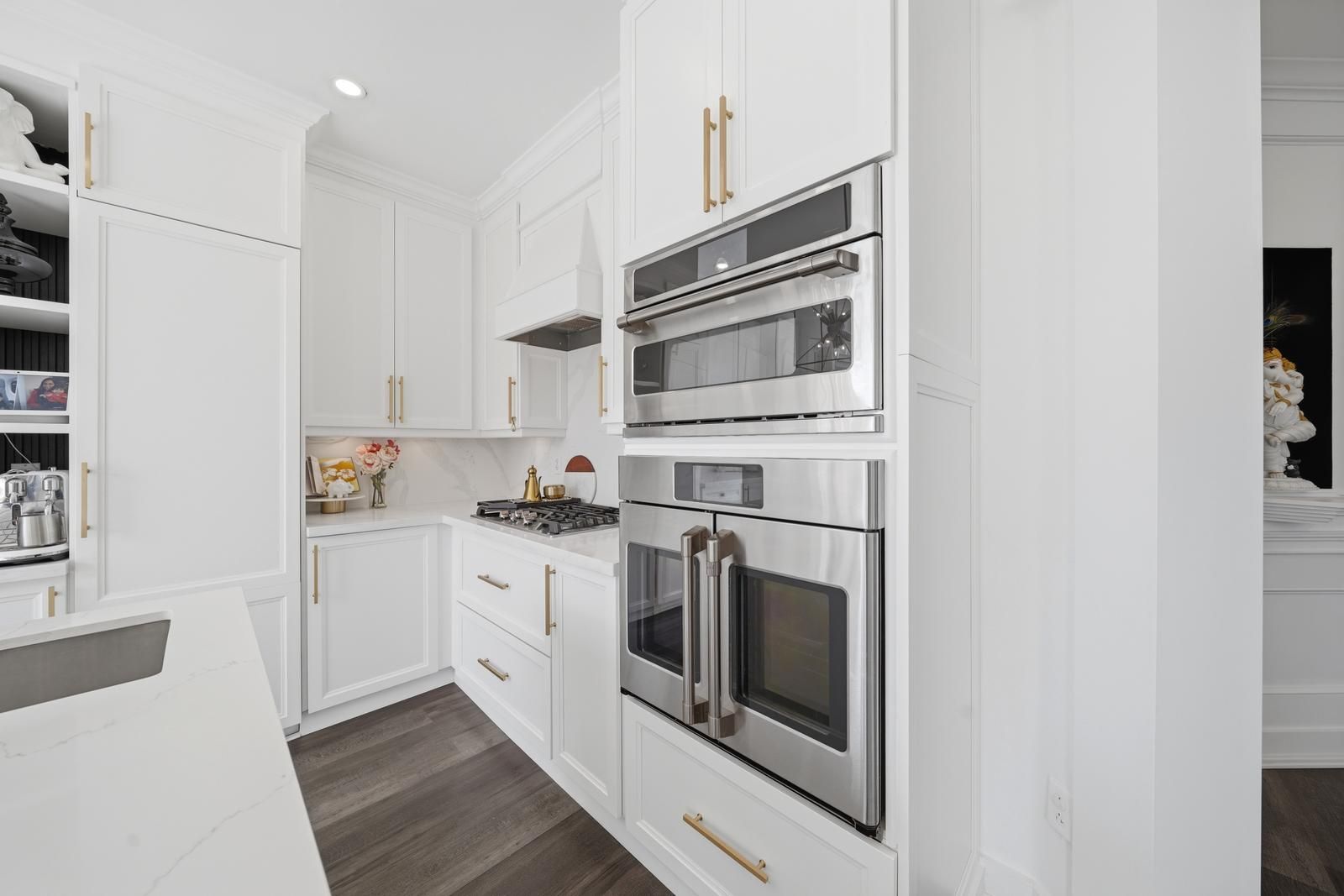 • Custom kitchen with built-in appliances and oversized island for entertaining.