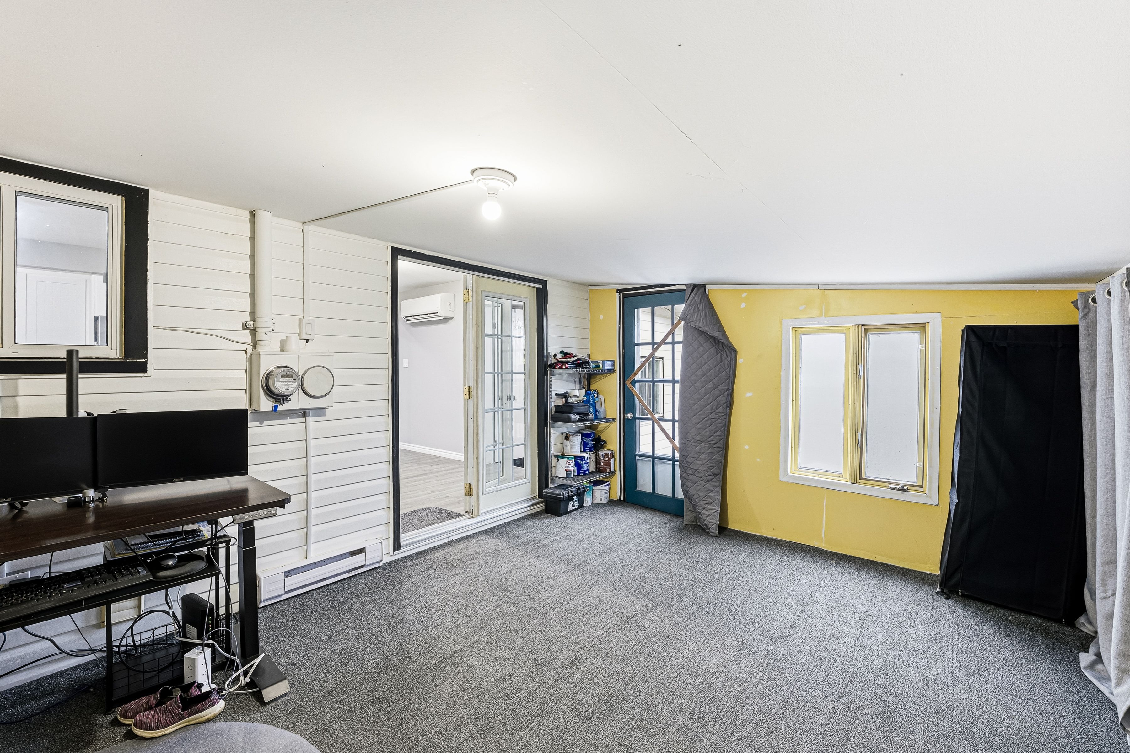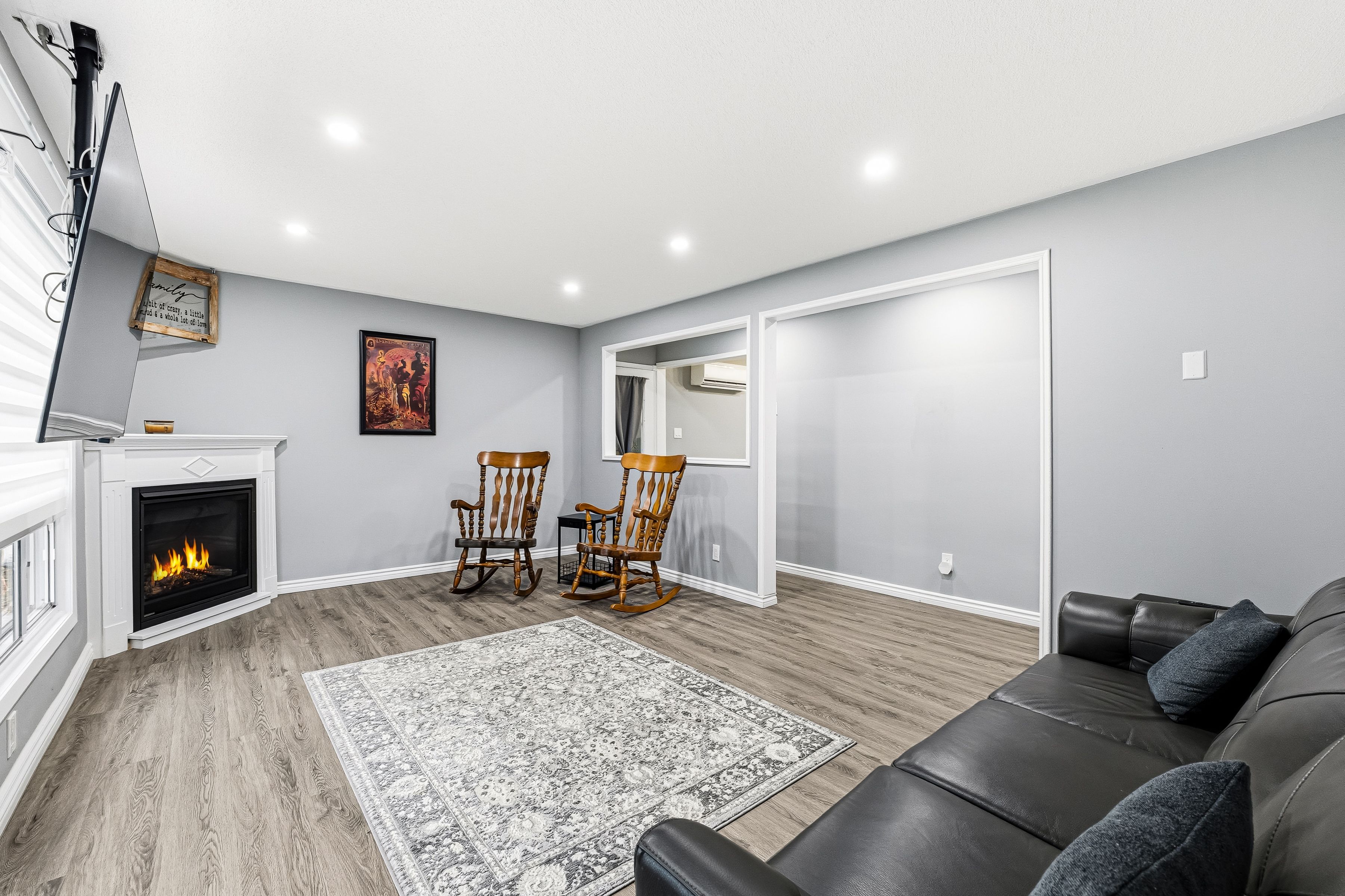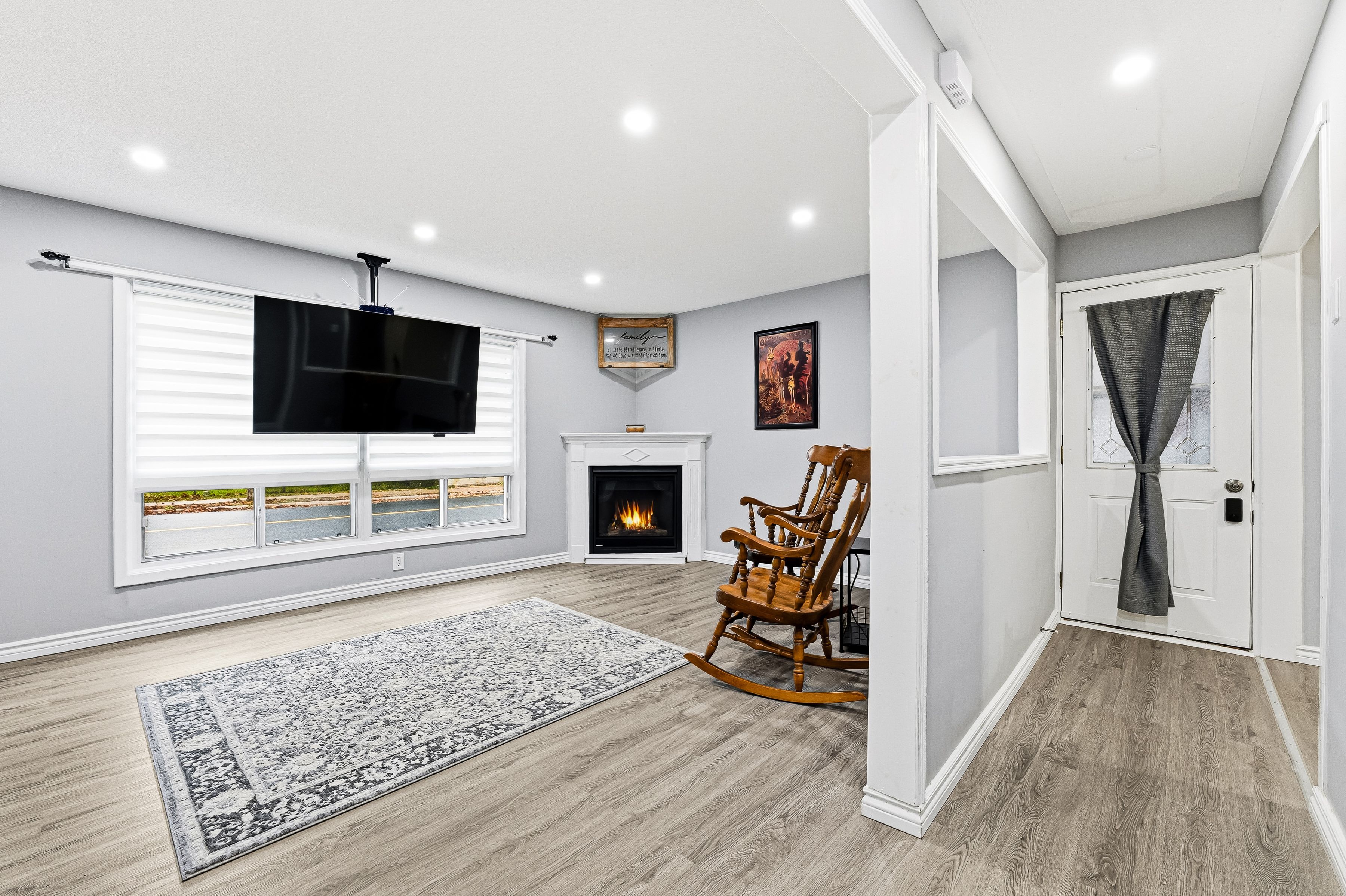 • Bright living room with large windows and cozy fireplace for relaxation.