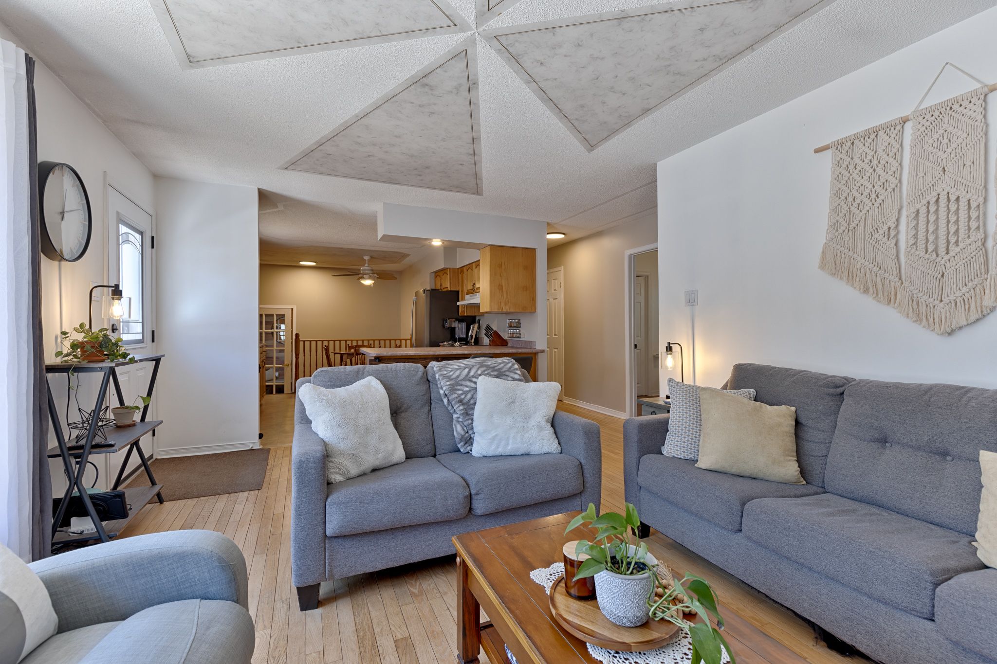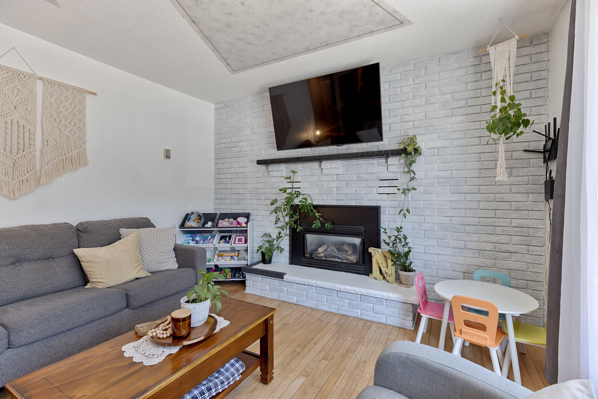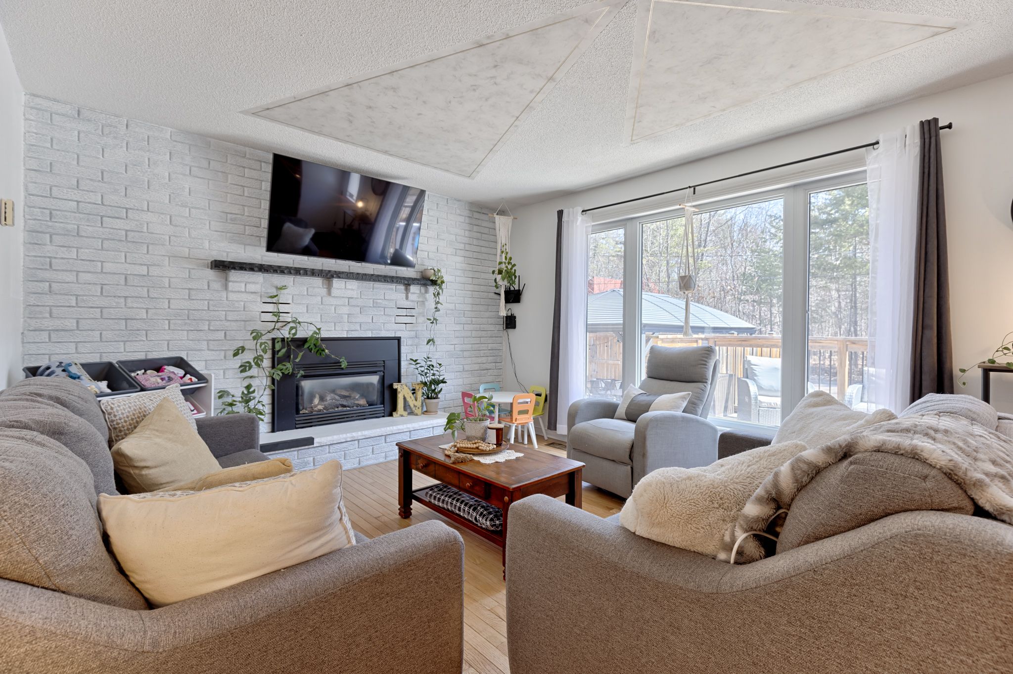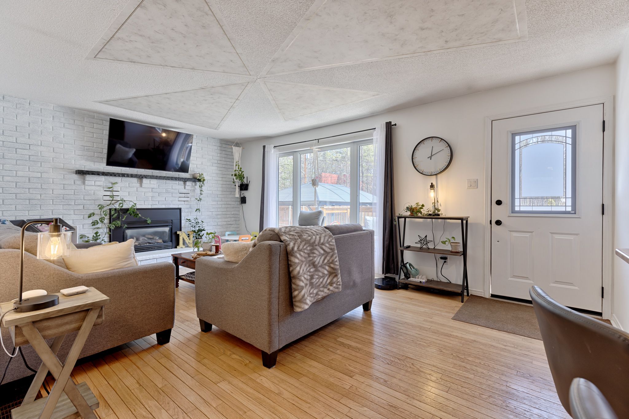 • Bright living room with refinished hardwood floors and a cozy gas fireplace.