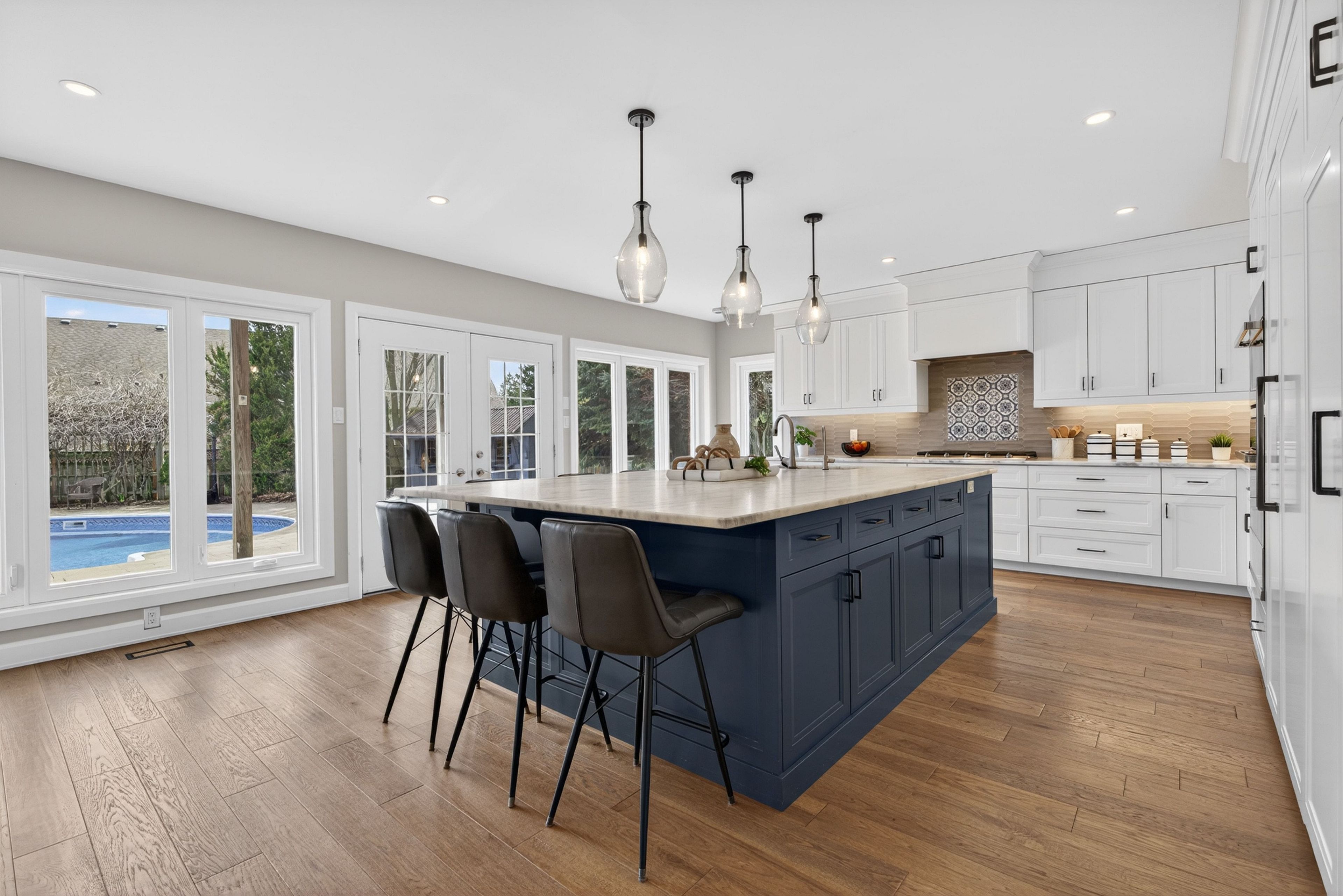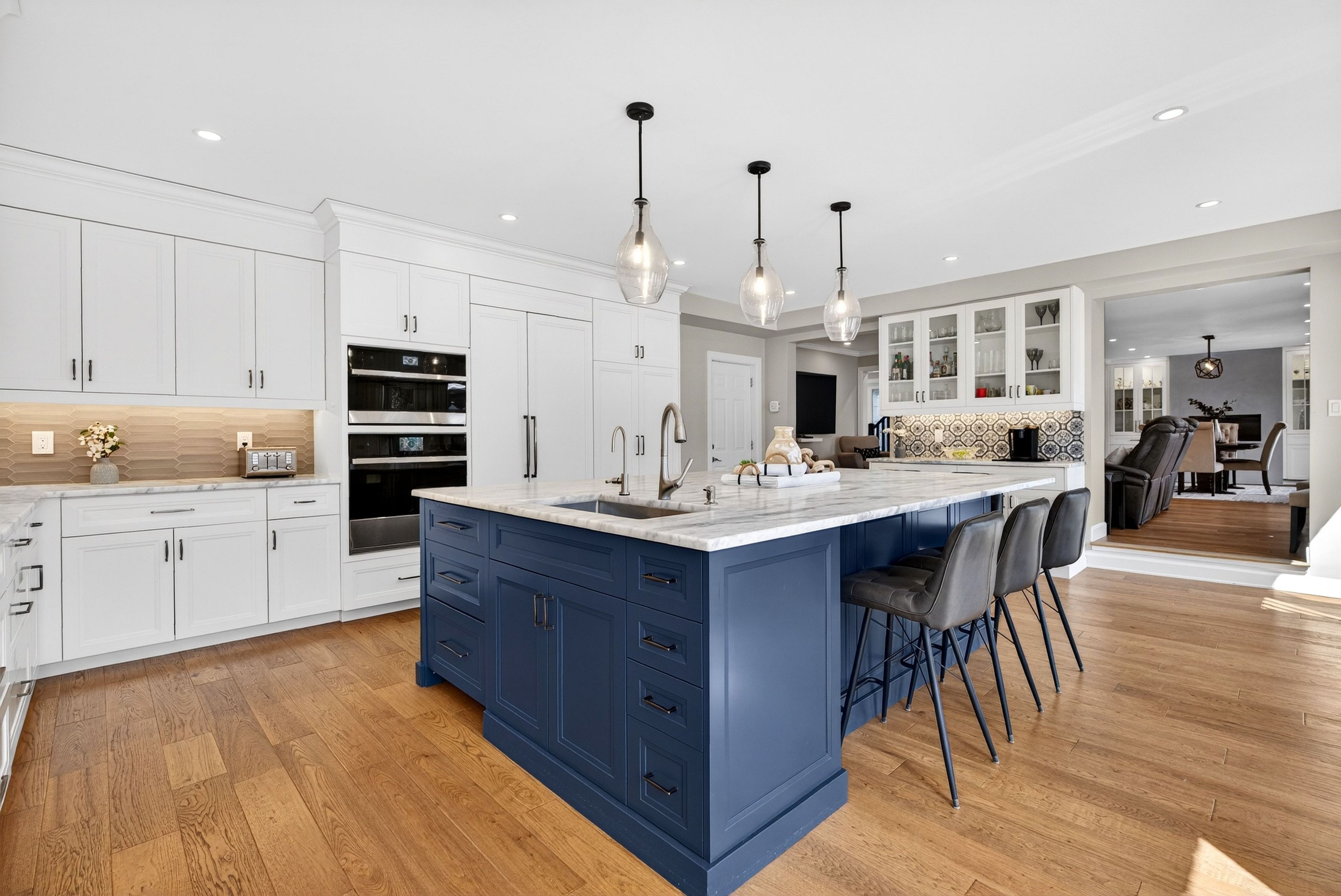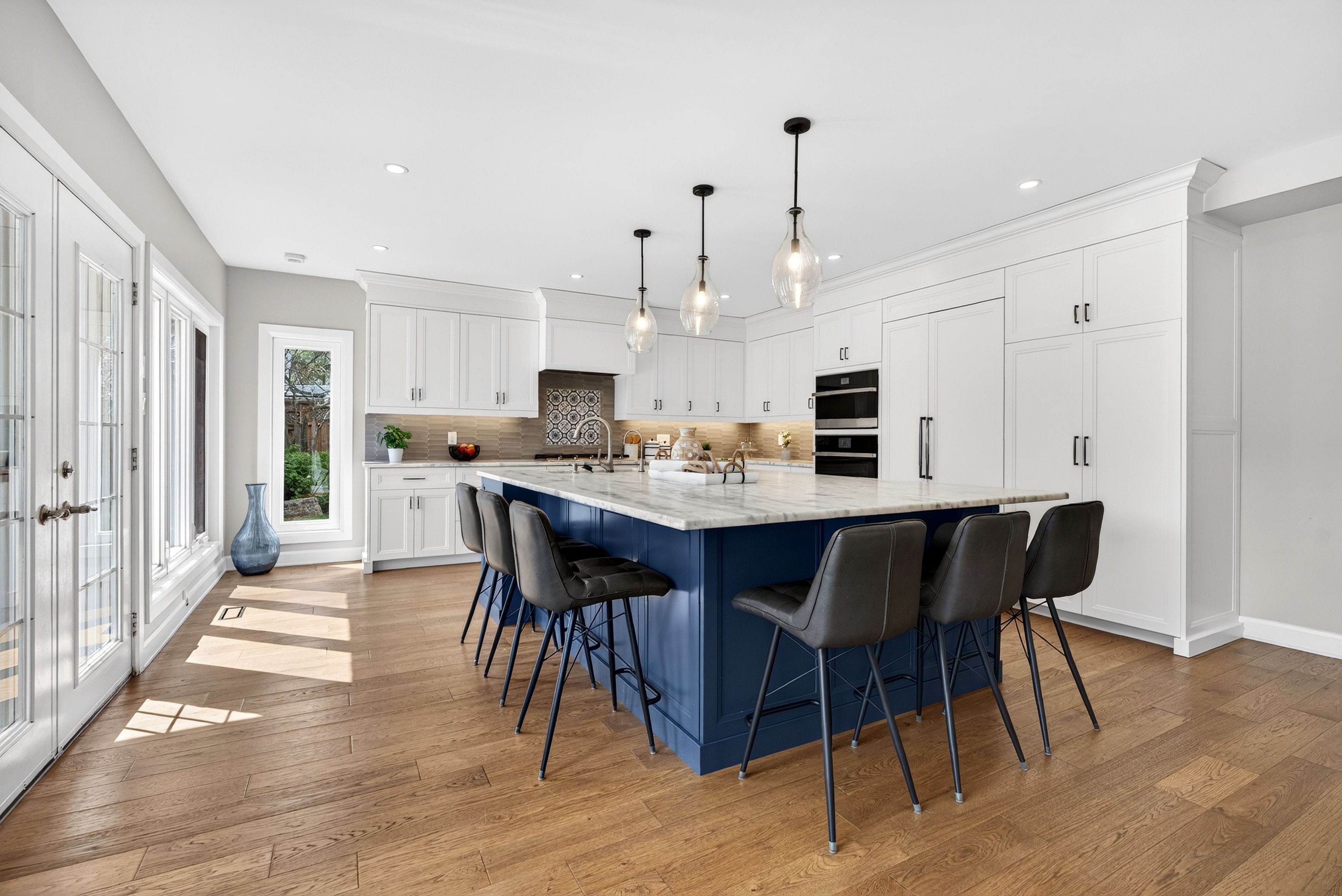 • Custom kitchen with quartz countertops and large center island for gatherings.