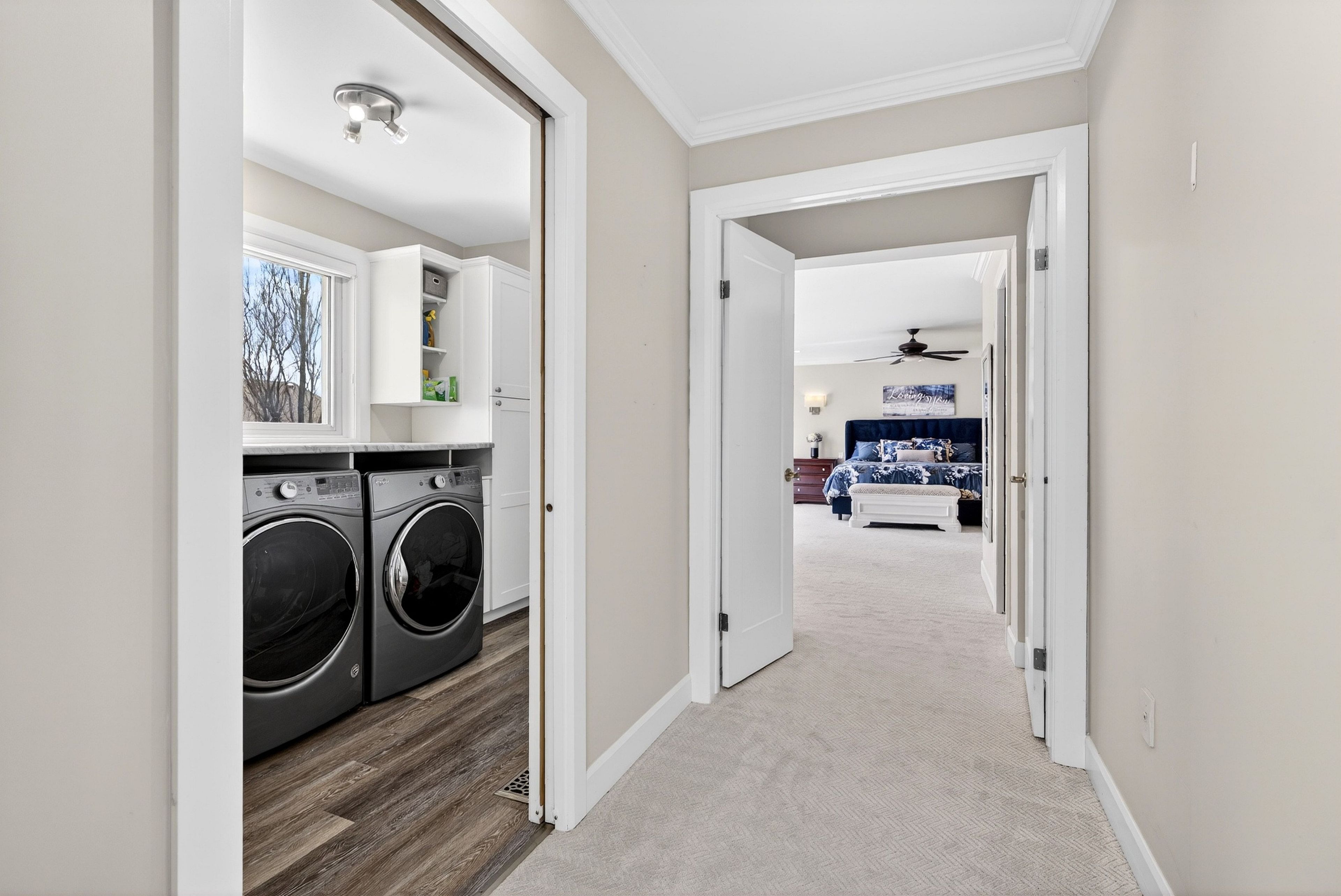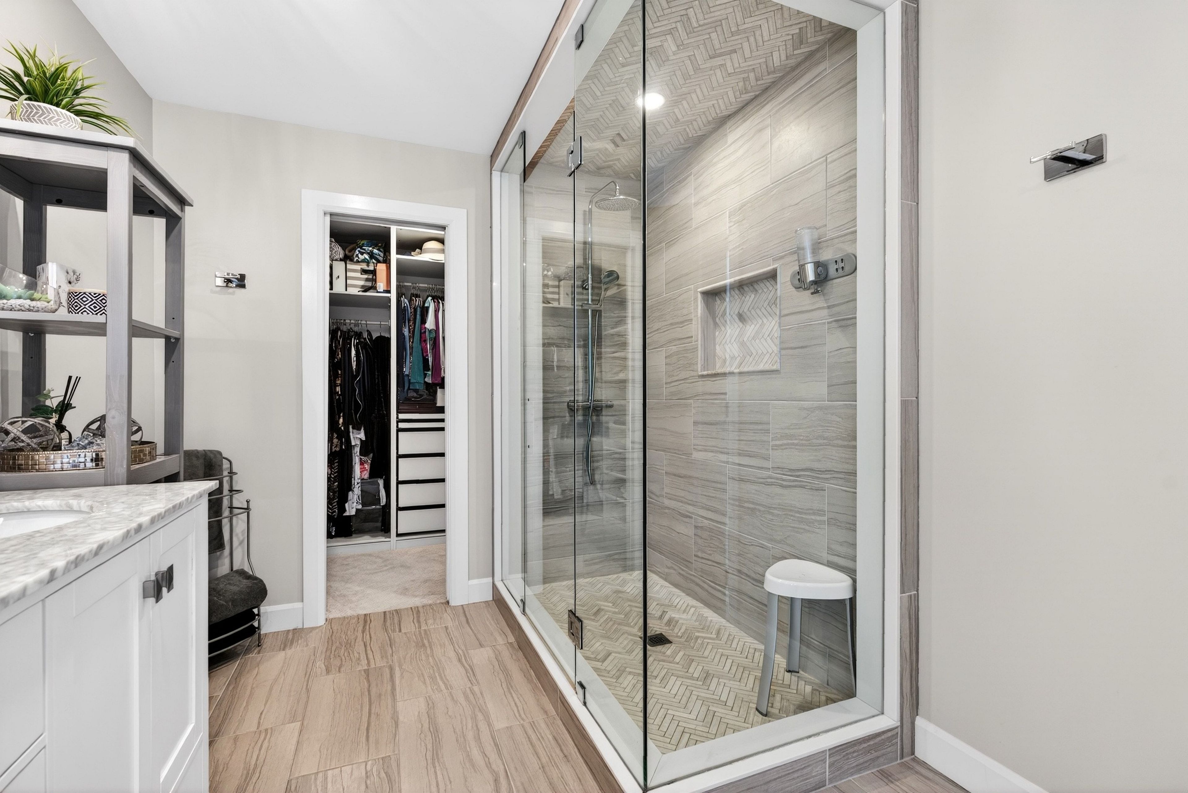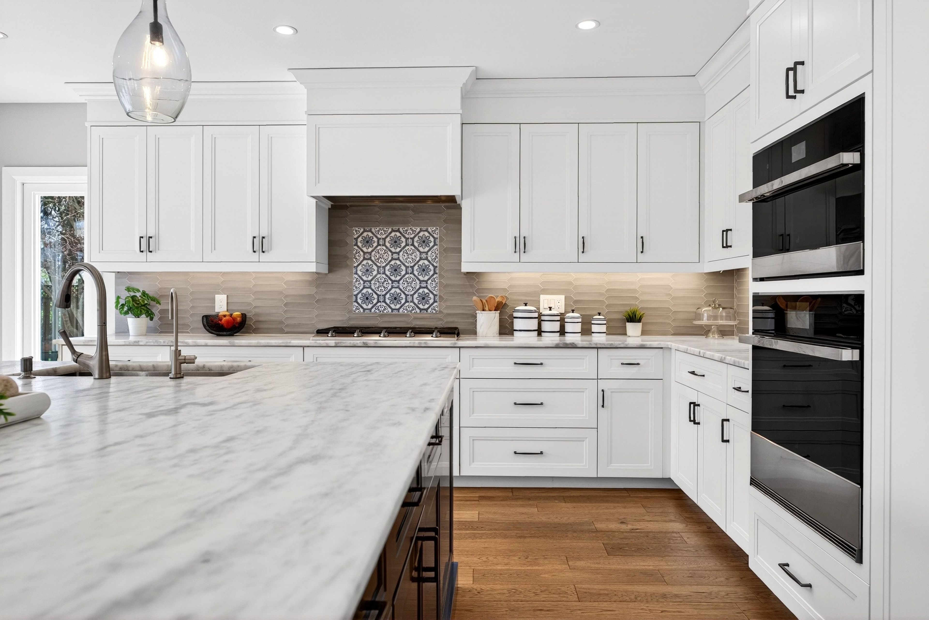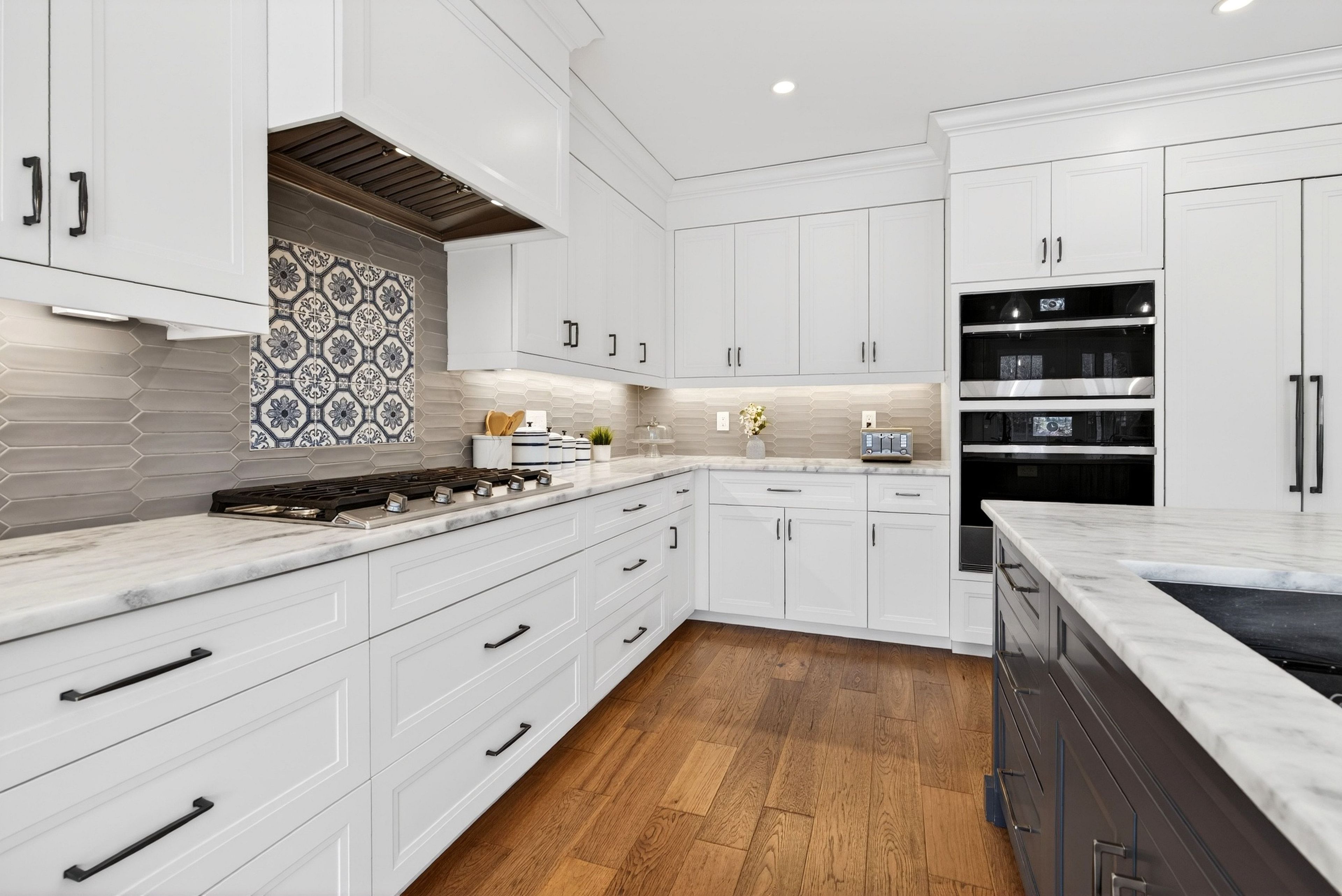 • Custom kitchen with quartz countertops and large center island for gatherings.