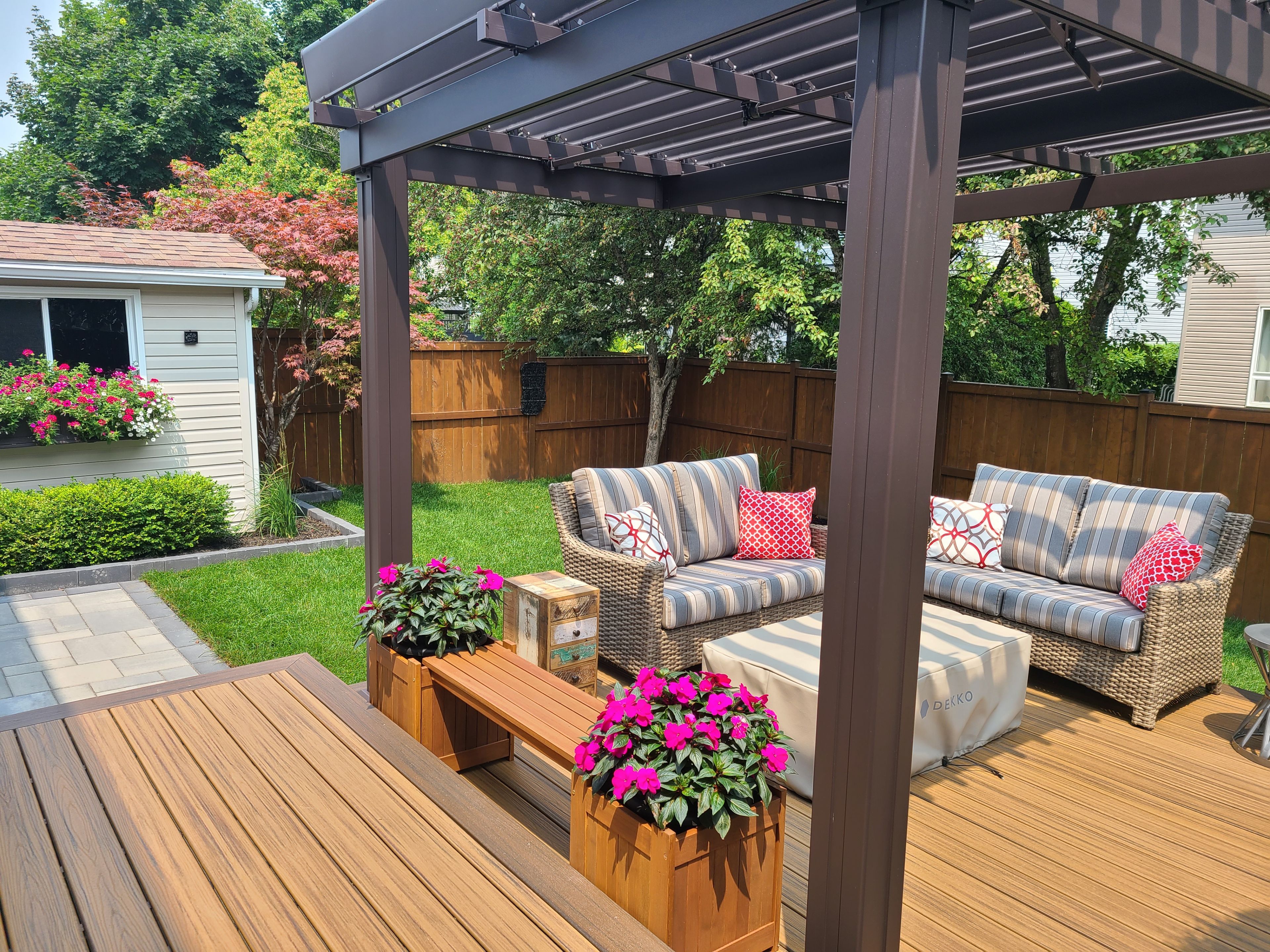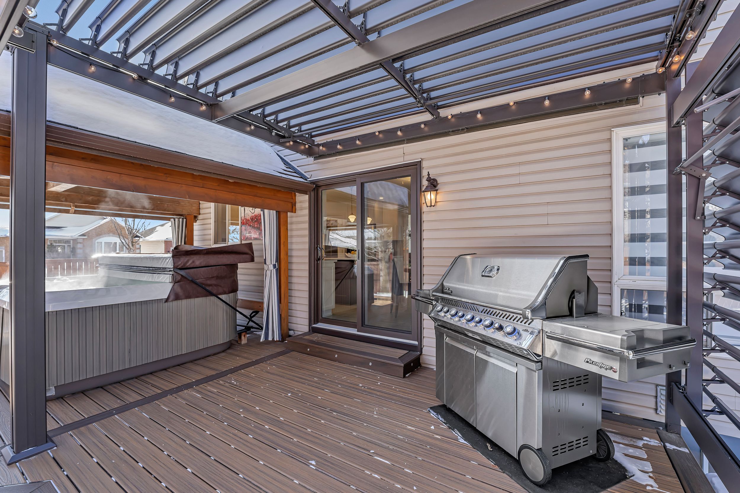 • Private backyard oasis with a Trex deck, hot tub, and gas fireplace.