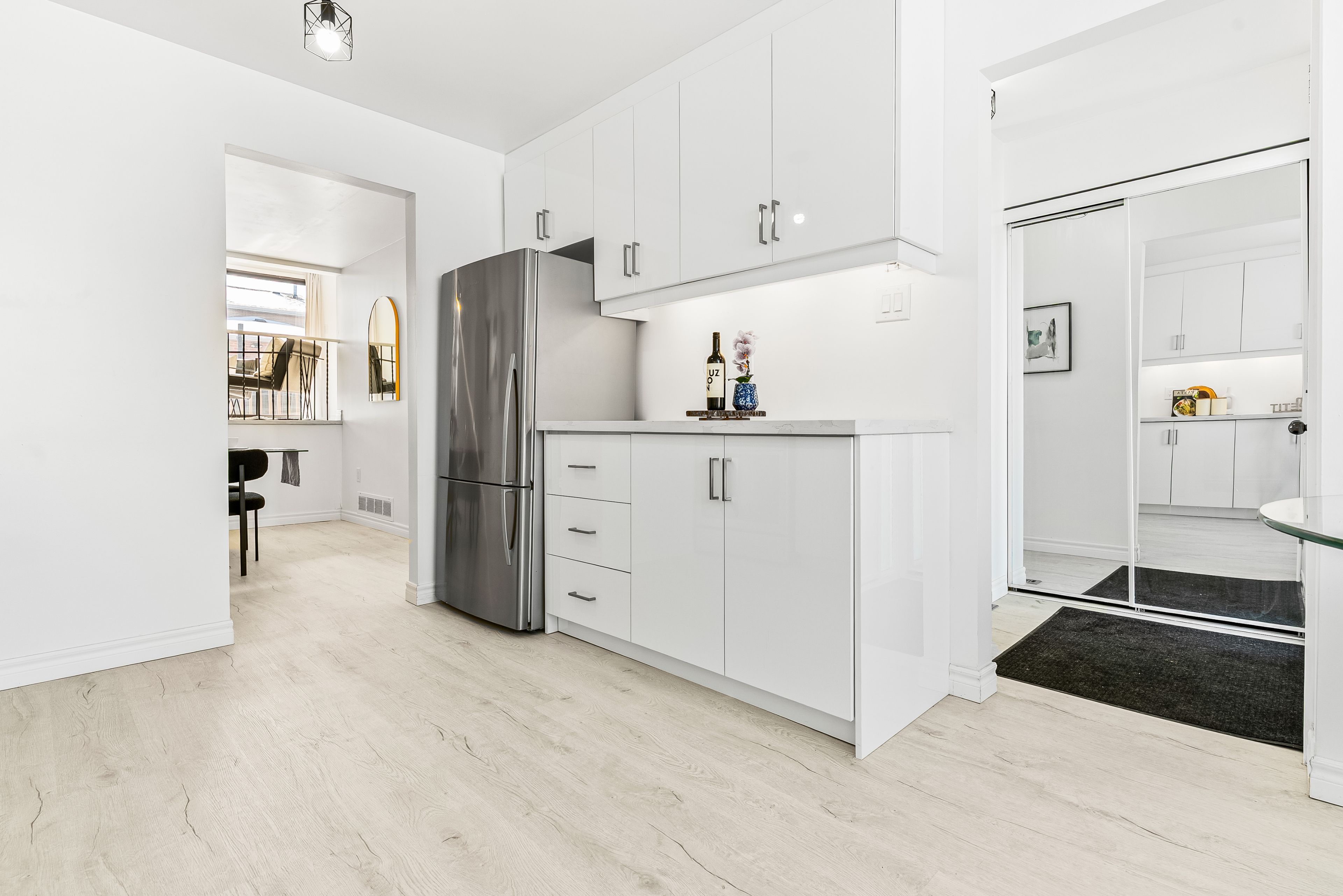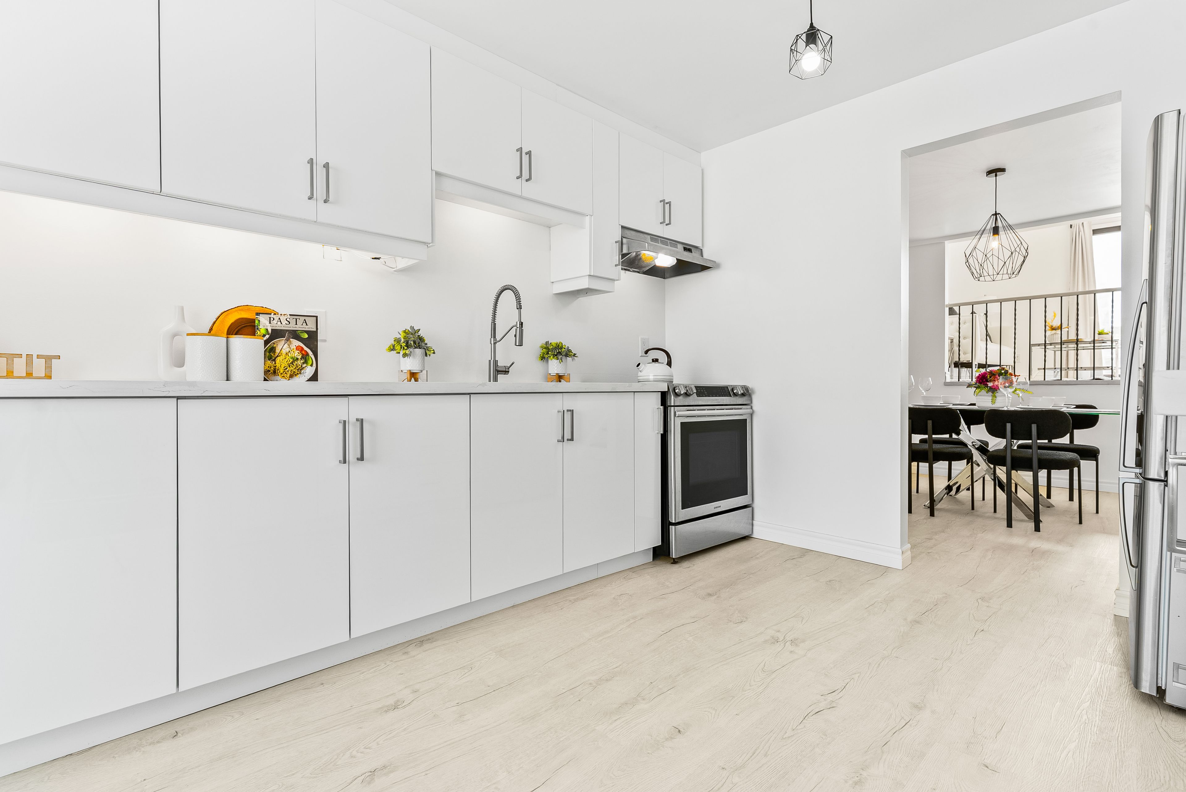 • State-of-the-art kitchen with quartz countertops and stainless steel appliances.