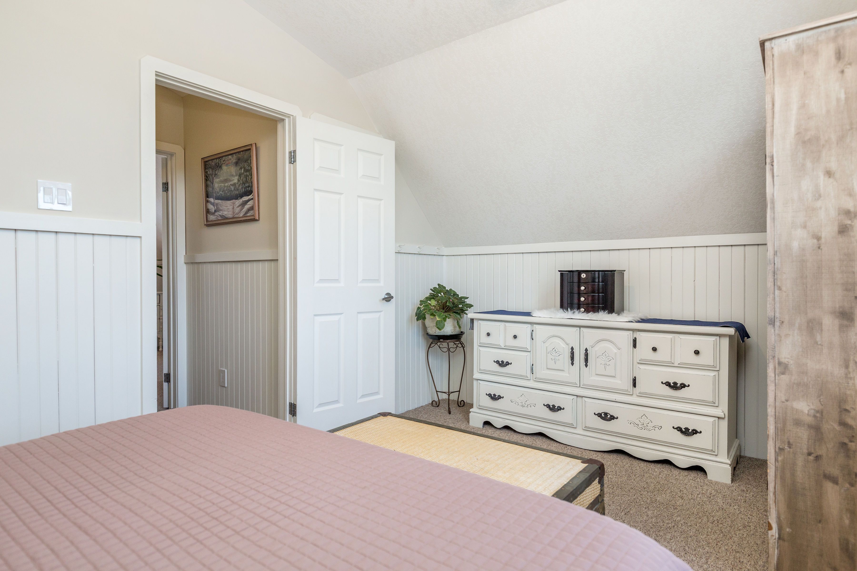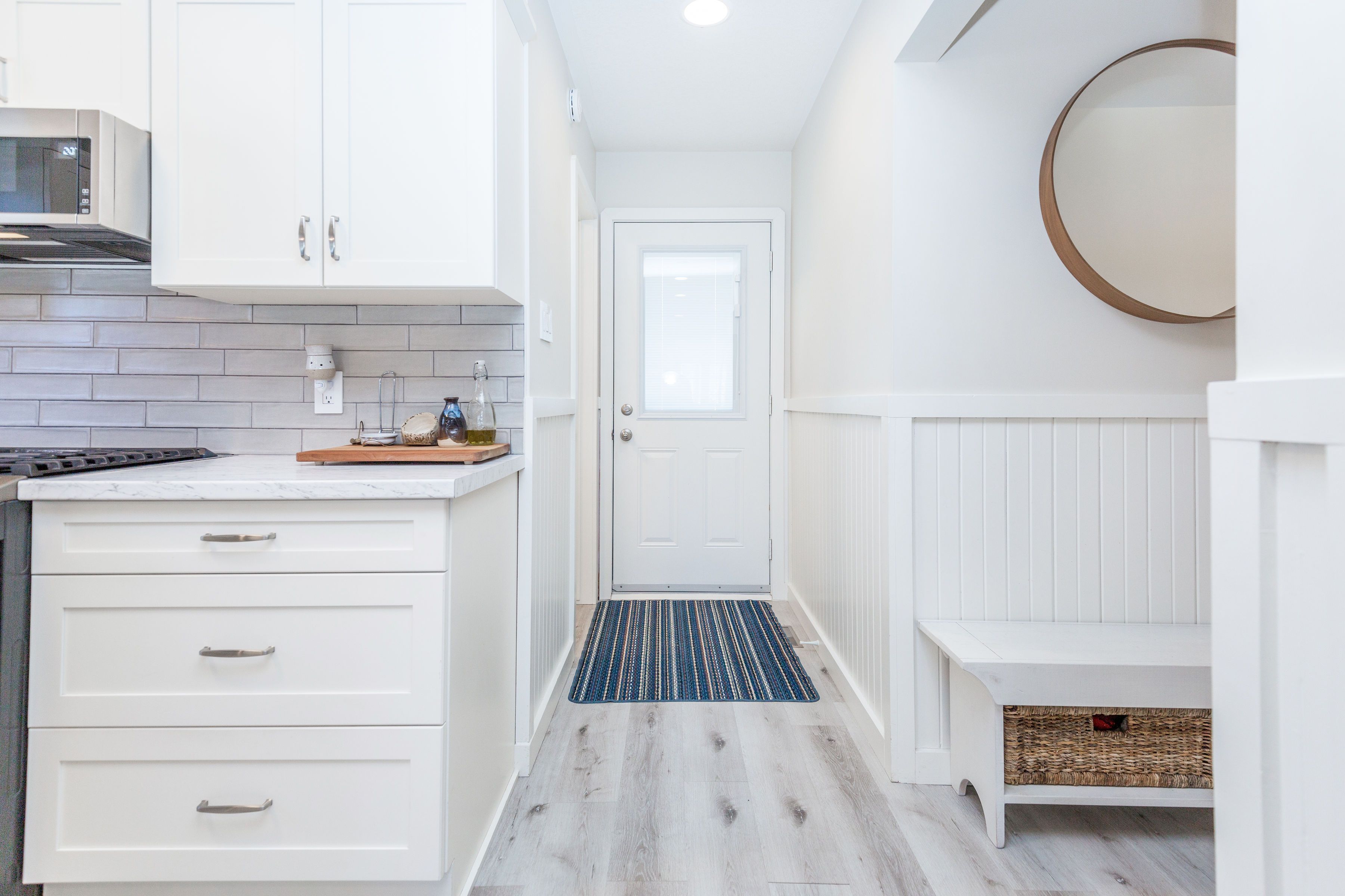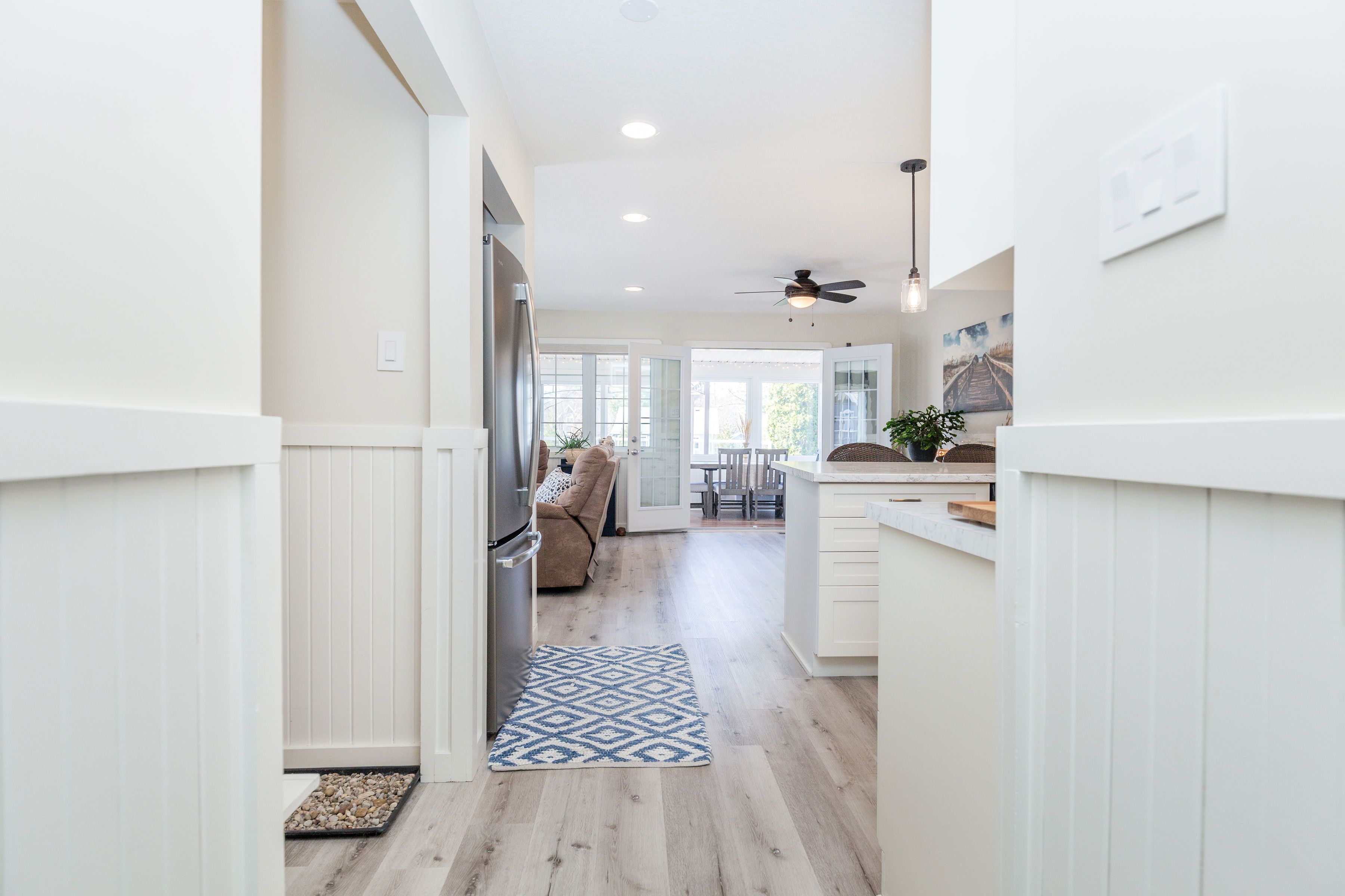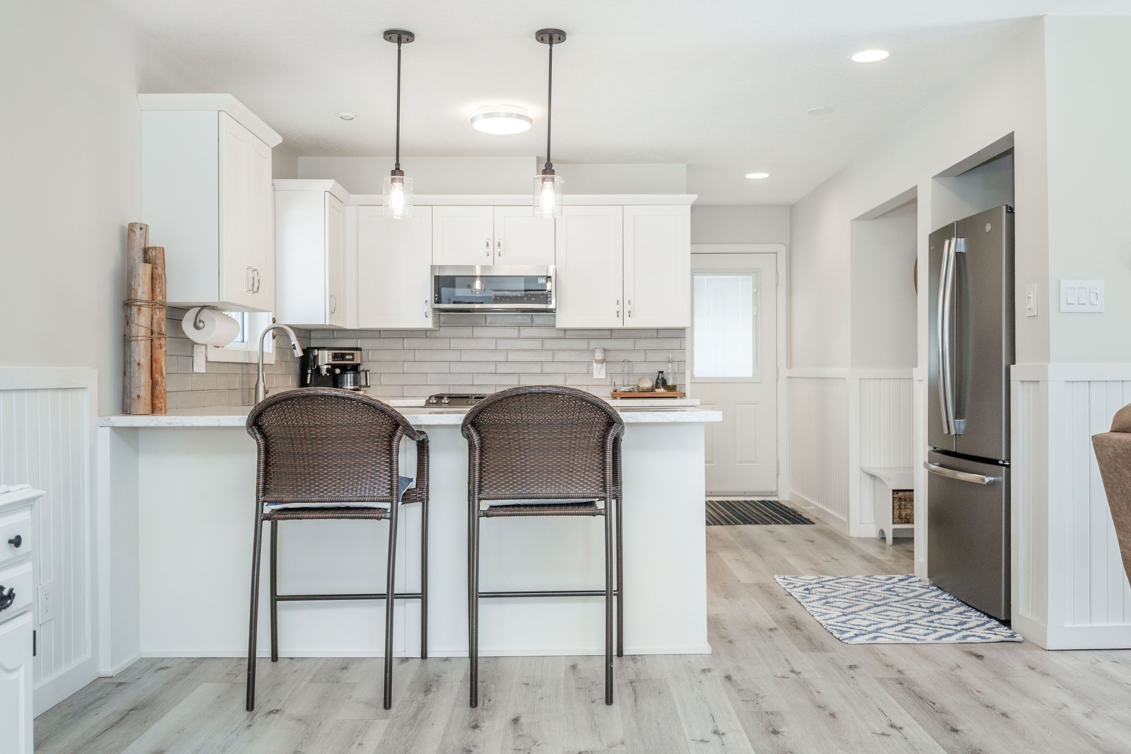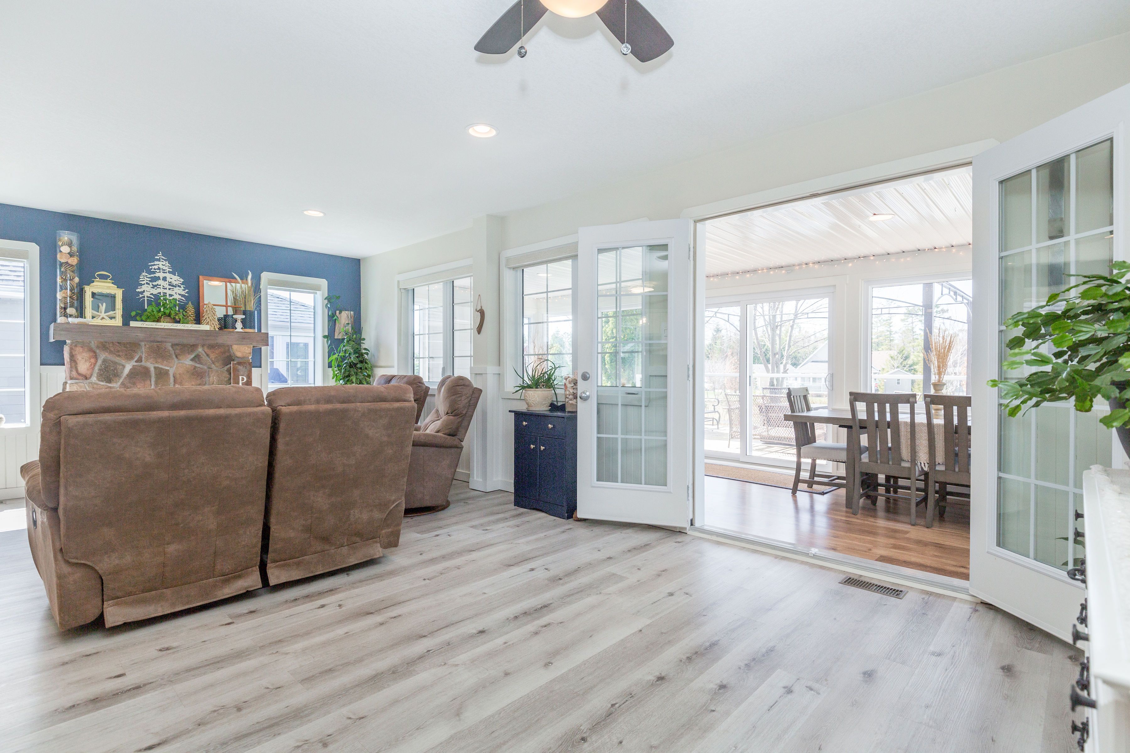 • Bright open layout with large windows and warm finishes throughout.