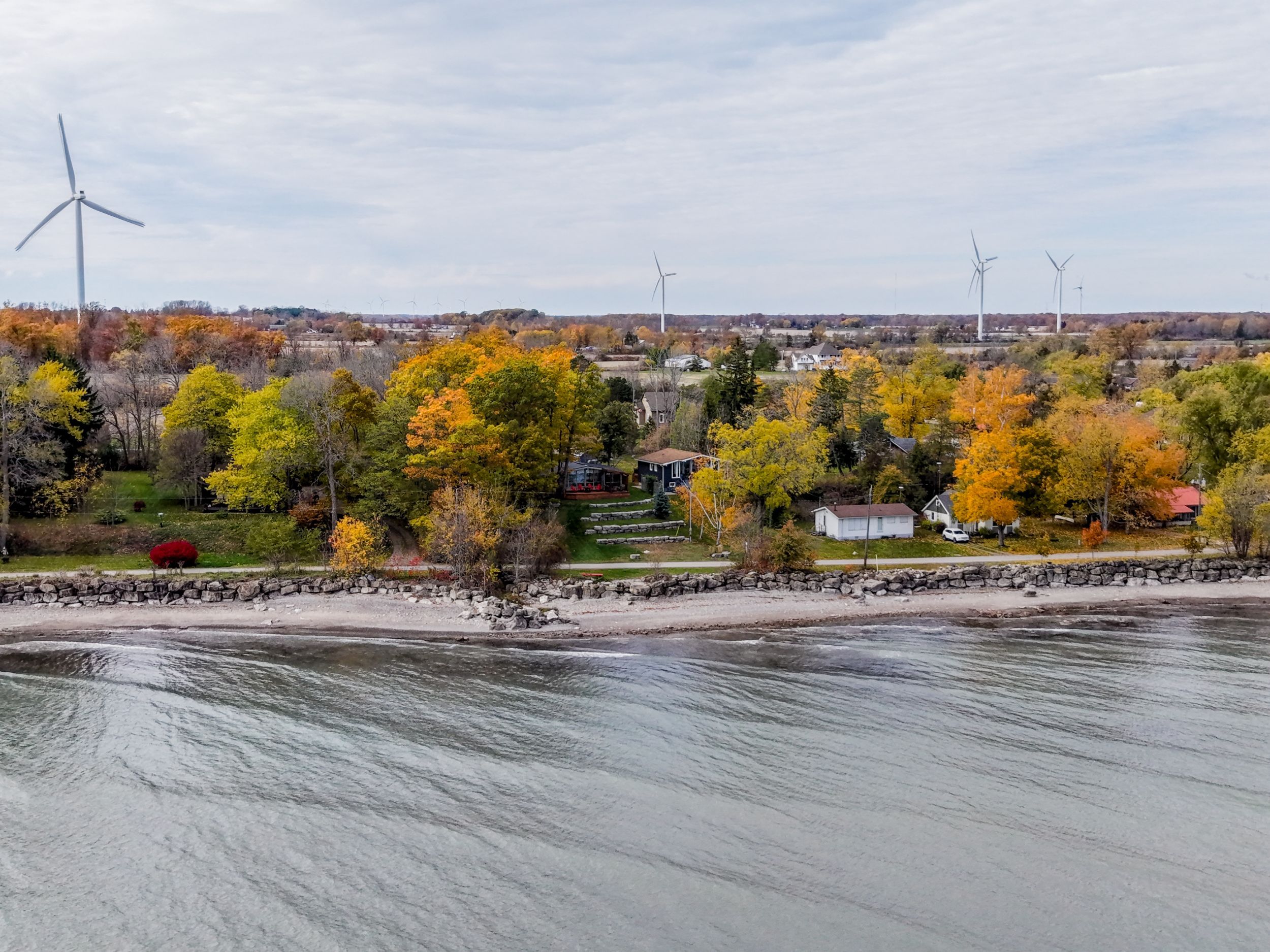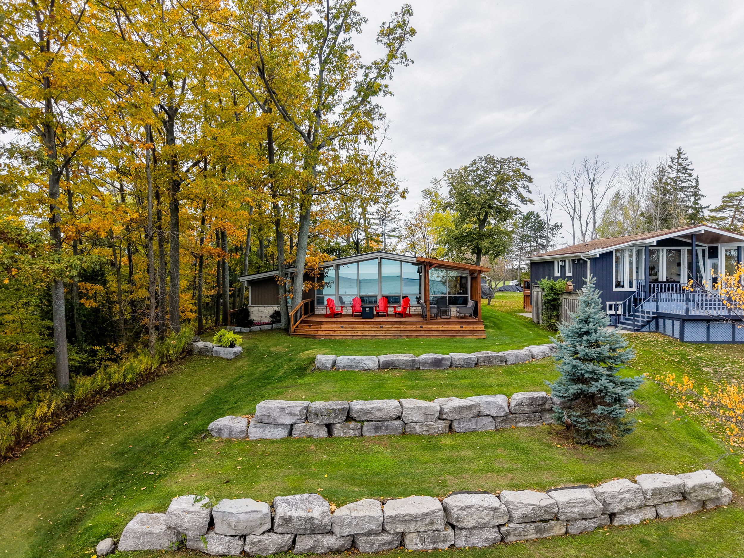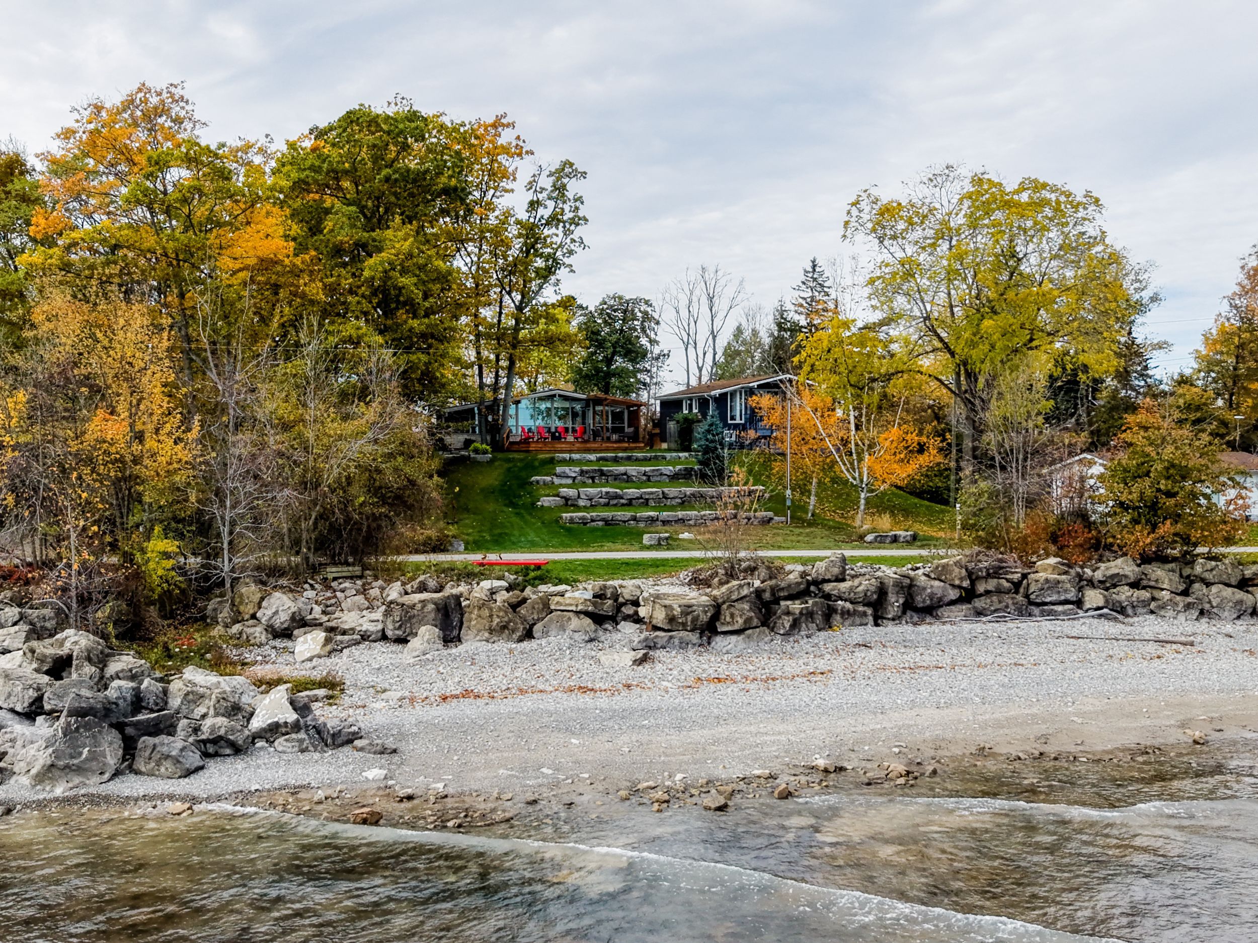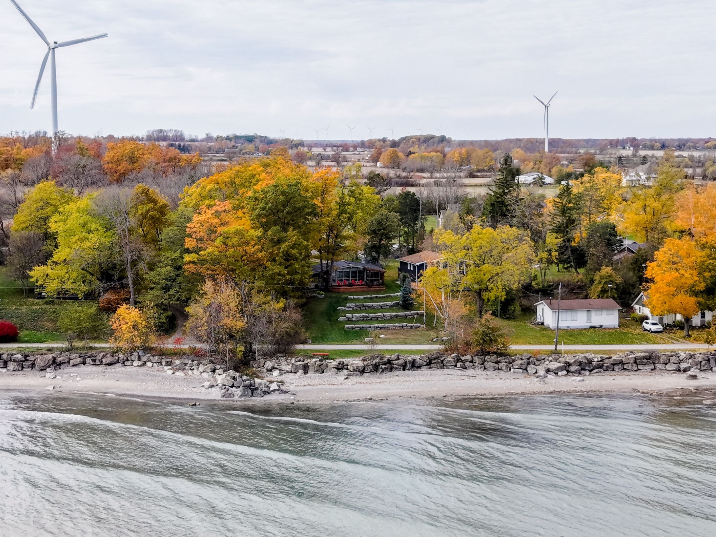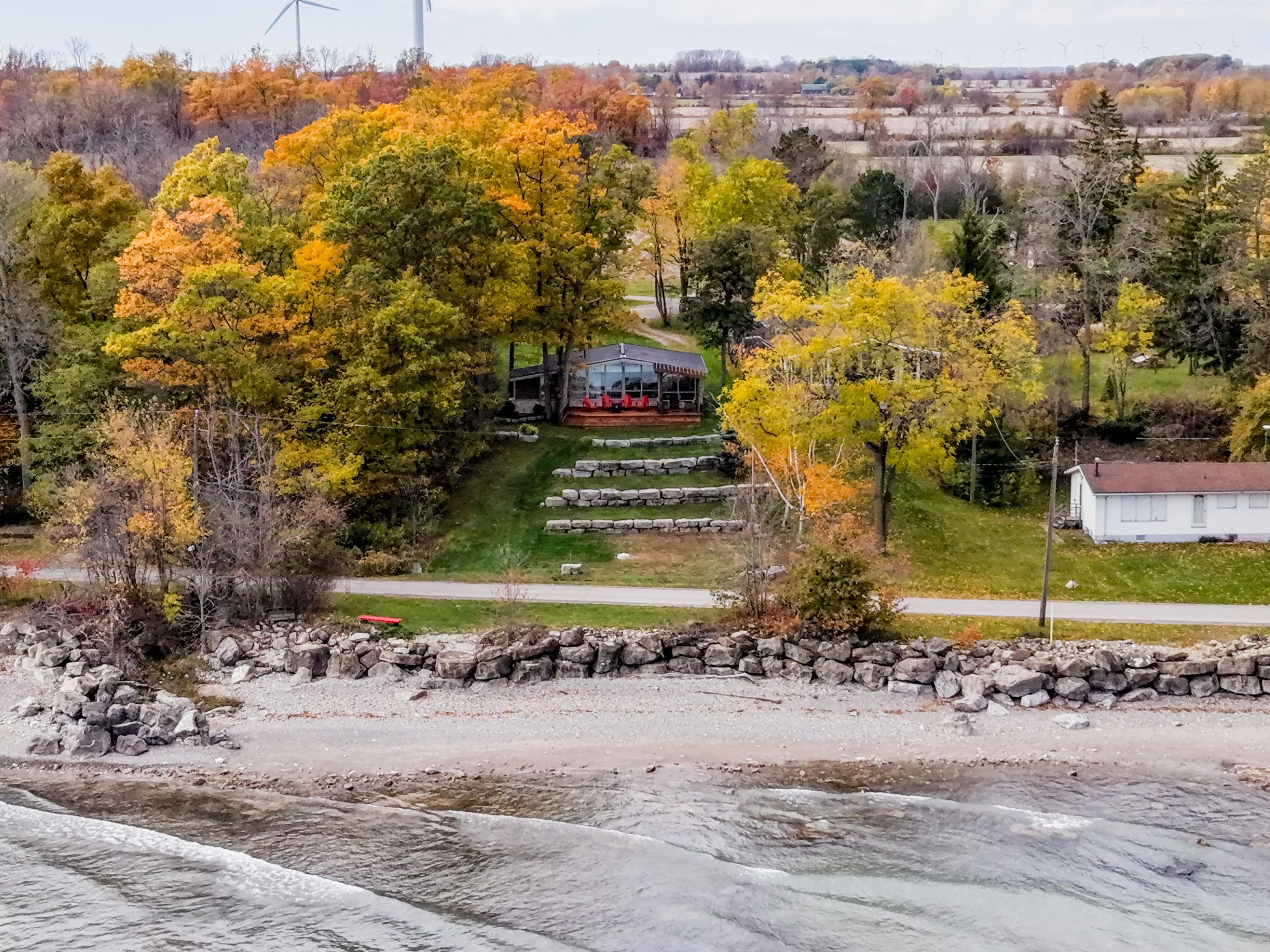 Tucked along a peaceful stretch of lowbanks shoreline between two quiet roads with no through traffic, this beautifully updated lakeside cottage sits on over half an acre and offers stunning panoramic views of lake erie - the perfect year-round retreat for families & friends to relax and reconnect with nature. Inside, the cottage has been thoughtfully refreshed with crisp white finishes complemented by warm natural elements such as wood ceilings and a stone fireplace; creating a bright yet cozy lakeside atmosphere. The open-concept living and dining area is flooded with natural light from a spectacular window wall overlooking the lake, while the gas fireplace adds warmth and charm on cooler evenings. 3 bedrooms and a 4-pc bathroom complete the comfortable main-floor layout. Step outside through the patio door to the lakeside deck, where you can take in sweeping water views & watch the waves roll in. The armour stone terraced yard leads down toward the shoreline, creating a dramatic & beautifully landscaped approach to the lake. Just across mohawk point rd, another armour stone retaining wall frames a small grassy sitting area with a bench - the perfect place to enjoy sunrises, sunsets, and peaceful moments by the water. Below the rock wall lies the beach & lake erie itself, where you can launch paddleboards and kayaks, swim, or simply play along the shoreline before heading back to the cottage for lunch or an afternoon nap. Evenings are made for bonfires, star-filled skies, and time with family & friends. Accessed via kimber rd, the driveway leads to the rear of the property where you'll find a second deck, patio dining/bbq area, and a large storage shed for kayaks, etc, all set within the expansive tree-lined backyard that provides privacy & plenty of space to relax or play. Whether you're looking for a weekend escape, family cottage, or peaceful lakeside retreat, this property offers the sights, sounds & simple pleasures that make life on lake erie so special.