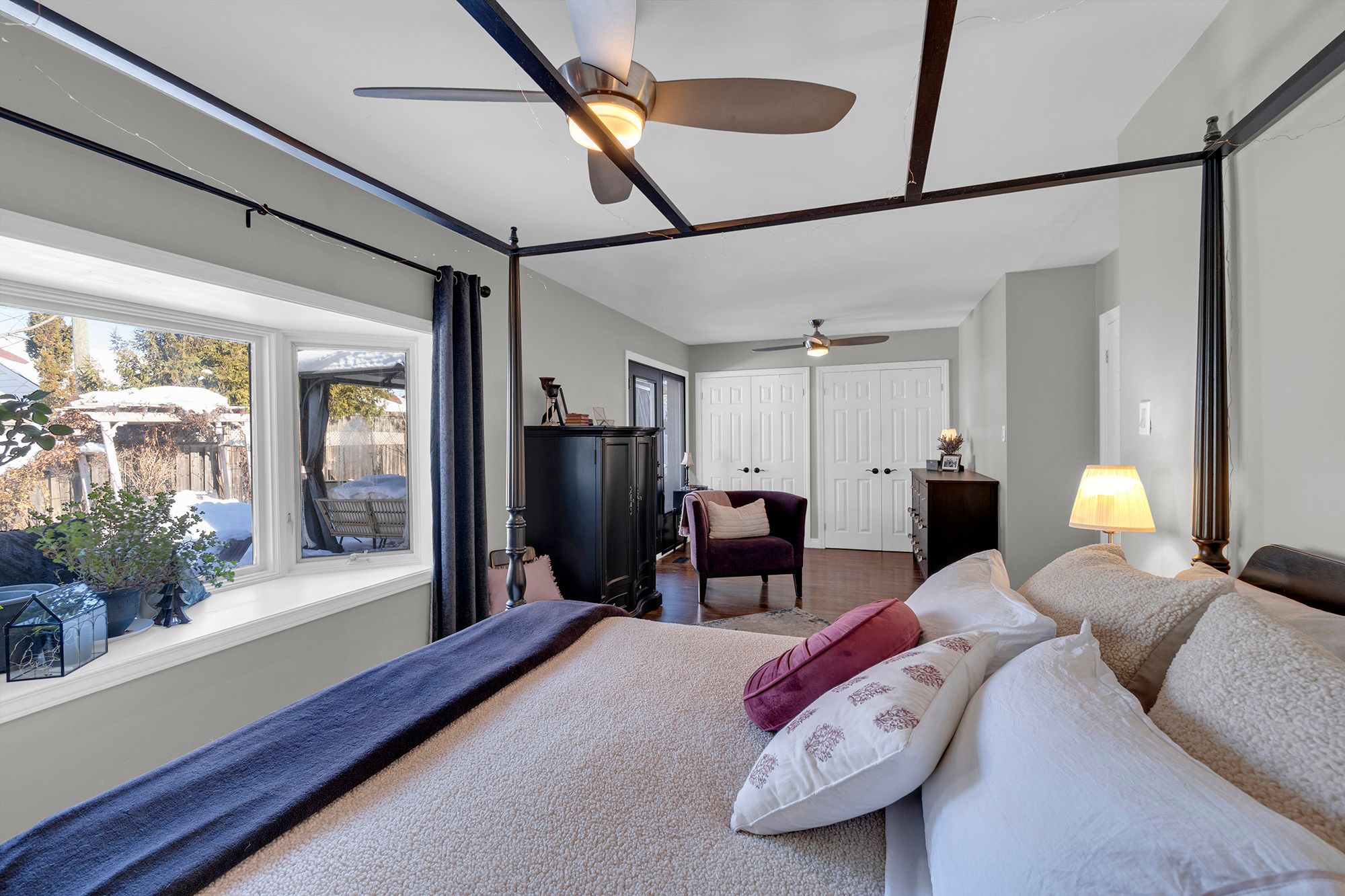 • Large primary bedroom with double closets and direct backyard access.