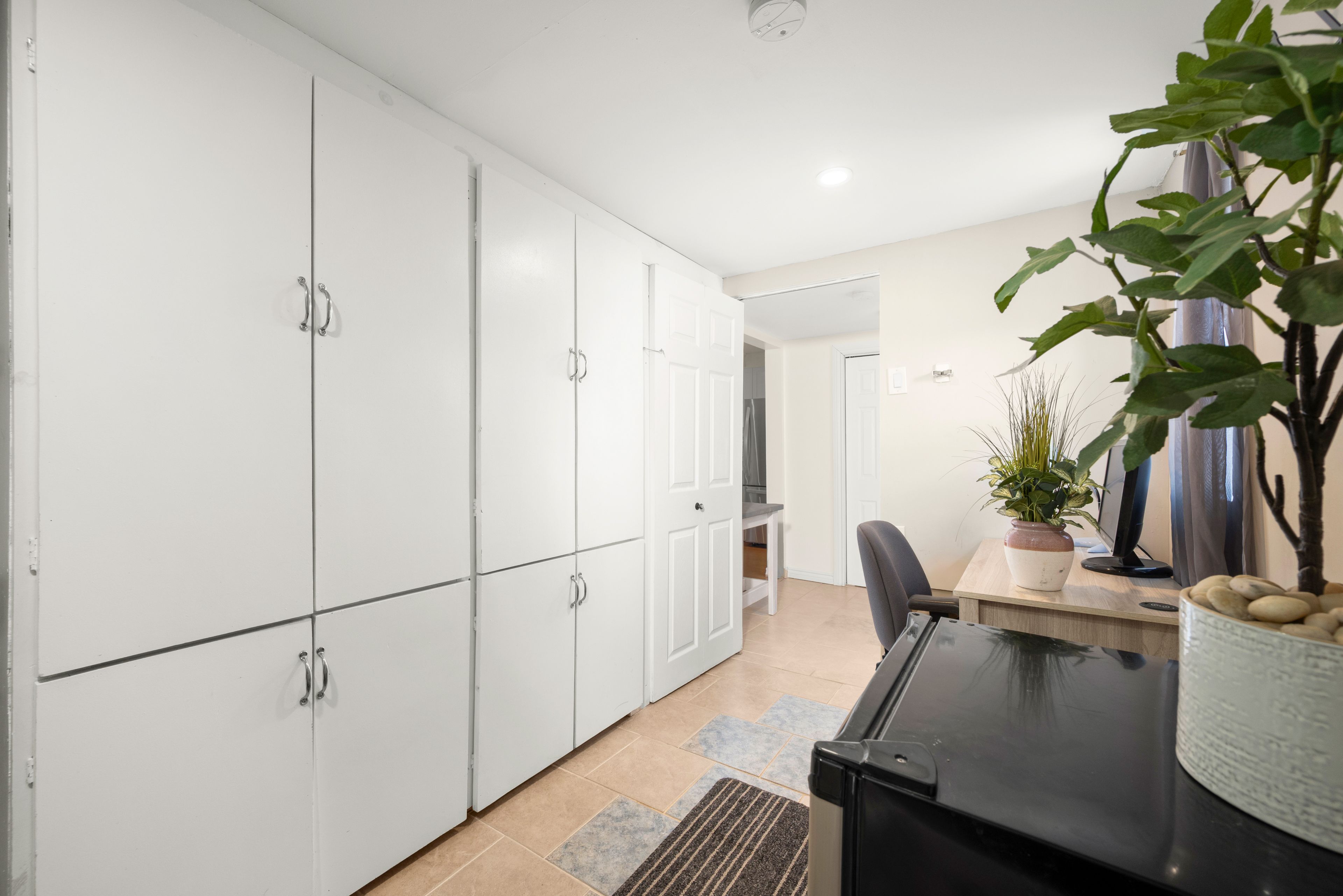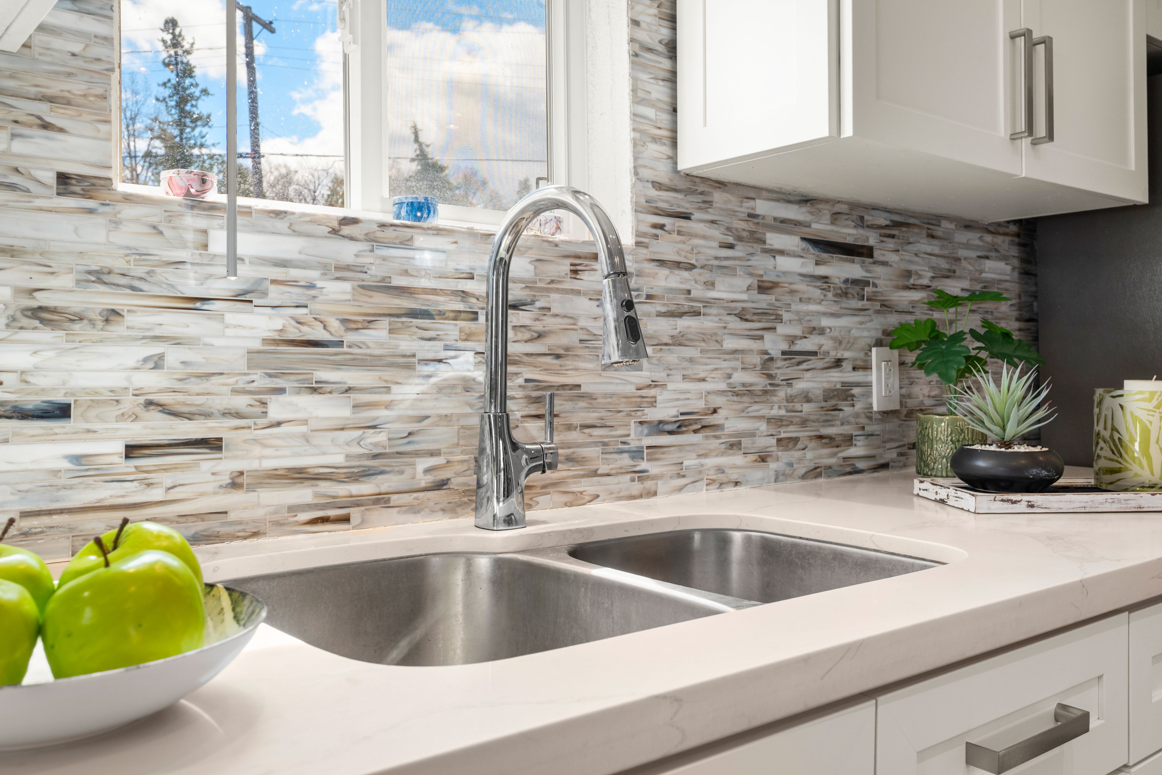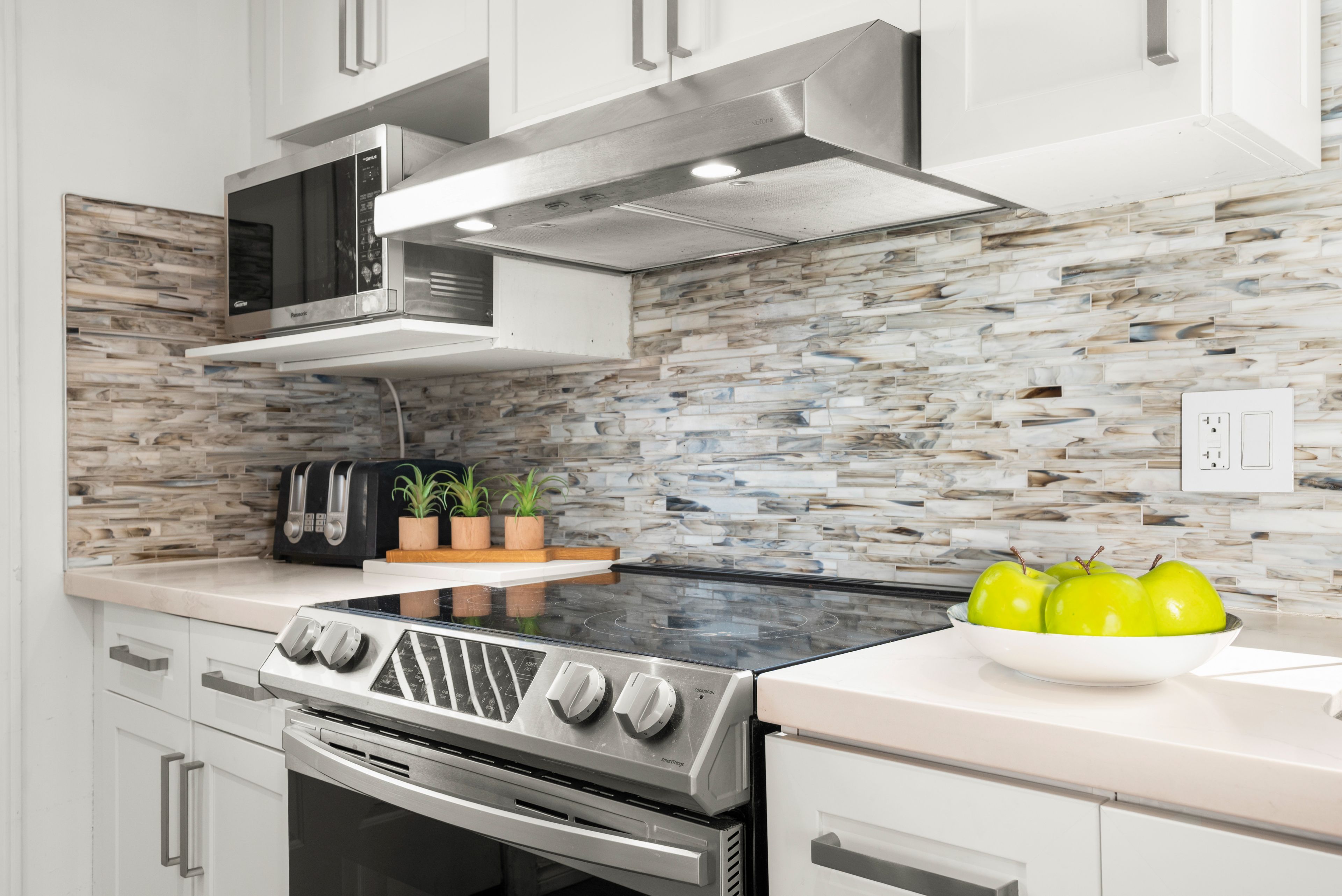 • Designer kitchen with quartz countertops and ample pantry storage.