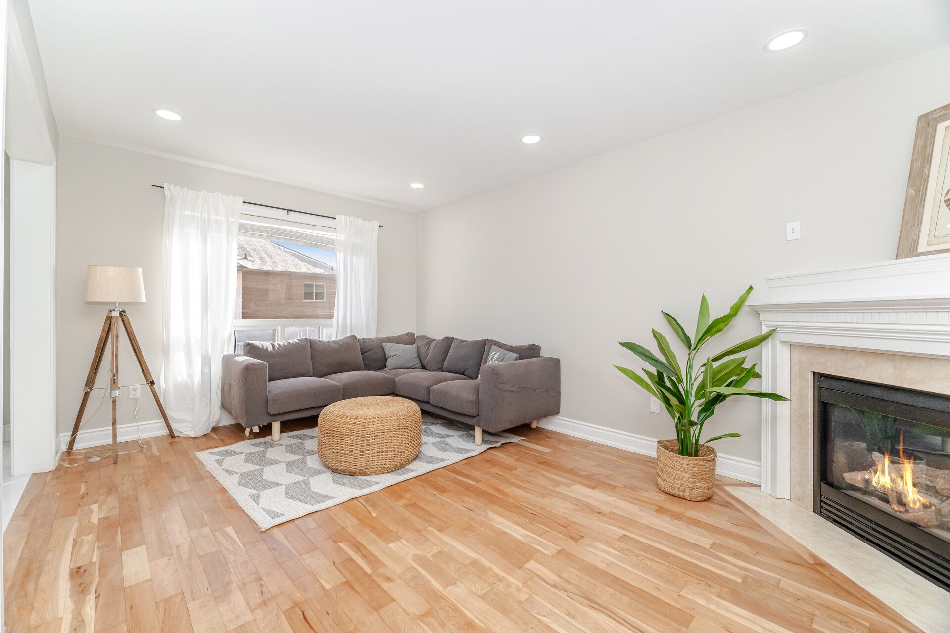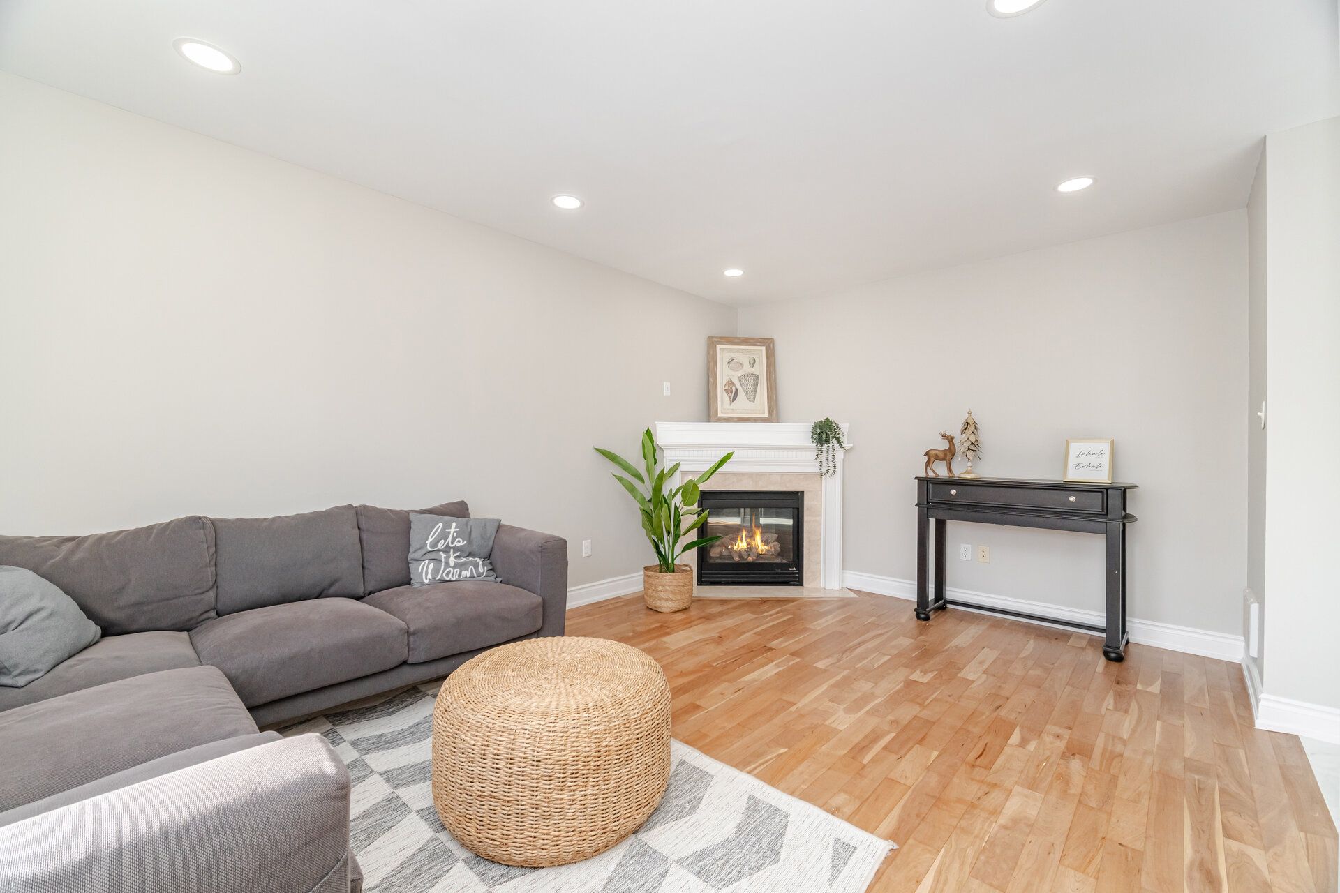 • Cozy family room featuring a gas fireplace and hardwood floors.