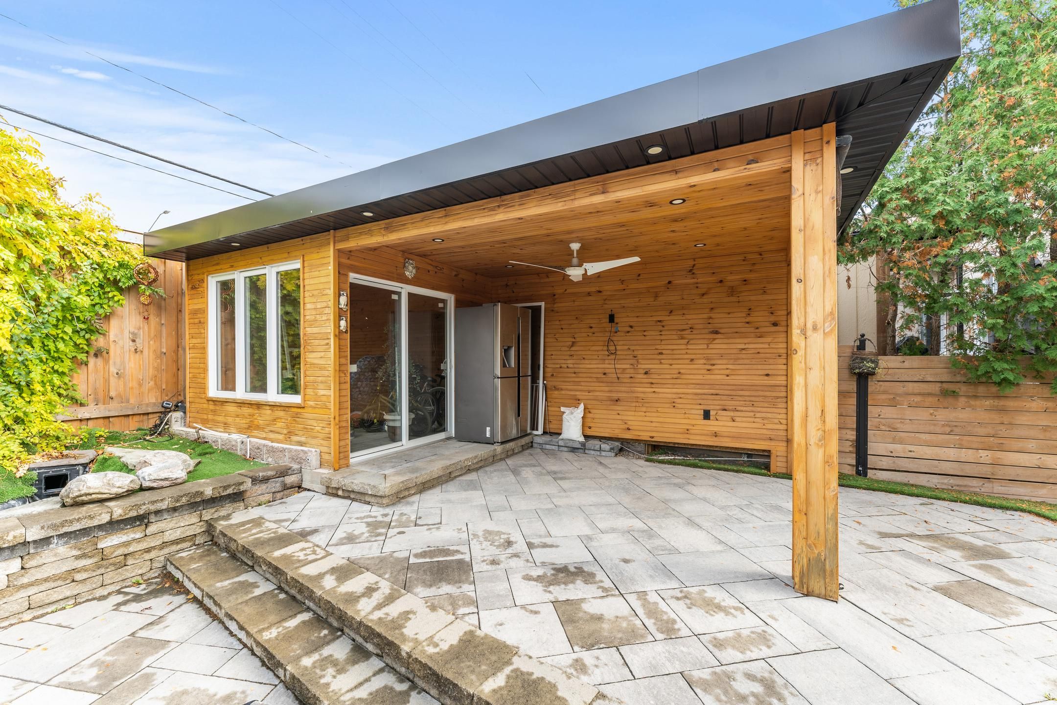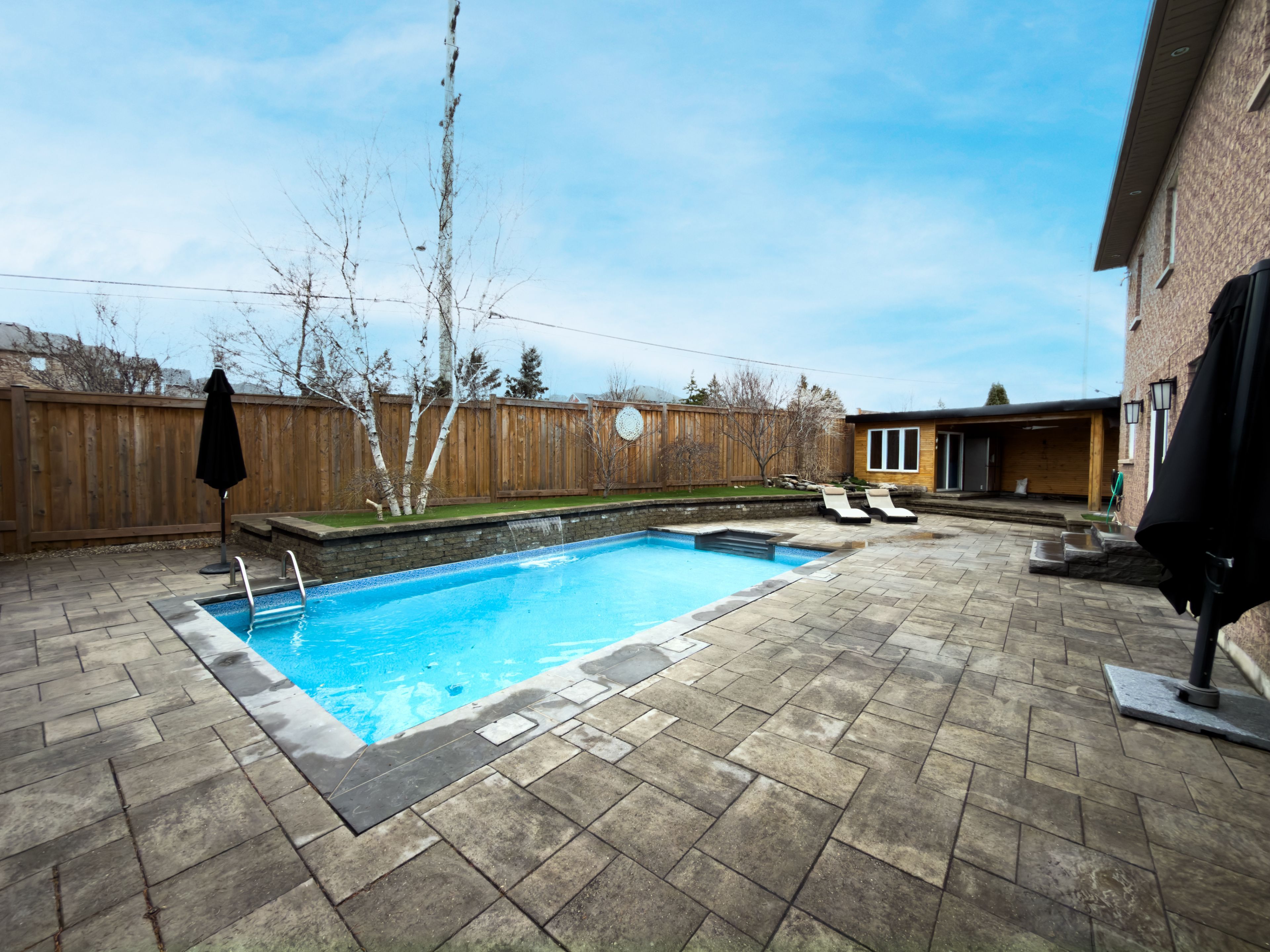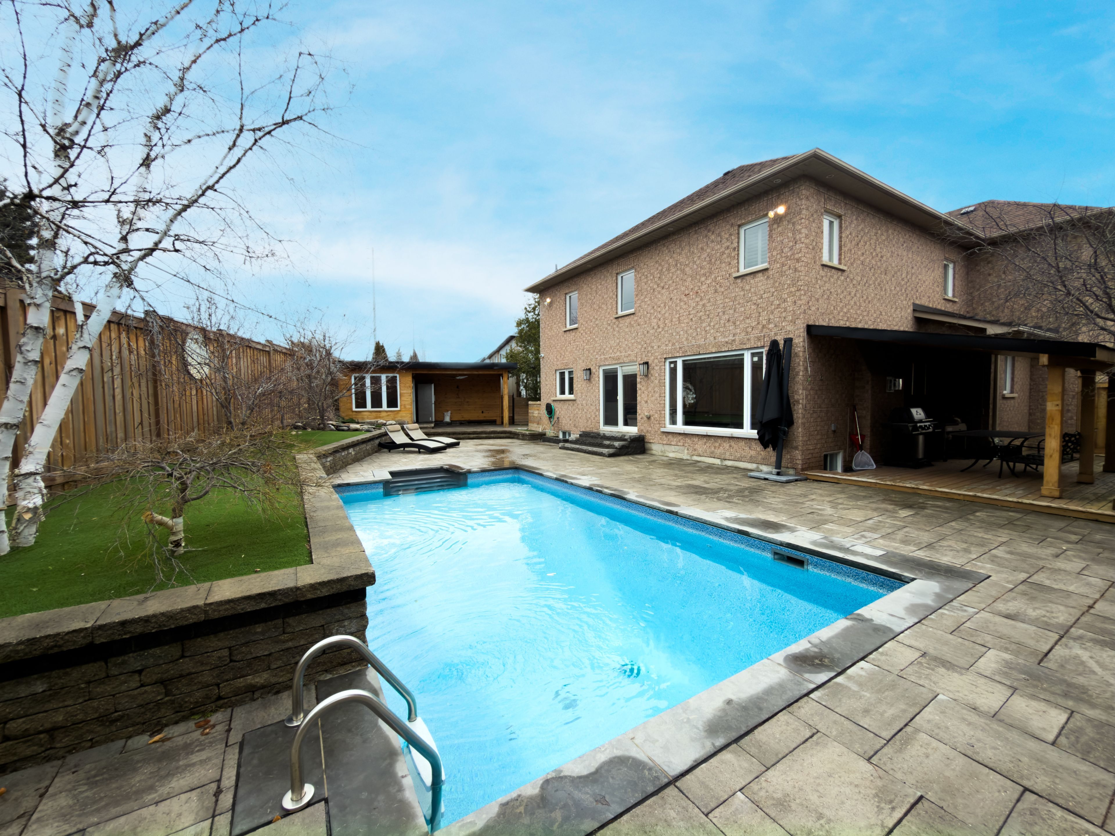 • Stunning backyard features an inground saltwater pool and landscaped areas.