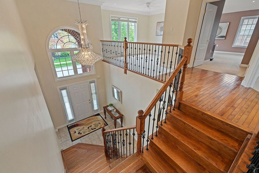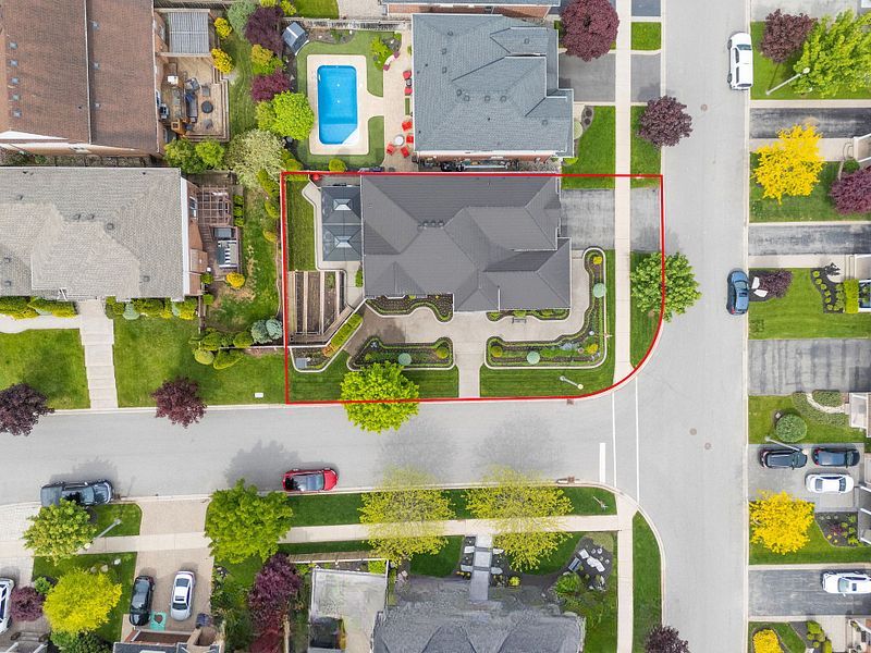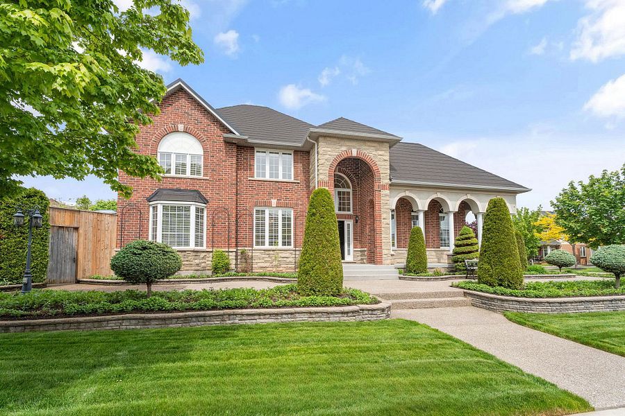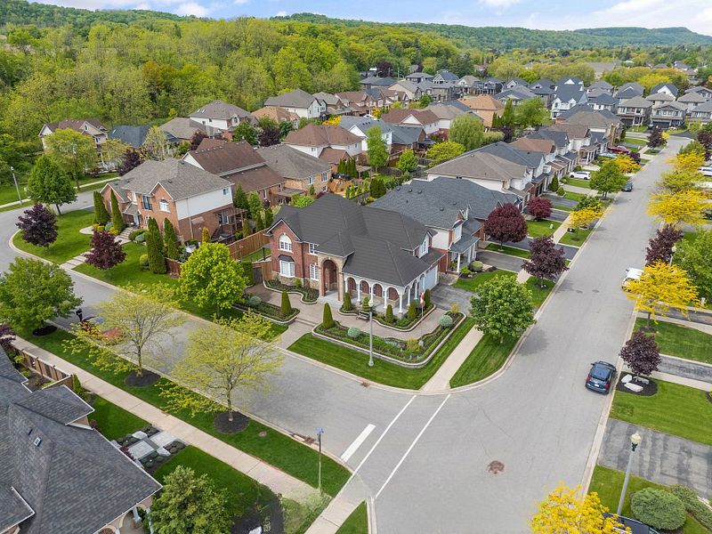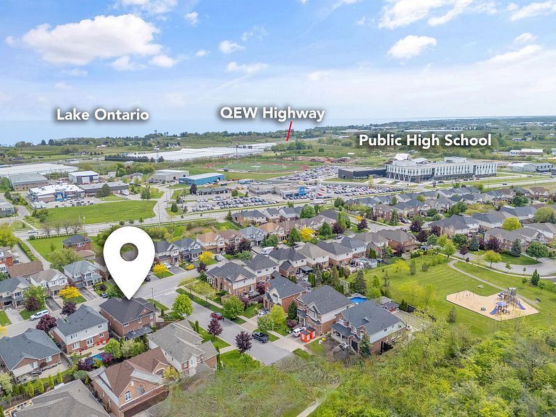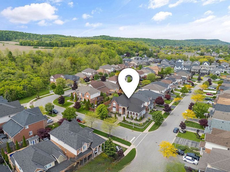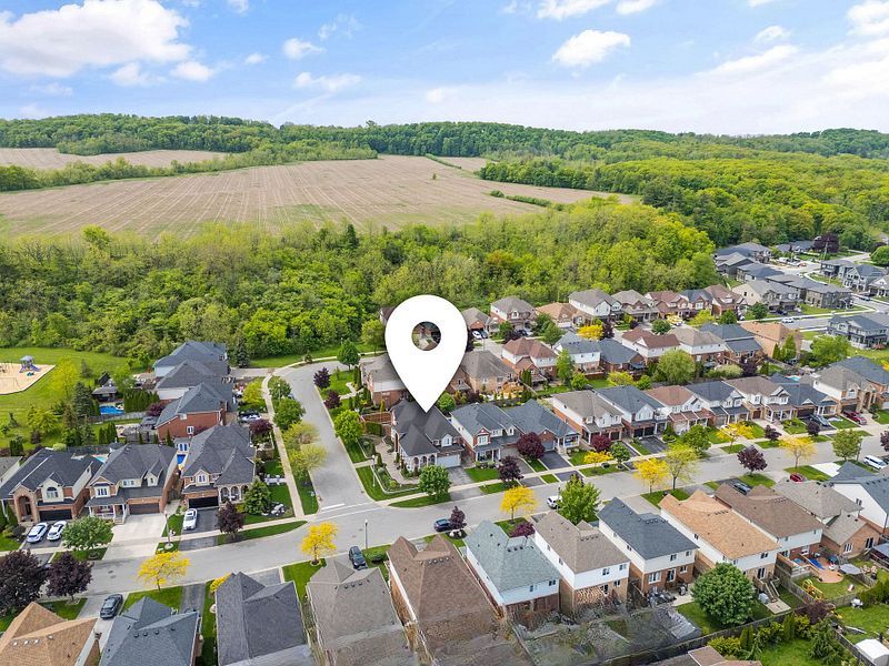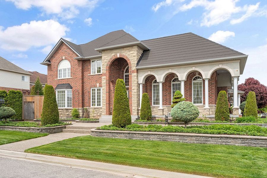 Located in the highly desirable vineyard valley neighborhood, this stunning 2-story built by the award-winning marz homes in 2004, offers over 4000 sqft of impressive living space. Greeted by a grand stone and brick facade, showcasing exceptional curb appeal with a charming wrap-around porch and beautifully landscaped stone flower beds. Step inside to discover an inviting foyer with soaring 18-ft ceilings and a striking crystal chandelier that sets a tone of sophistication. The great room features a 12-ft ceiling and oversized windows that flood the space with natural light. The rest of the main level boasts 9 ft ceilings, creating an airy and inviting atmosphere. Enjoy cozy evenings by the gas fireplace in the family room or host memorable dinners in the large formal dining room. The kitchen is equipped with a corner pantry. An adjoining breakfast area that flows into the living and onto the patio. Venture upstairs to find 3 generous bedrooms, each with a walk-in closet, and a bright loft that overlooks the foyer, which could easily be converted into a 4th bedroom. The primary bedroom features a vaulted ceiling, while the ensuite boasts double sinks, a corner tub, and a separate shower. A 2nd bath and a conveniently located laundry room complete the upper floor. The basement offers in-law potential with a separate entrance from the garage. It features a spacious rec room with a fireplace, a spare bedroom, and roughed-in bath and wet bar. Step outside to your private, fully fenced yard, which includes a double gazebo covered concrete patio, and a garden area perfect for relaxation. Freshly painted, central vac and 2018 steel roof from metstar. This prime location provides easy access to farmers markets, lake ontario, and a wealth of parks and walking trails. Explore nearby restaurants and charming towns along the niagara escarpment. Families will appreciate the proximity to the ymca, schools and hospitals, with a quick drive to downtown and just a minute to the qew.