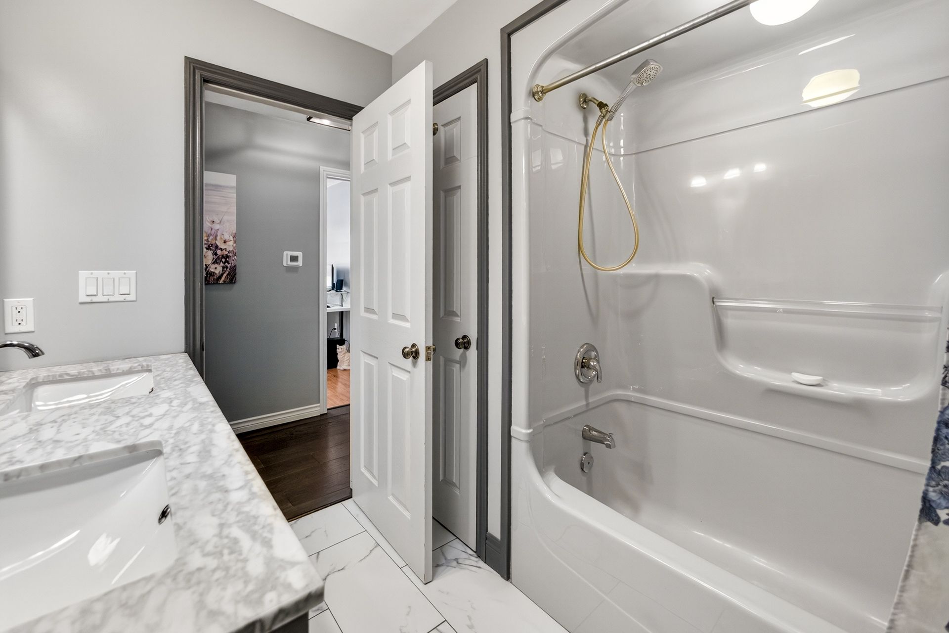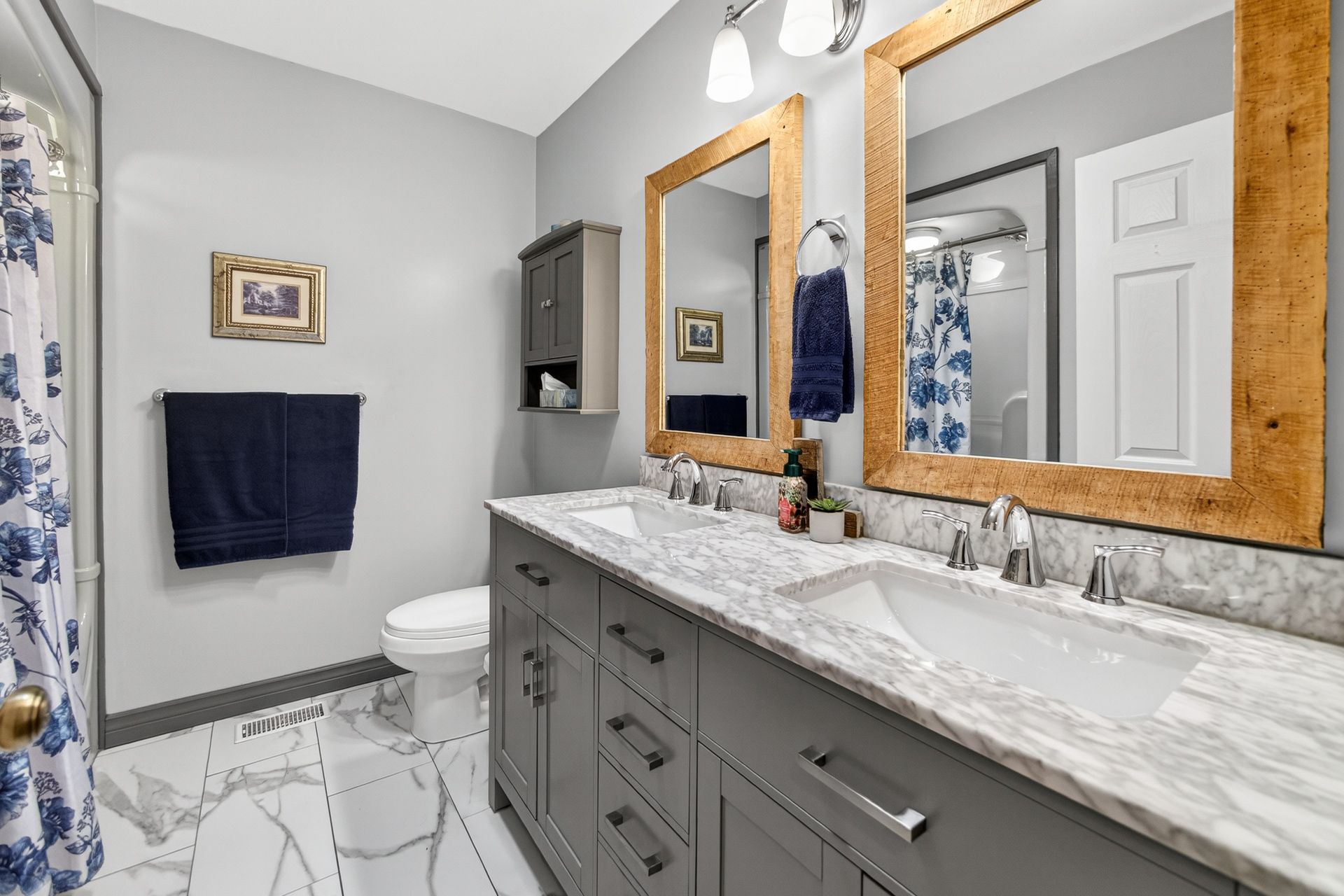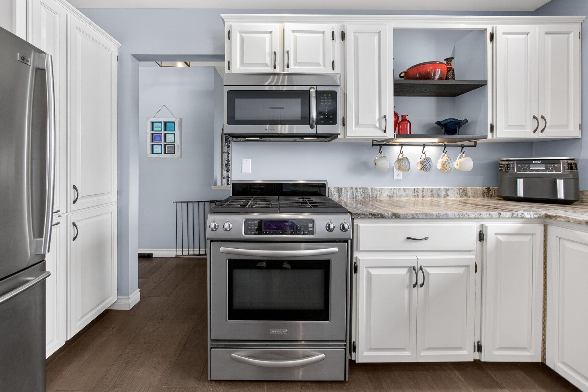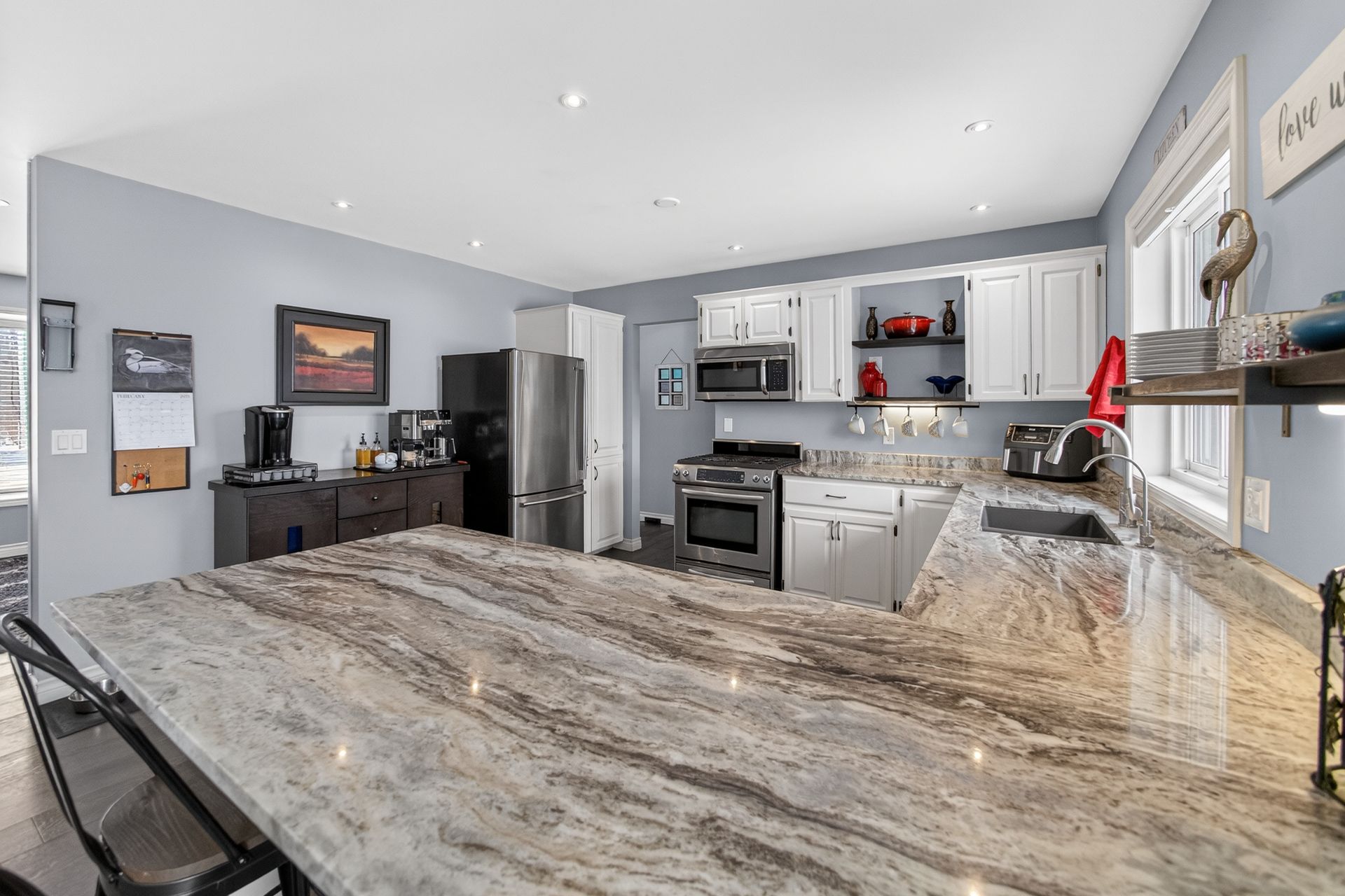 • Finished lower level with large rec room, gas fireplace, and extra bedroom.