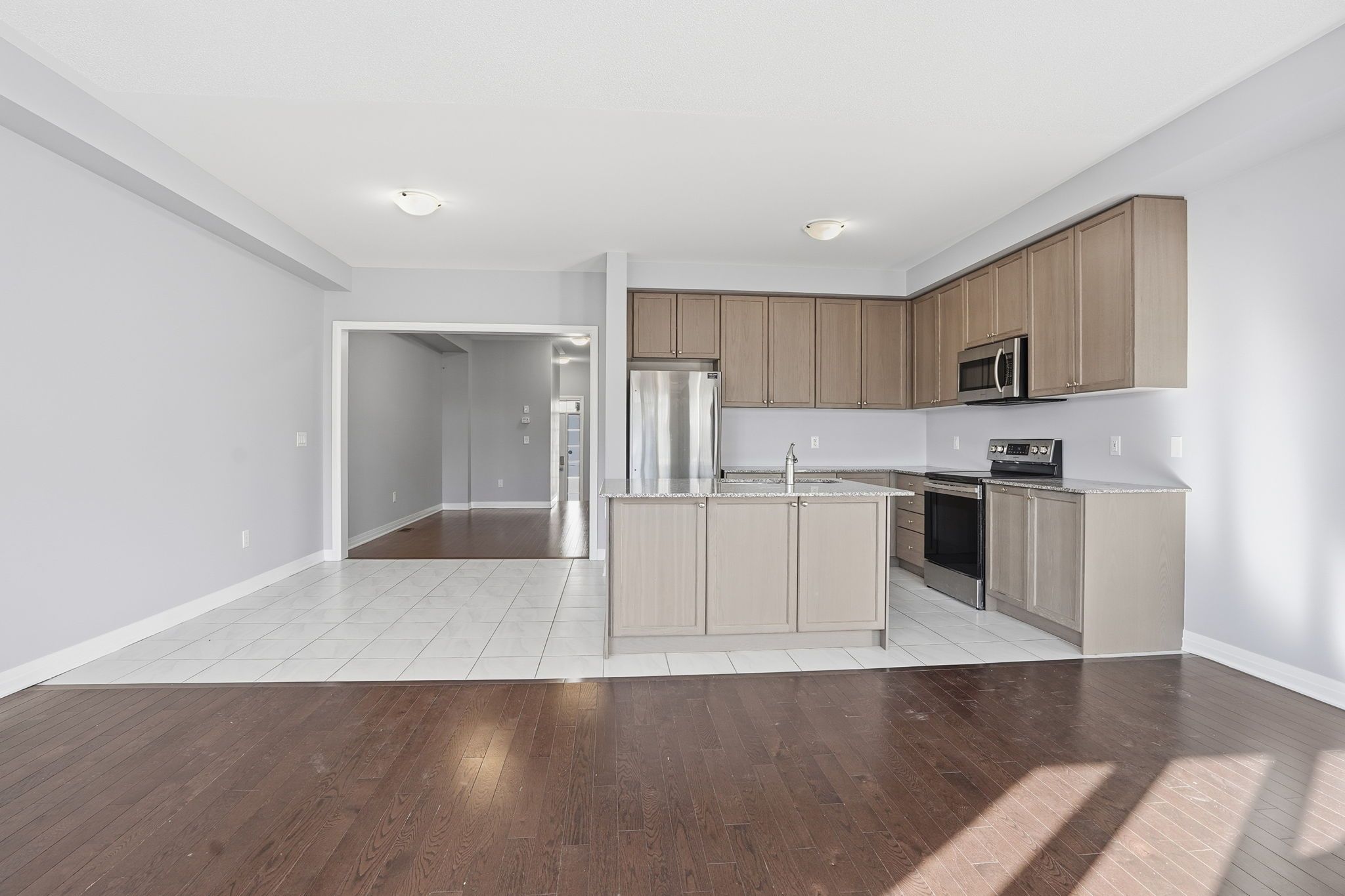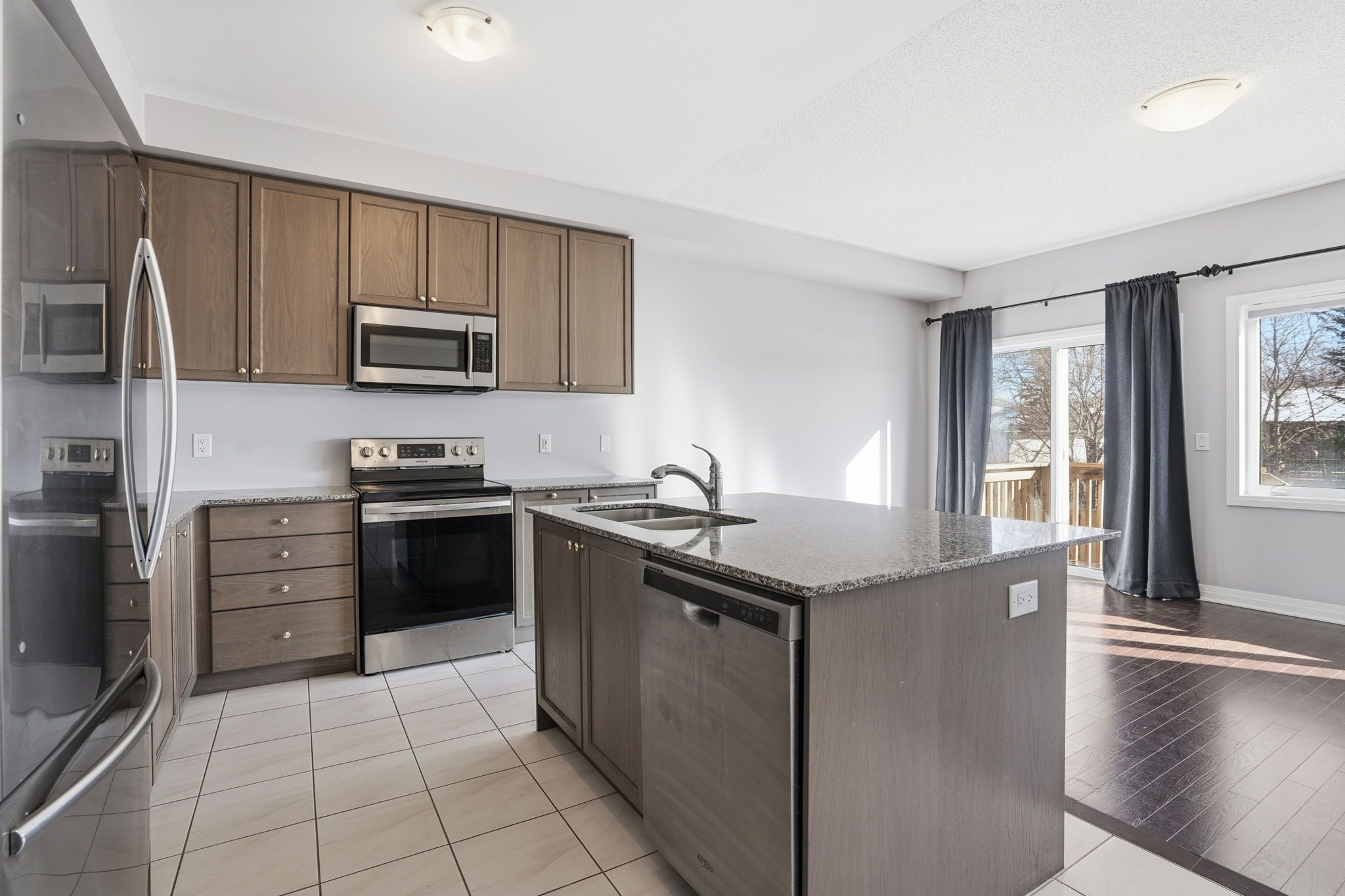 • Modern kitchen features granite countertops and stainless steel appliances.