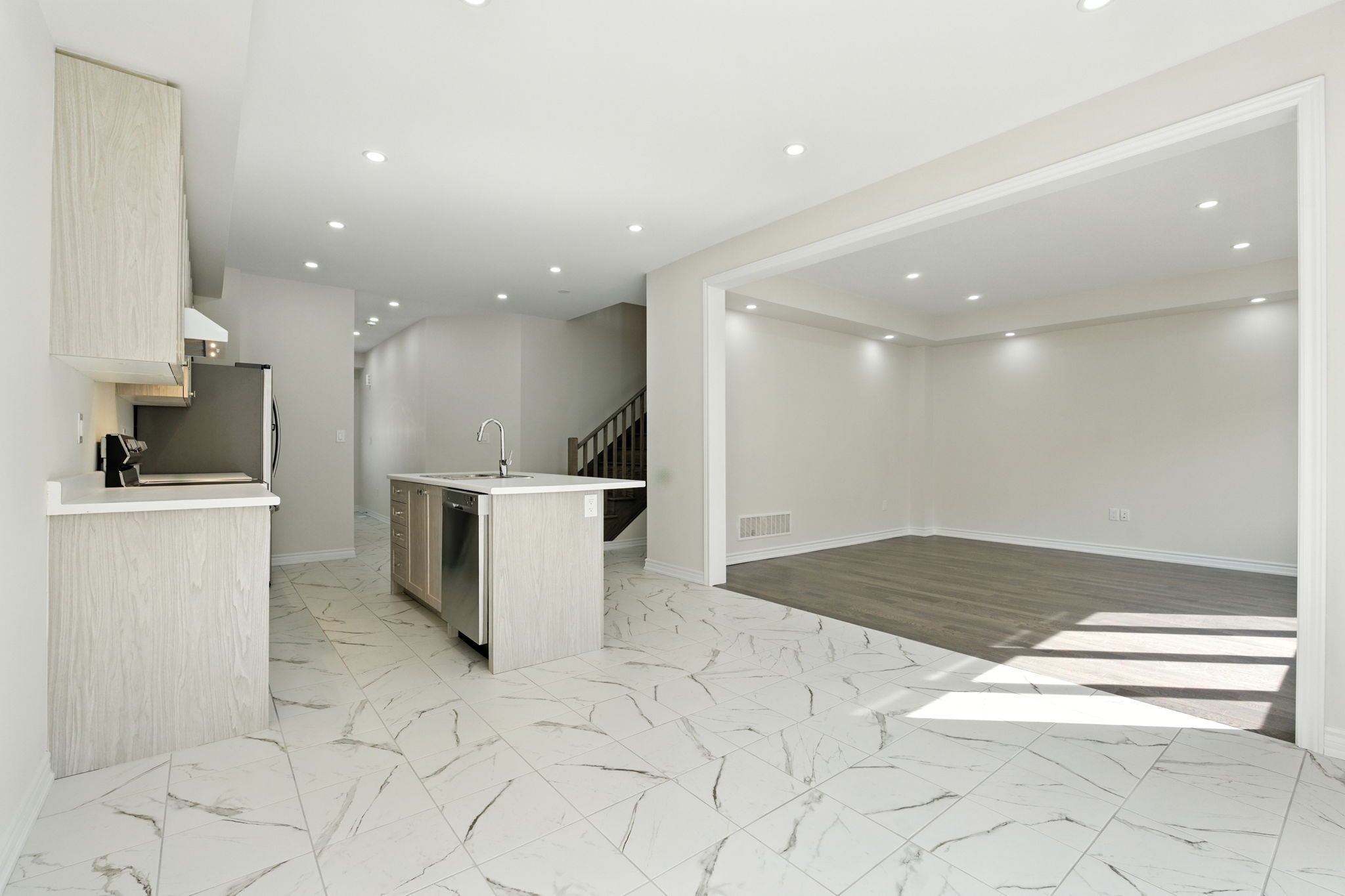 • Open-concept main floor with kitchen, dining, and living areas.