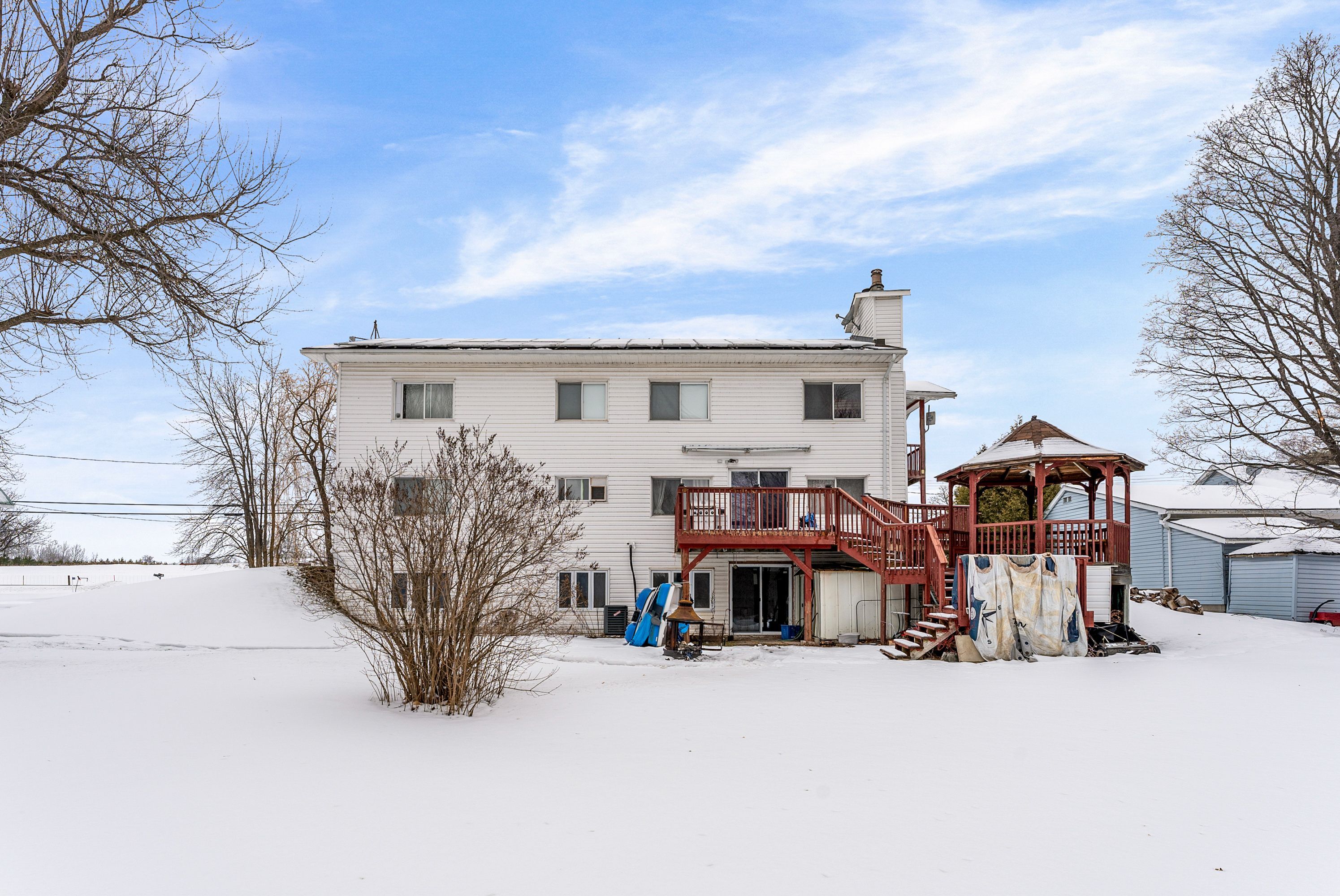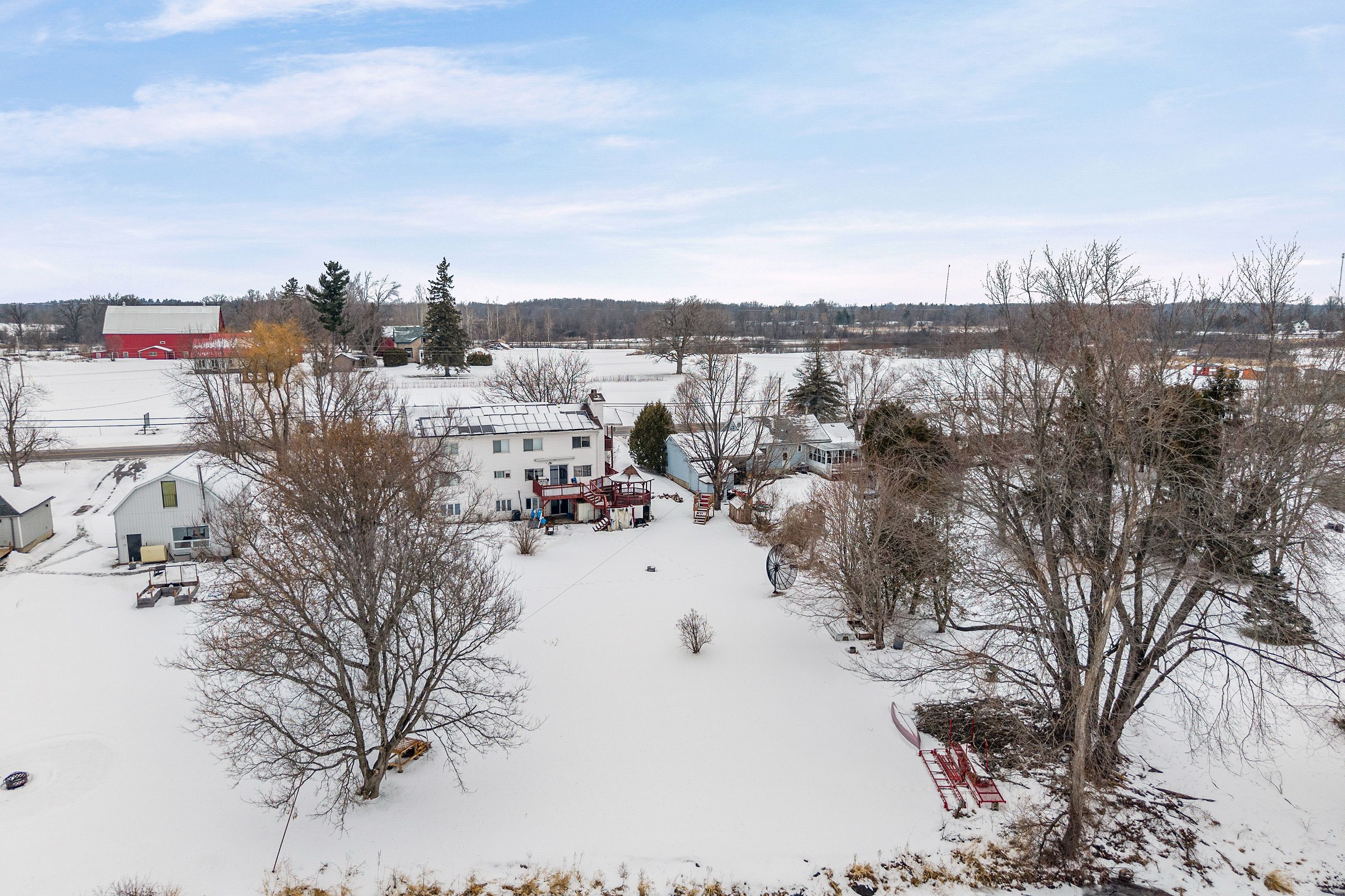 The property backs into tay river, 124' of swimmable waterfront. The home features a grand staircase, vaulted ceilings and loft overlooking the sunken living room. Lots of bedrooms, 3 bedrooms and a giant room that accomodates 4 queen beds in the second floor. The main floor features gas fireplace in the living room, big master bedroom that accomodates 2 queen beds a wall to wall close , and a 4 pc bathroom ensuite. Family room walkout to a big deck and a gazebo. Basement is perfect for entertaining with pool, table tennis and a walk out sliding door to the backyard. A completely separate accessible from outside via deck unit on top of garage complete with a bedroom kitchen, washroom and laundry. A 20 kilowatt solar panel system that generates electricity and supplies power to the grid that pays the property owner.
