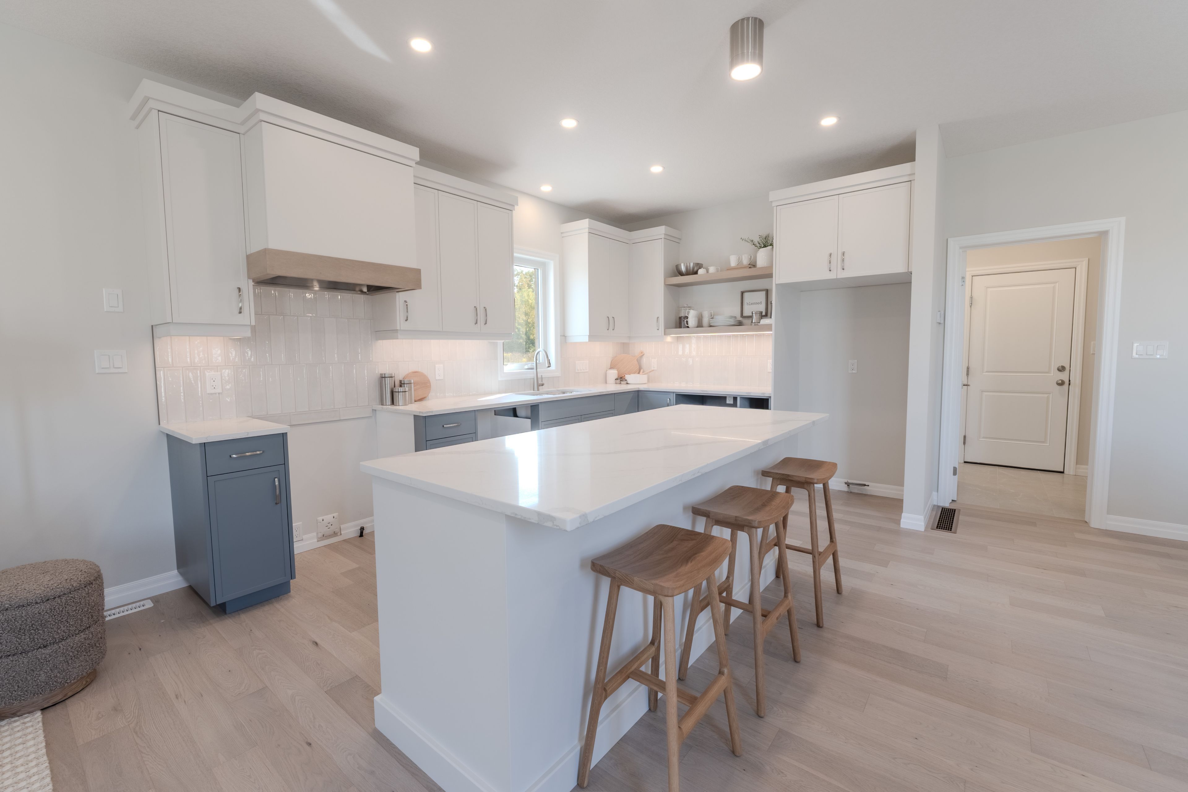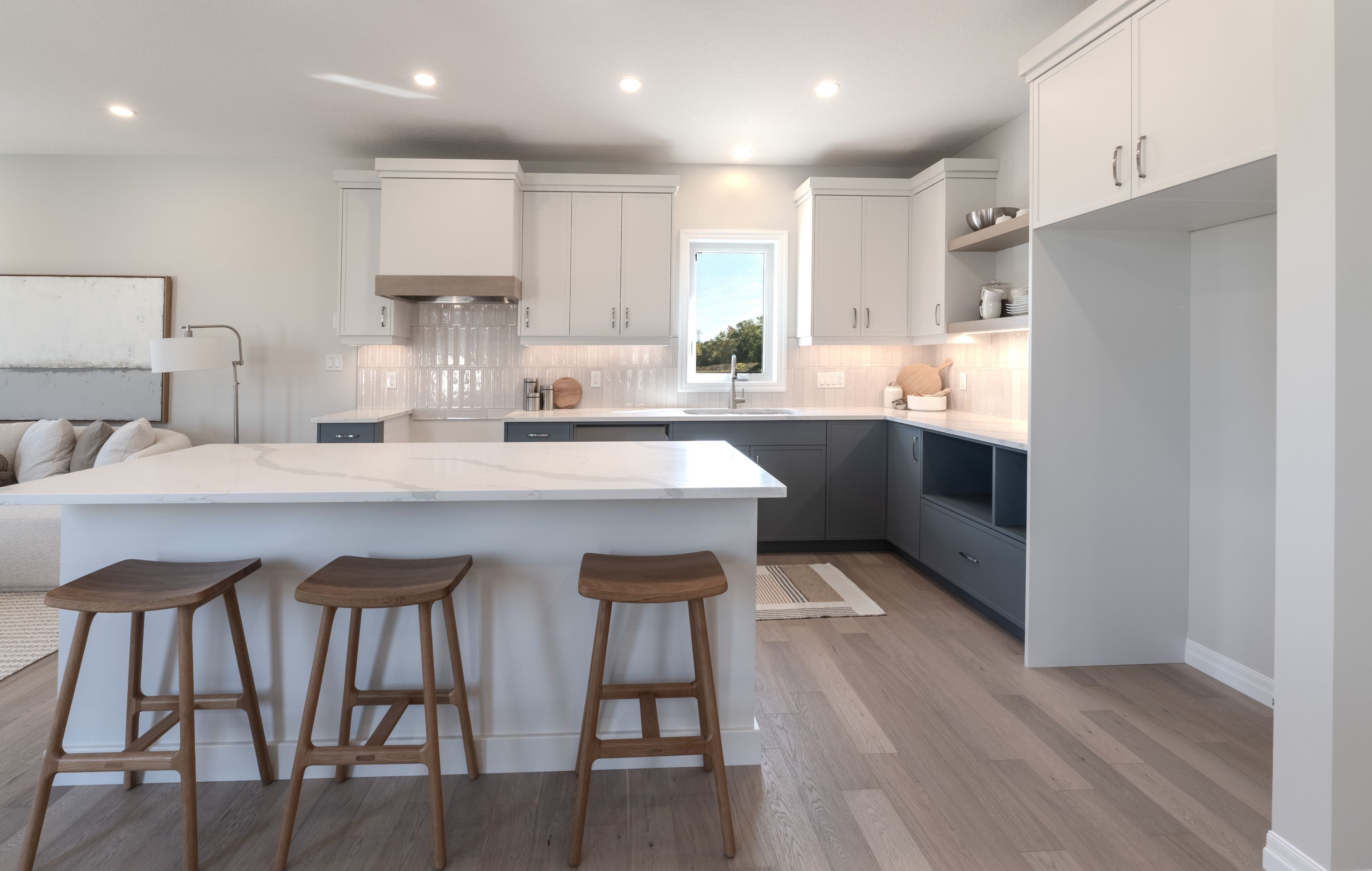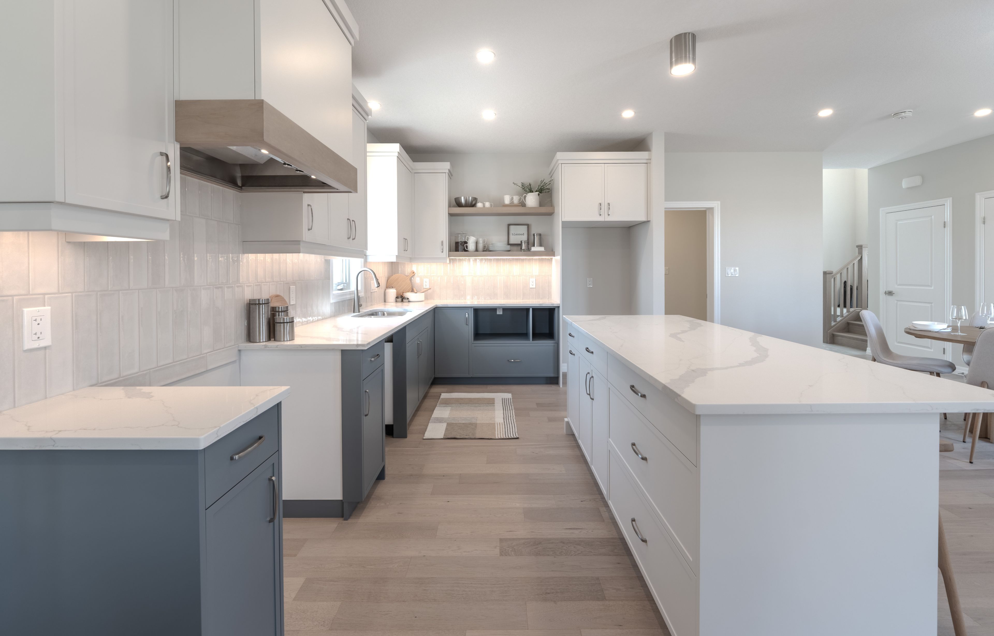 • Stylish kitchen featuring quartz countertops, large island, and pantry.