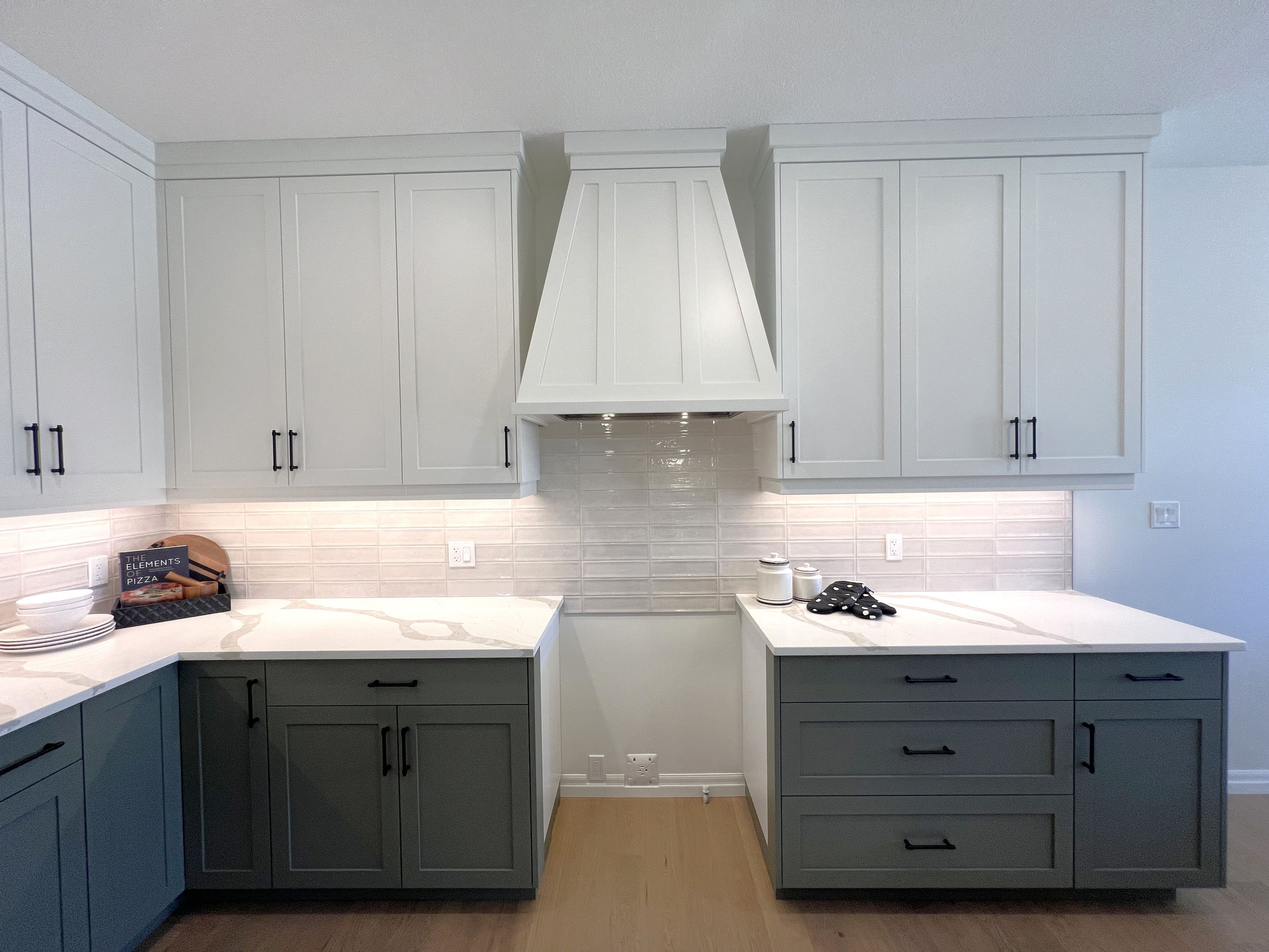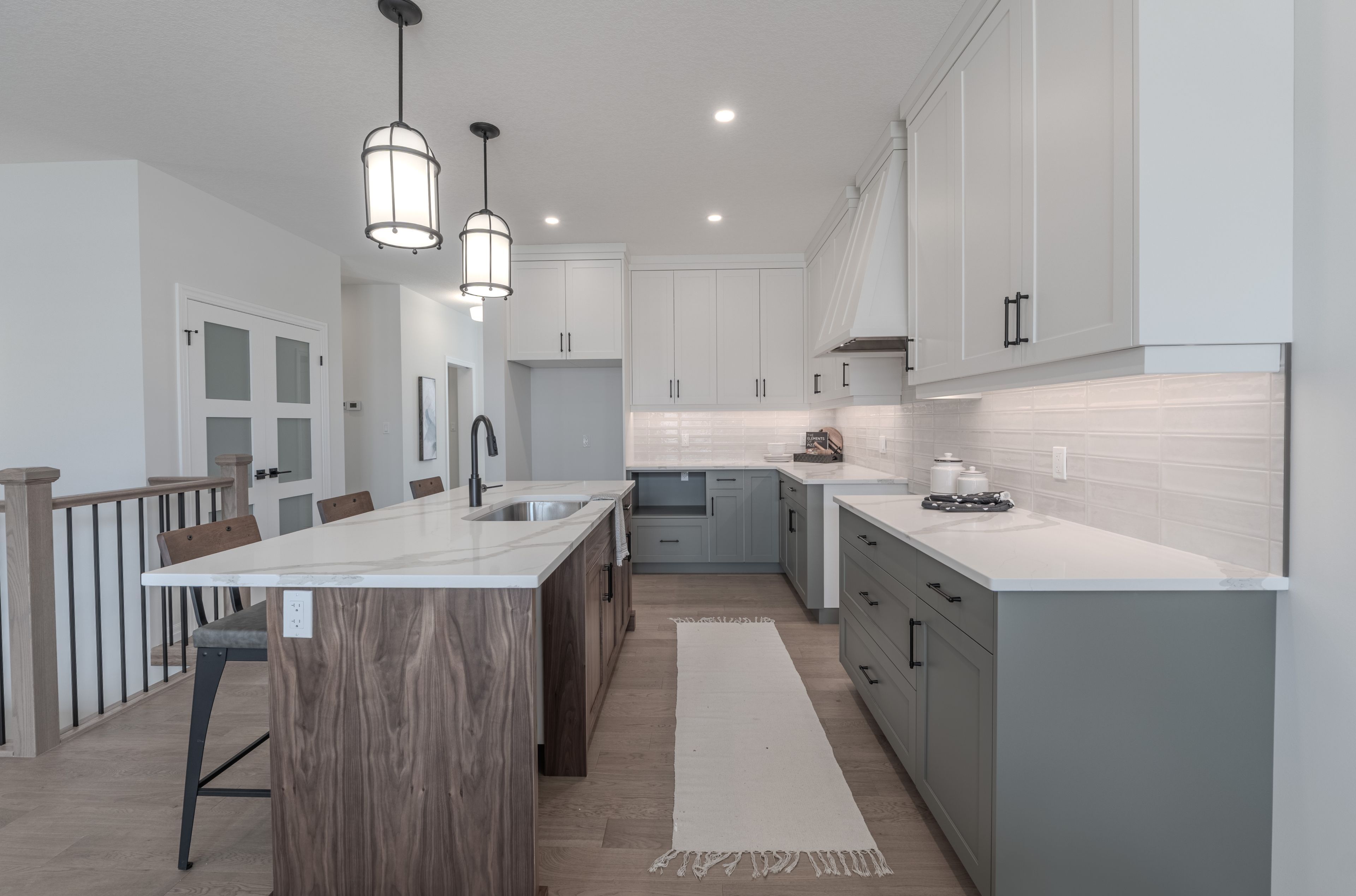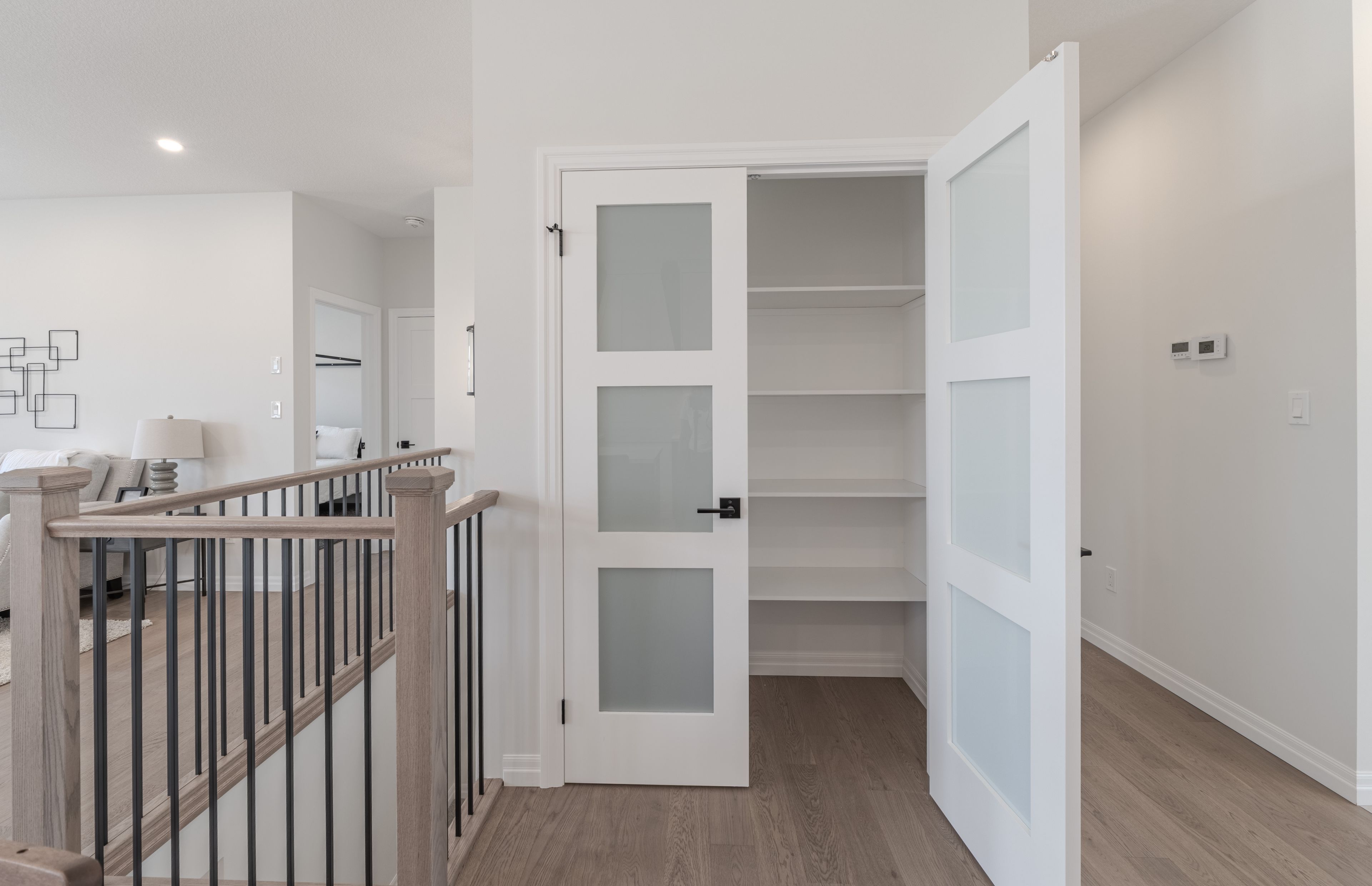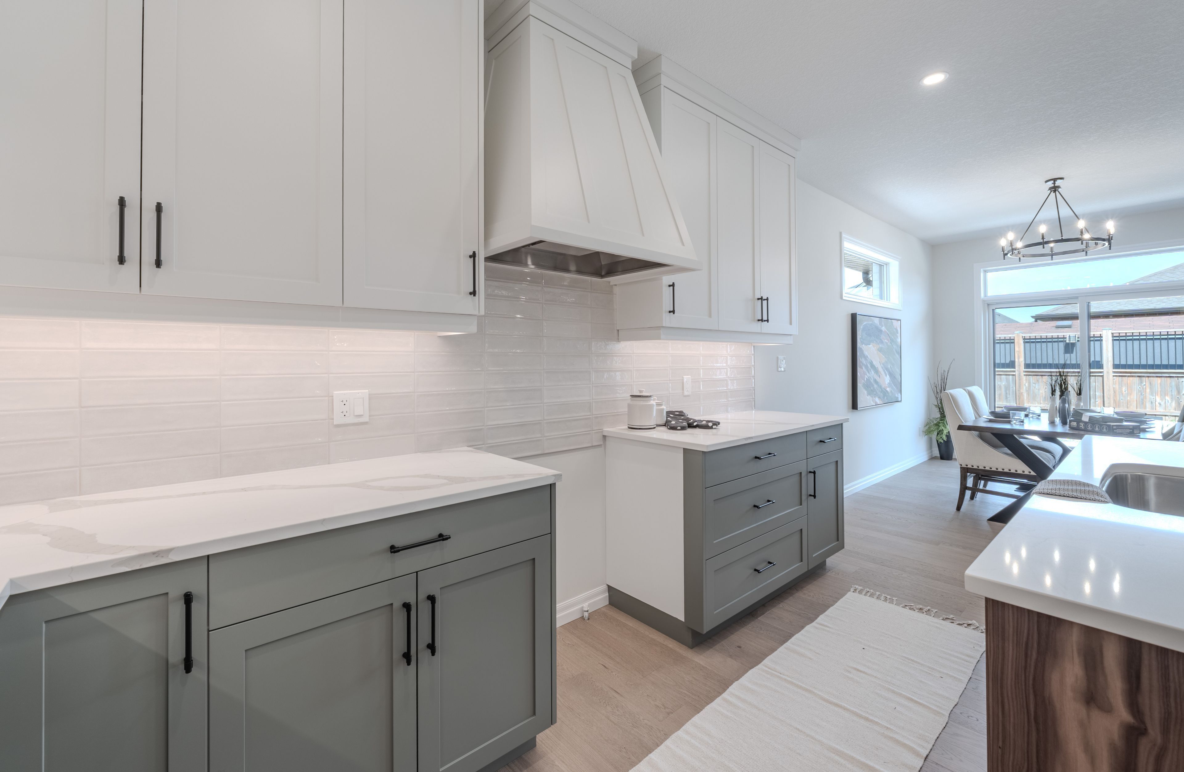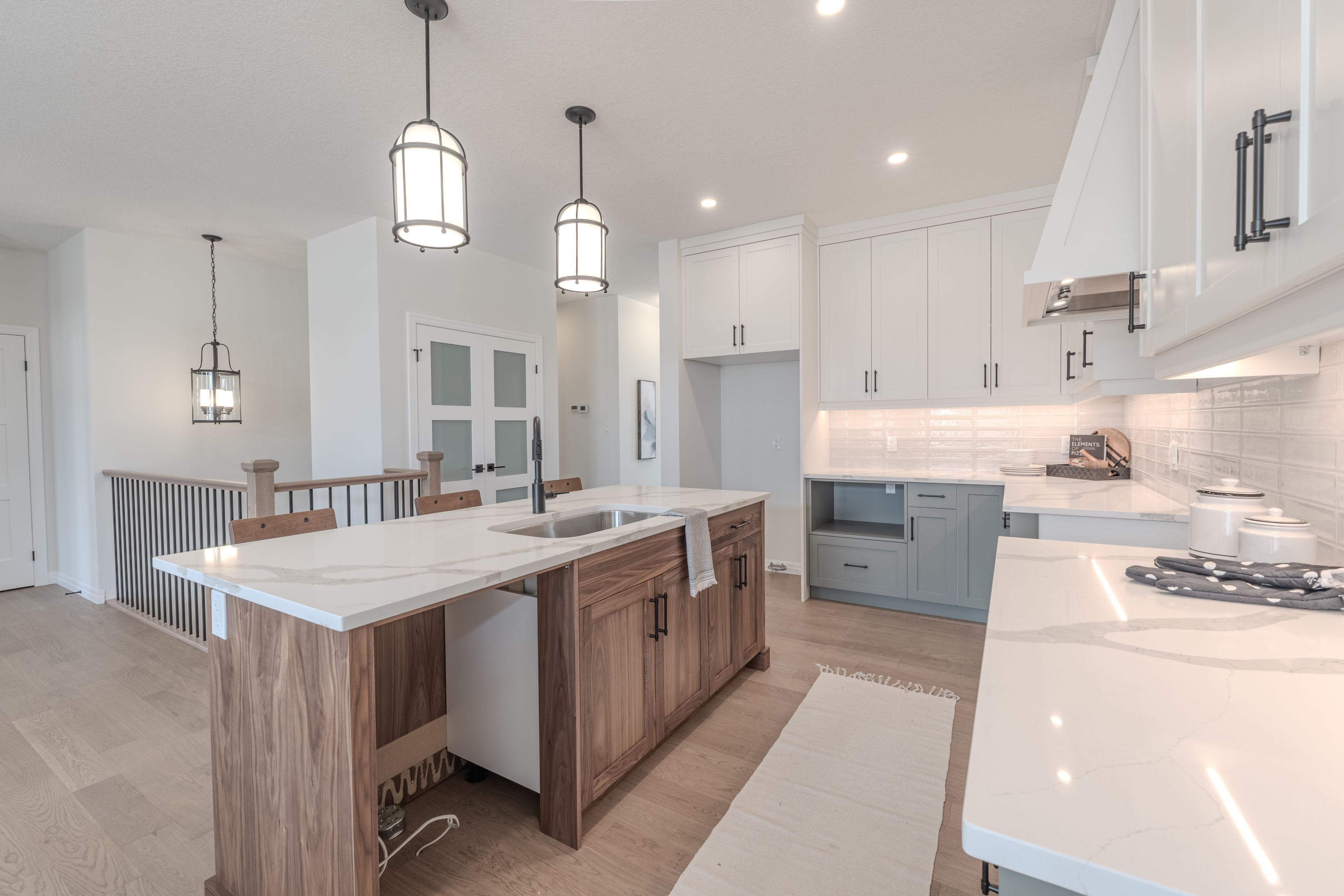 • Stylish kitchen featuring quartz countertops and a large pantry.