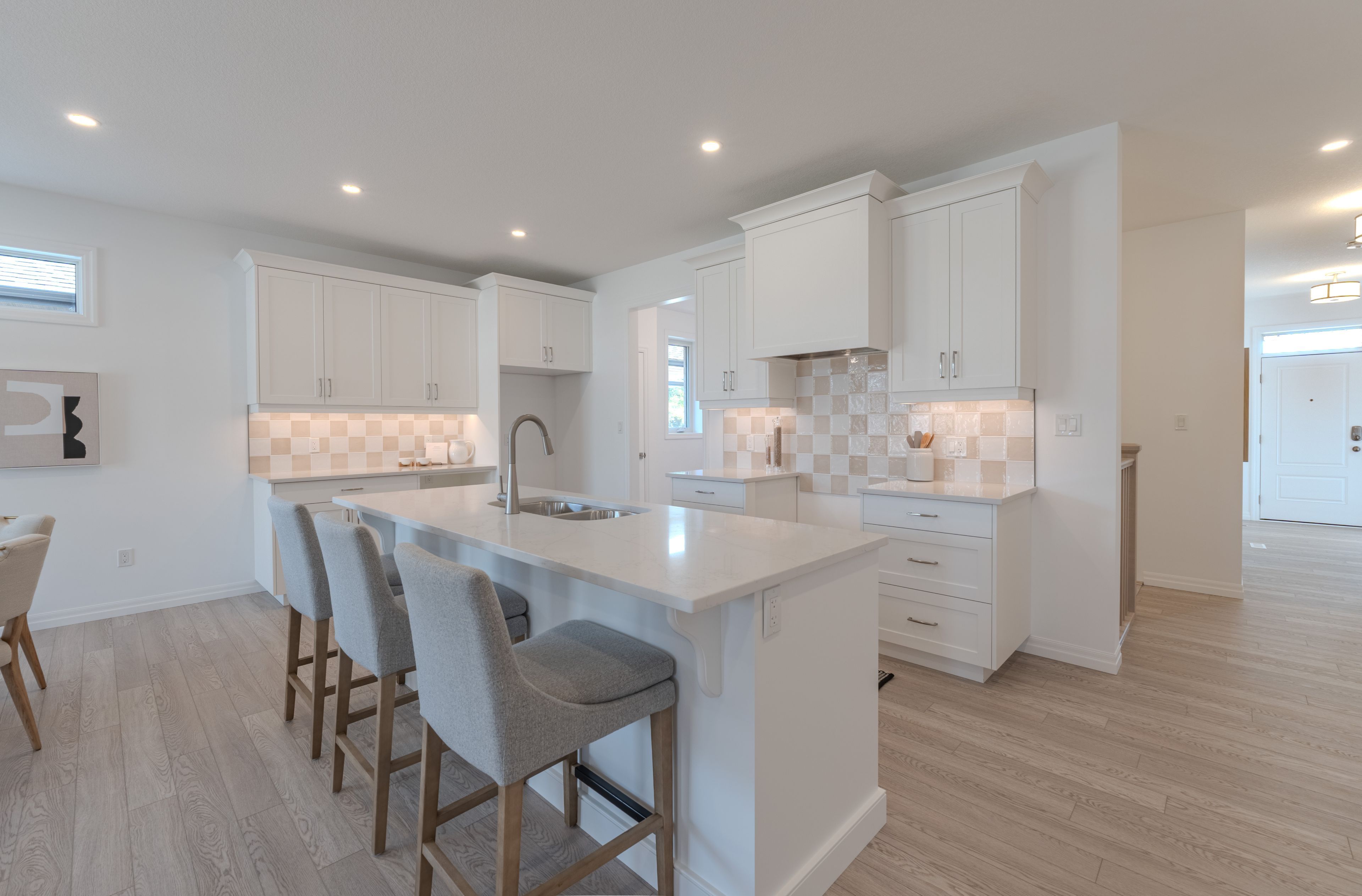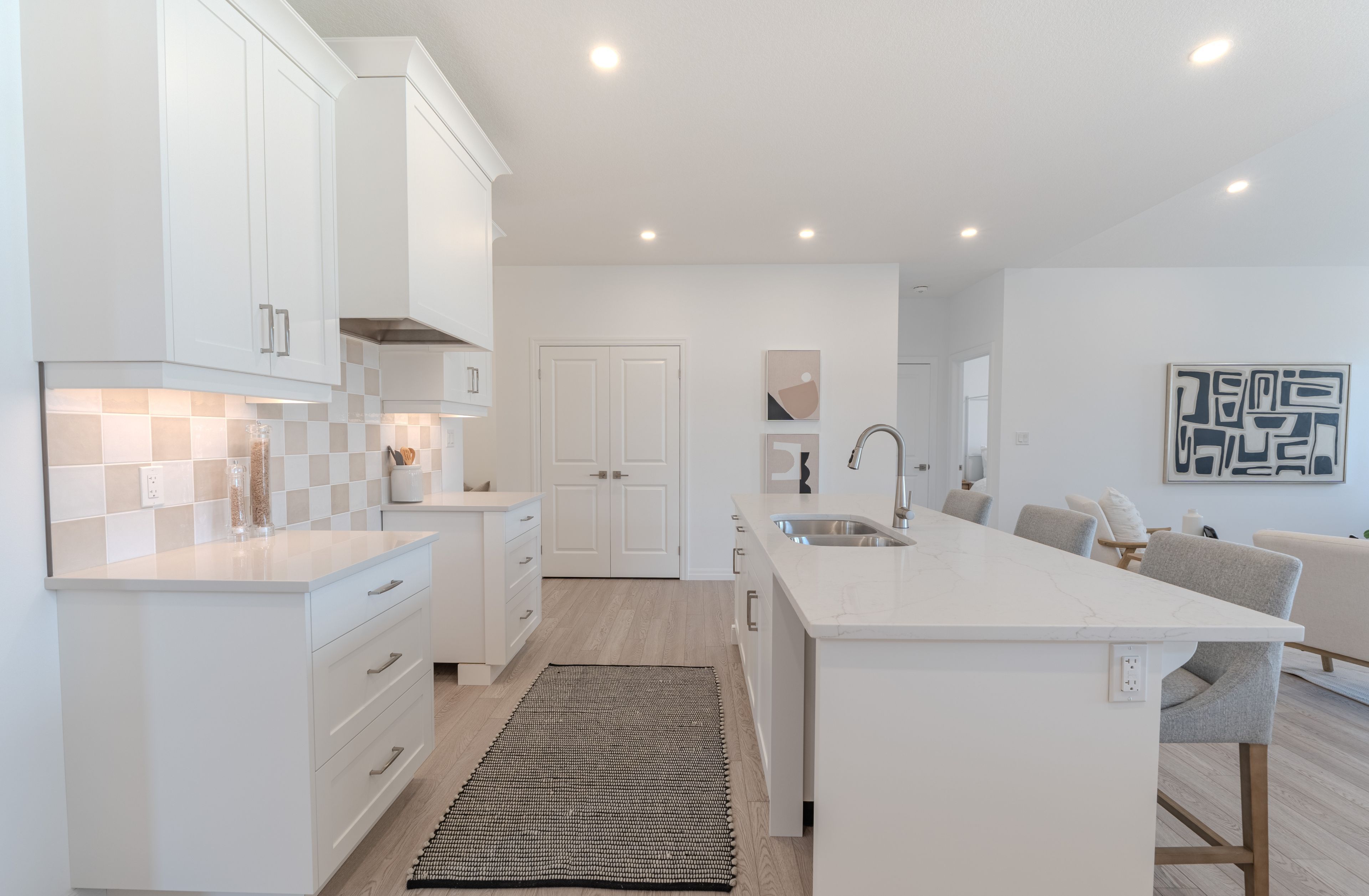 • Open-concept layout with designer kitchen, quartz countertops, and island.