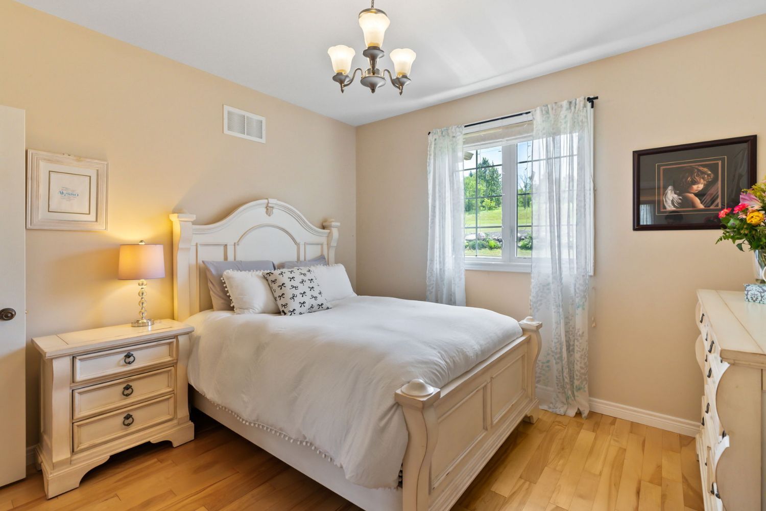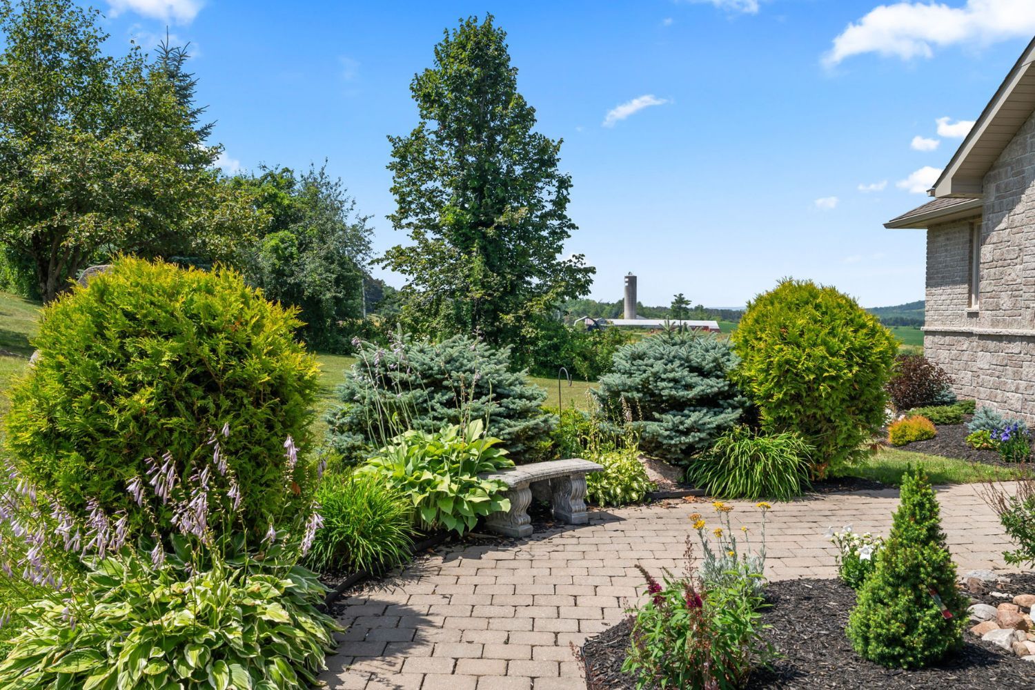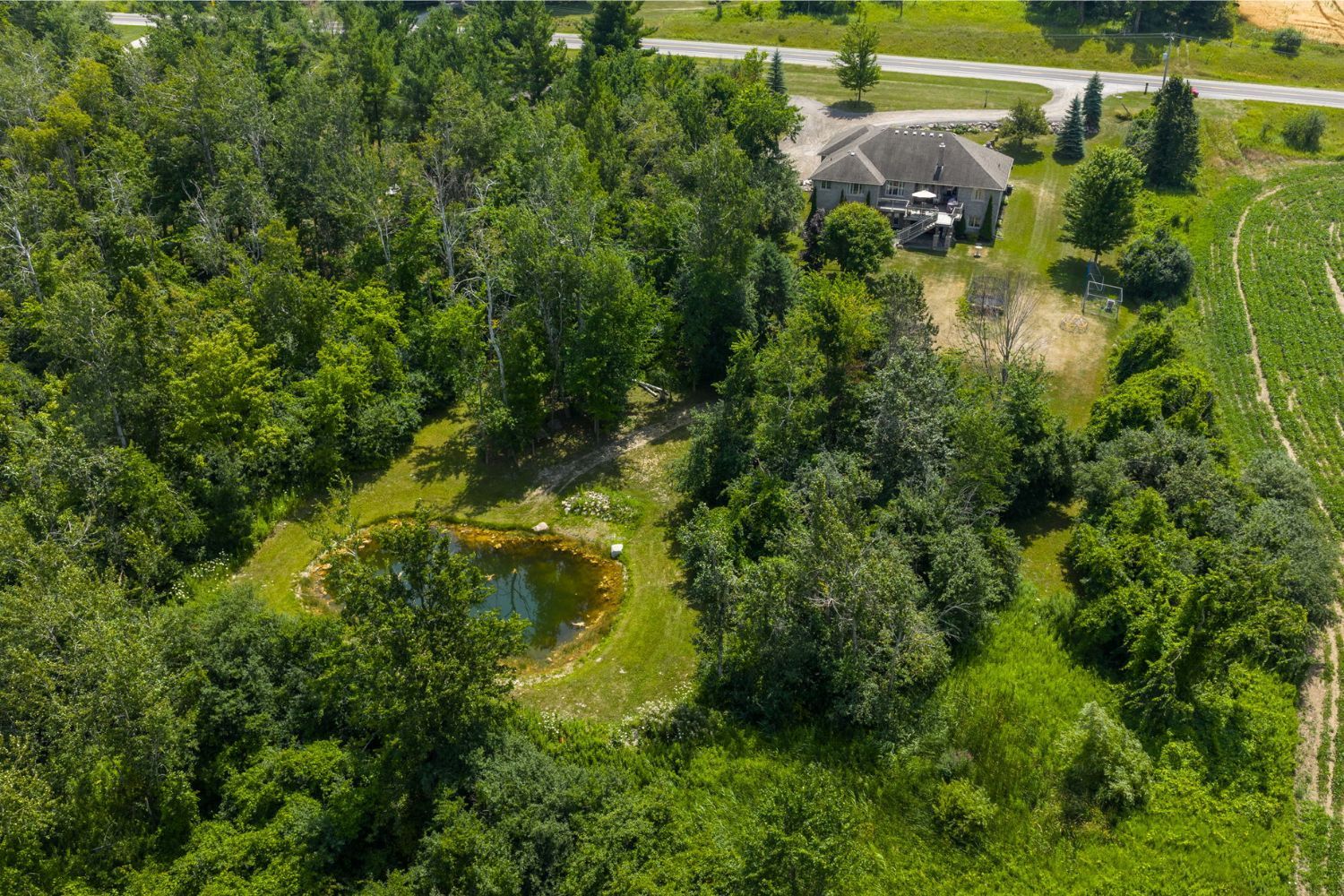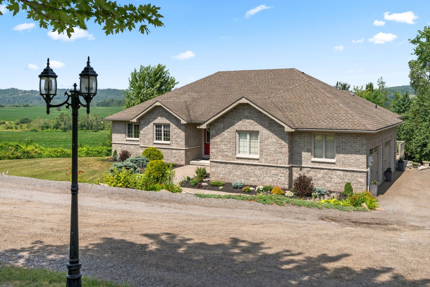 Impressive custom brick/stone bungalow, boasting over 2500 sf of luxurious living space on the main level plus full walkout basement and attached heated 3-car garage with 2 overhead doors. Nestled on an expansive 1. 74 acres, this home offers a serene lifestyle with panoramic views overlooking farmlands and the cavan hills, complete with a spring-fed pond, ranging from 10-14 ft deep. As you enter the front foyer, there is a convenient den plus the grandeur of a spacious great room, accentuated by a striking stone fireplace and a unique waffle-patterned feature wall. Gleaming hardwood floors flow throughout the home with an abundance of crown mouldings and pot lights. The chef's kitchen is a culinary delight, equipped with stainless steel appliances, a granite countertop, ceramic backsplash, and an island with a veggie sink. The adjacent large dining area opens onto a generous deck, designed with tempered regal glass for unobstructed views of the backyard and fire pit area, ideal for entertaining friends and family. The main floor features 4 well-appointed bedrooms, including a primary suite that includes a walkout to the deck, a luxurious 5-pc ensuite with dual sinks, a separate shower and a whirlpool tub, all complemented by a stylish barn door privacy feature. The primary suite also boasts a walk-in closet with built-in shelving for optimal organization. Two of the additional bedrooms share a convenient jack and jill bathroom, while a third bedroom is situated near the 2-pc powder room. The walkout basement includes large above-grade windows that flood the space with natural light, a cozy family room complete with an electric infinity fireplace and a dry bar, 3-pc washroom and a huge open area with extra plumbing rough-ins, perfect for customization. The basement also features ample storage, making it an excellent option for a multi-generational living arrangement with its separate entrances and walkout basement.