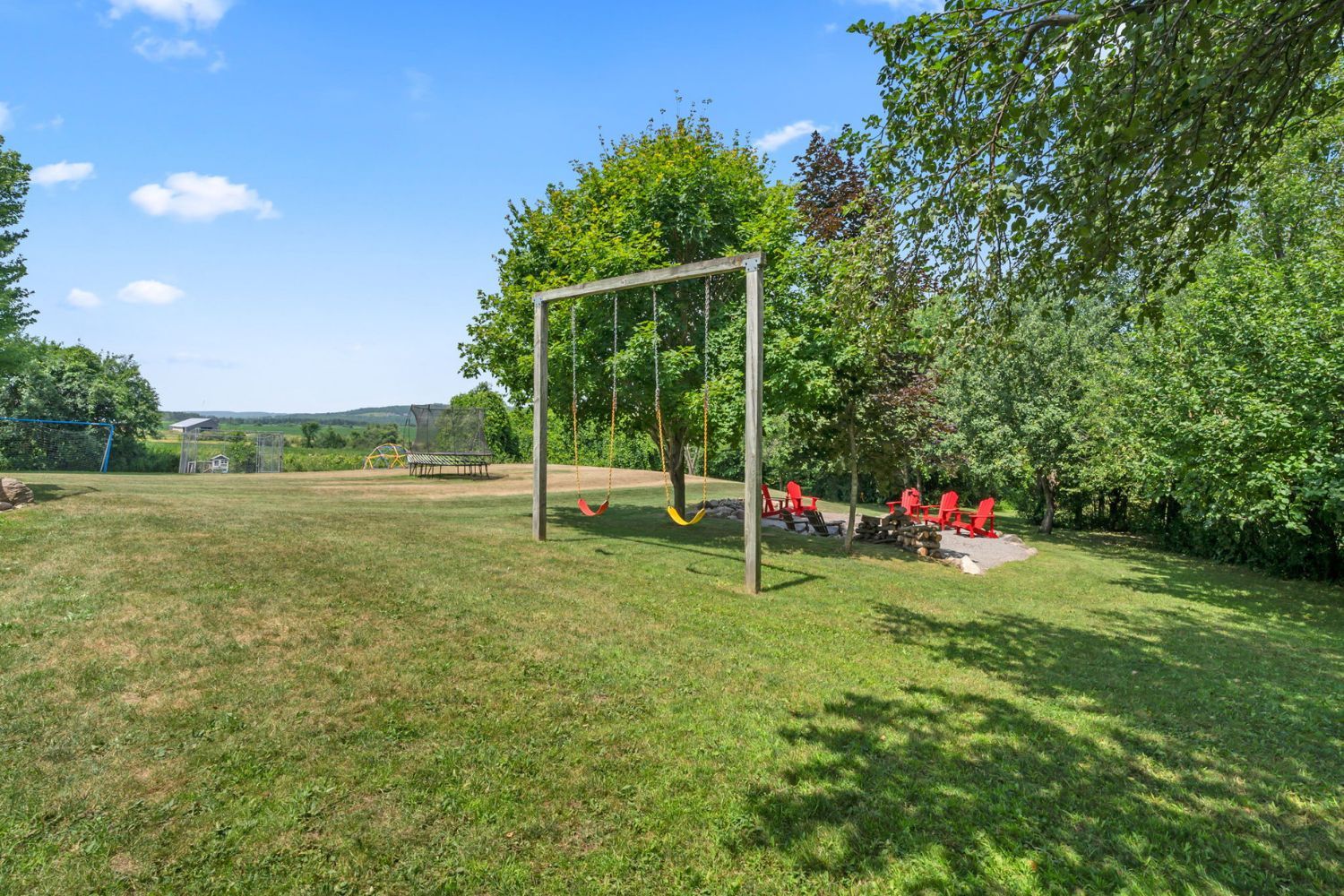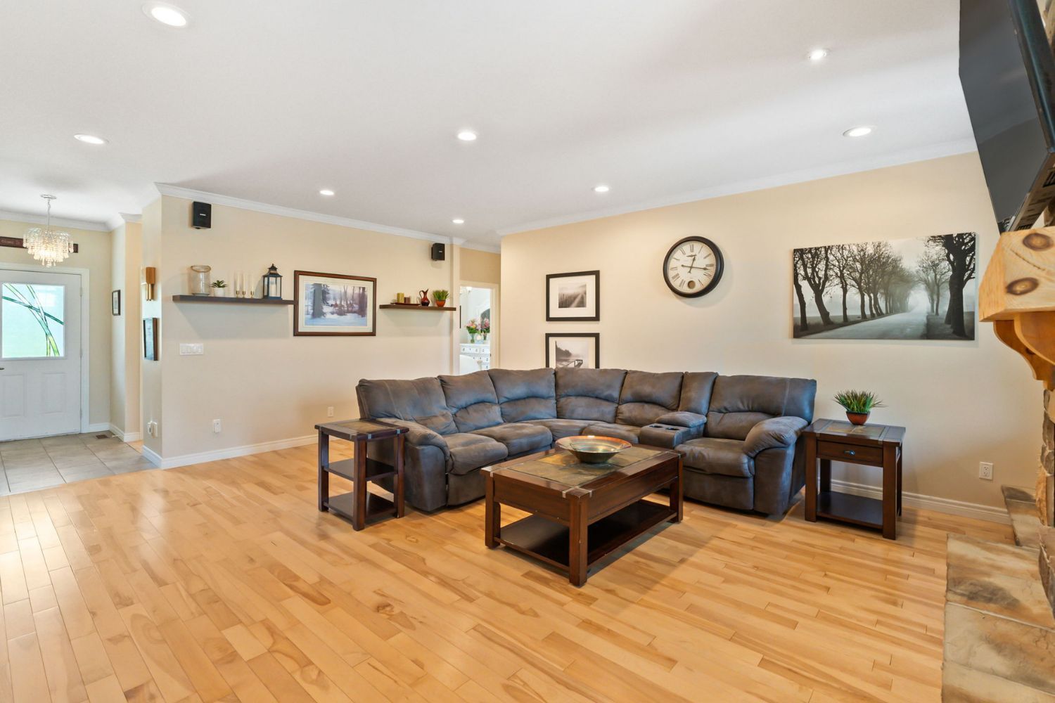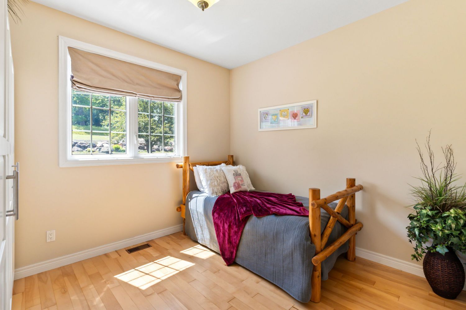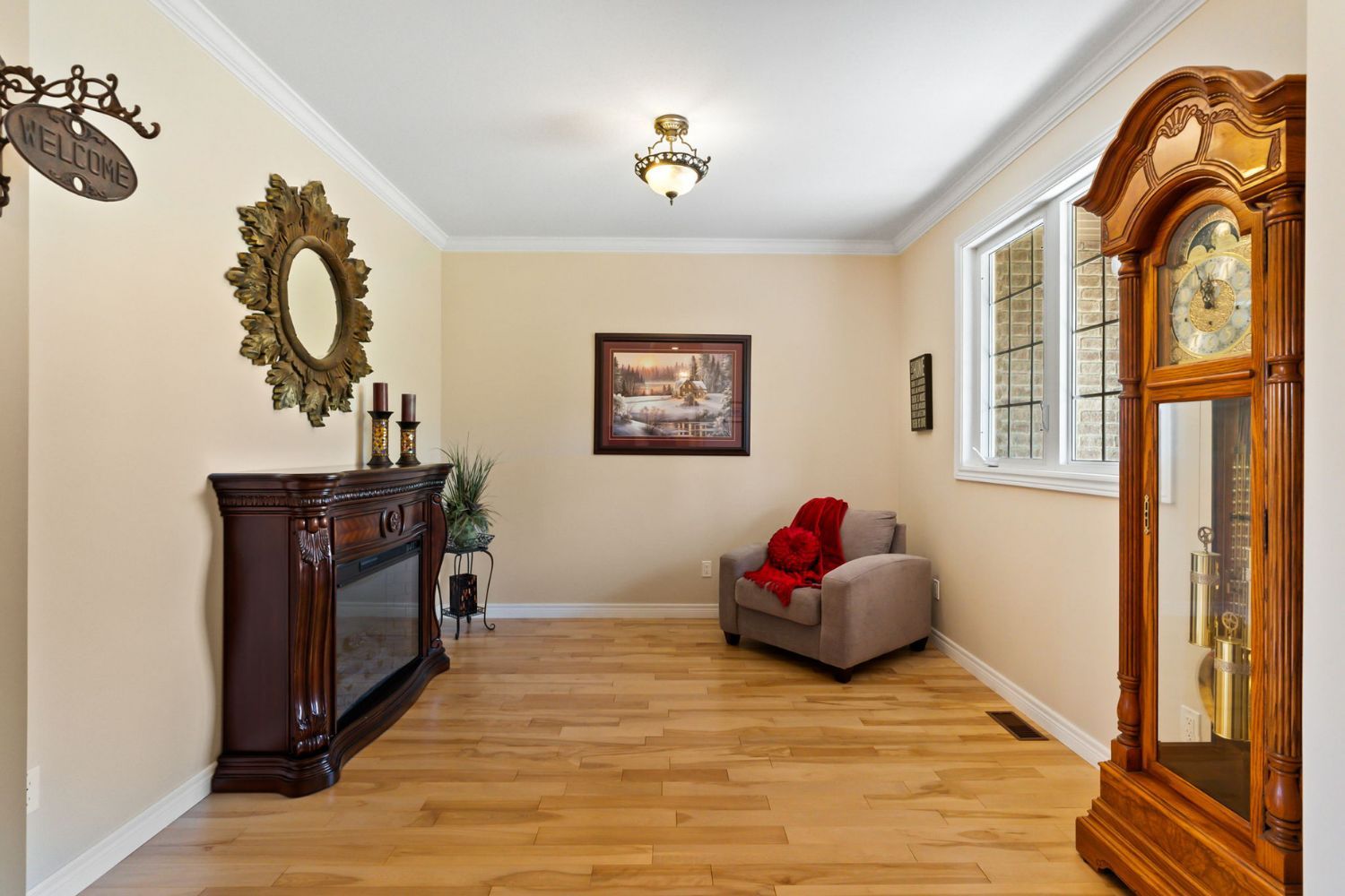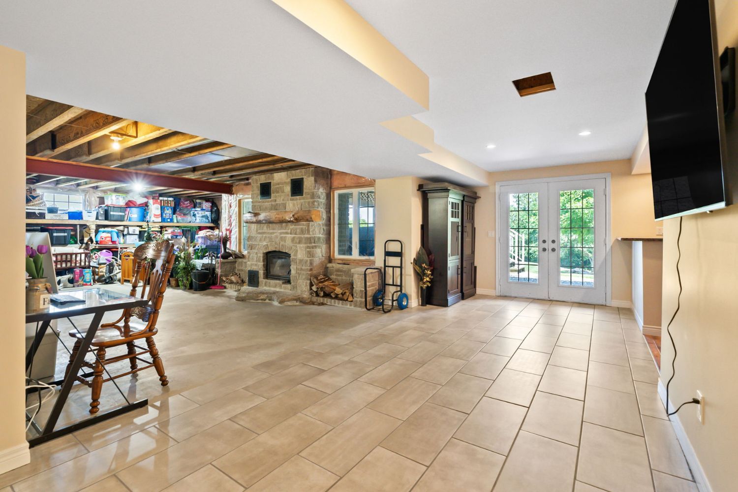Impressive custom brick/stone bungalow, boasting over 2500 sf of luxurious living space on the main level plus full walkout basement and attached heated 3-car garage with 2 overhead doors. Nestled on an expansive 1. 74 acres, this home offers a serene lifestyle with panoramic views overlooking farmlands and the cavan hills, complete with a spring-fed pond, ranging from 10-14 ft deep. As you enter the front foyer, there is a convenient den plus the grandeur of a spacious great room, accentuated by a striking stone fireplace and a unique waffle-patterned feature wall. Gleaming hardwood floors flow throughout the home with an abundance of crown mouldings and pot lights. The chef's kitchen is a culinary delight, equipped with stainless steel appliances, a granite countertop, ceramic backsplash, and an island with a veggie sink. The adjacent large dining area opens onto a generous deck, designed with tempered regal glass for unobstructed views of the backyard and fire pit area, ideal for entertaining friends and family. The main floor features 4 well-appointed bedrooms, including a primary suite that includes a walkout to the deck, a luxurious 5-pc ensuite with dual sinks, a separate shower and a whirlpool tub, all complemented by a stylish barn door privacy feature. The primary suite also boasts a walk-in closet with built-in shelving for optimal organization. Two of the additional bedrooms share a convenient jack and jill bathroom, while a third bedroom is situated near the 2-pc powder room. The walkout basement includes large above-grade windows that flood the space with natural light, a cozy family room complete with an electric infinity fireplace and a dry bar, 3-pc washroom and a huge open area with extra plumbing rough-ins, perfect for customization. The basement also features ample storage, making it an excellent option for a multi-generational living arrangement with its separate entrances and walkout basement.