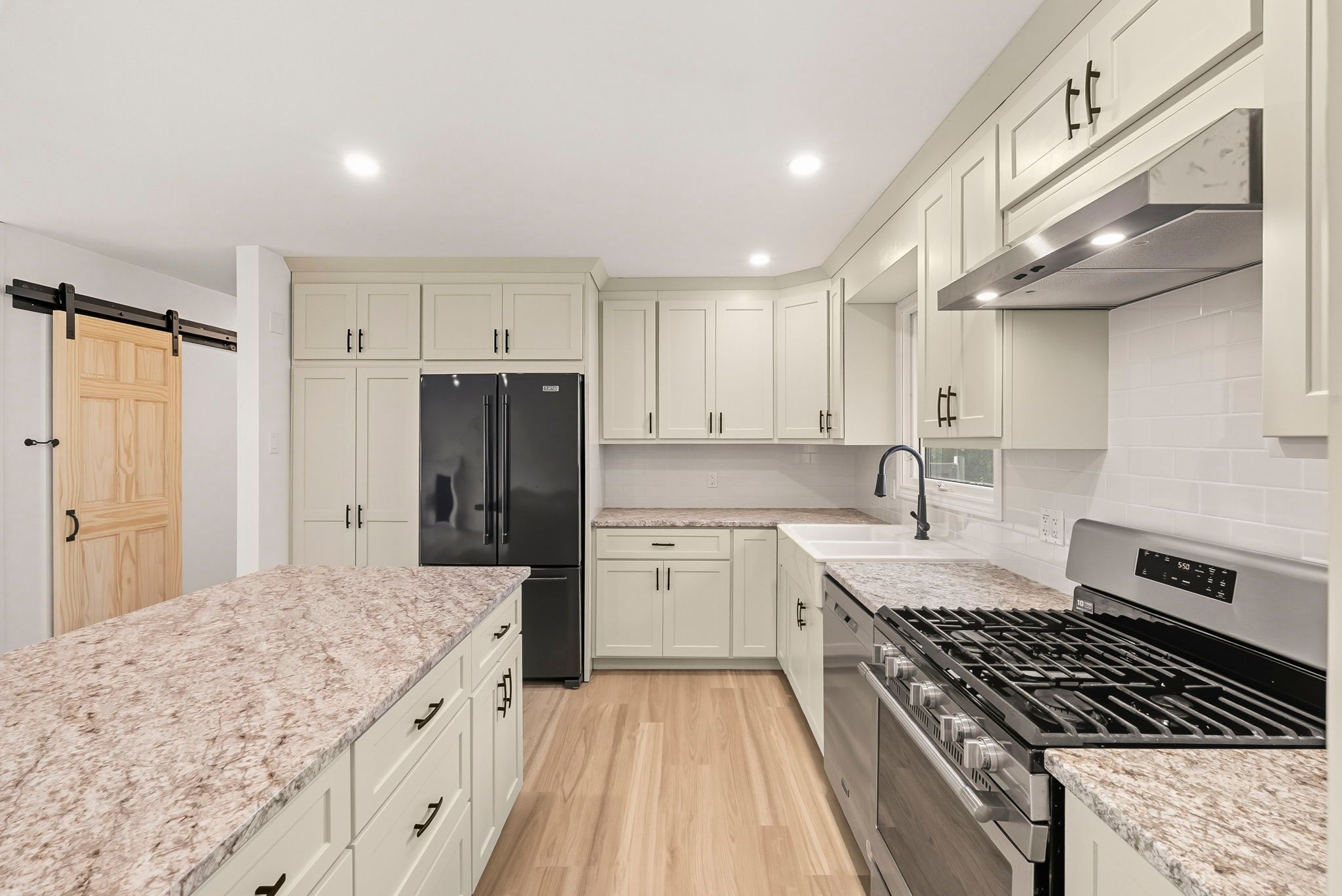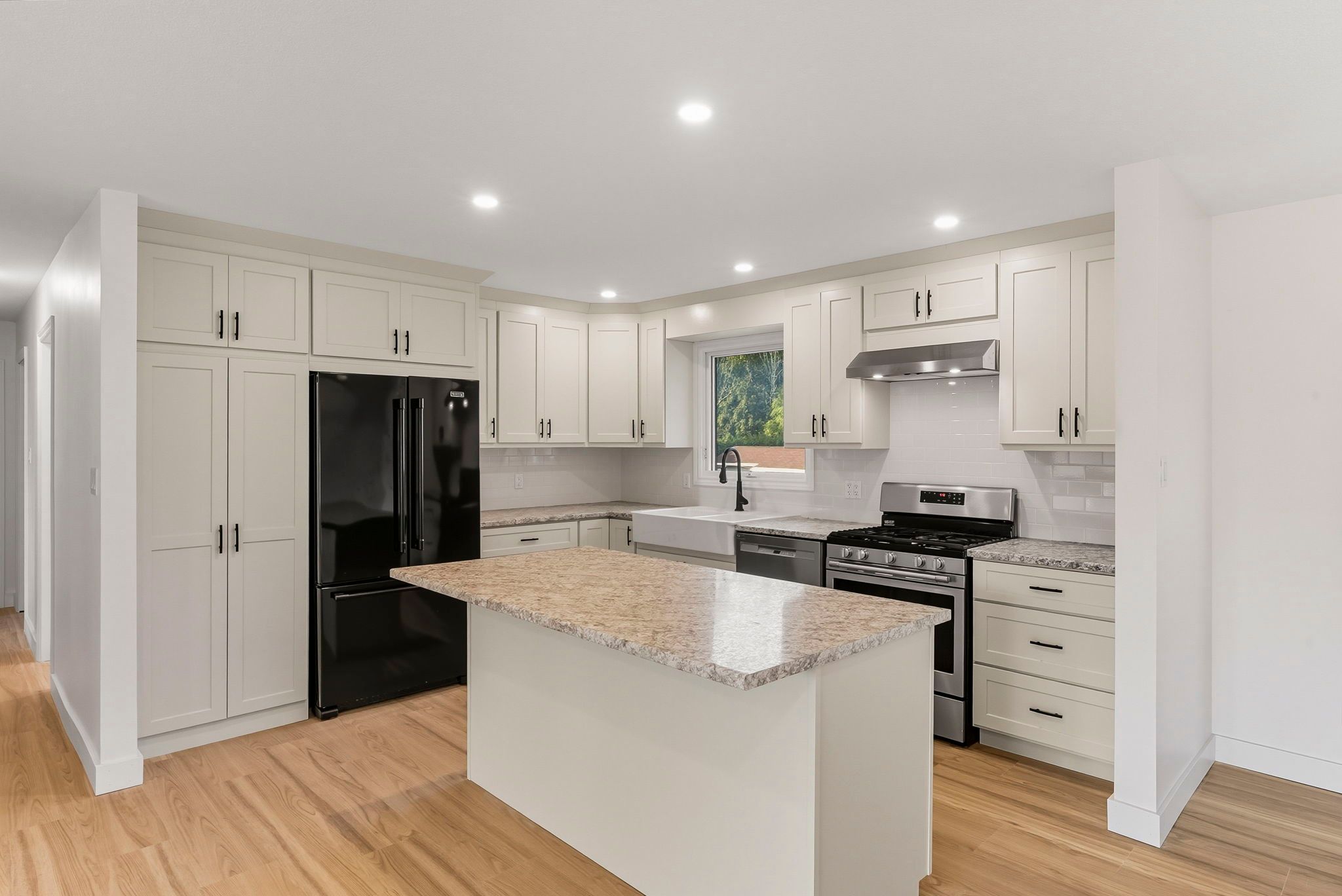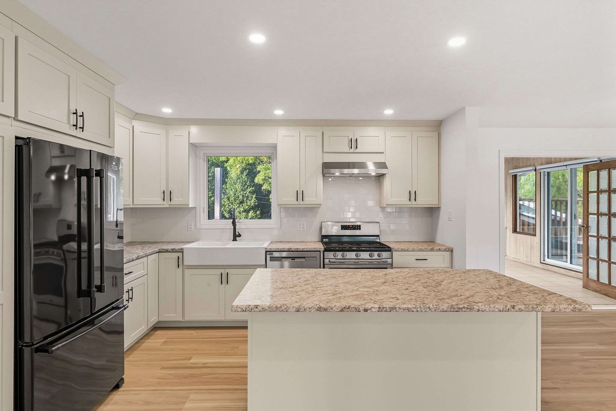 • Custom Mennonite-made kitchen with open-concept living and dining areas.