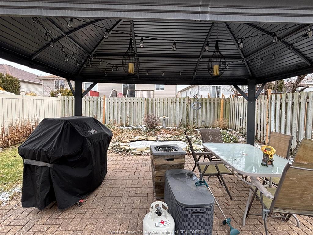 • Fenced backyard featuring a pond and a covered patio.