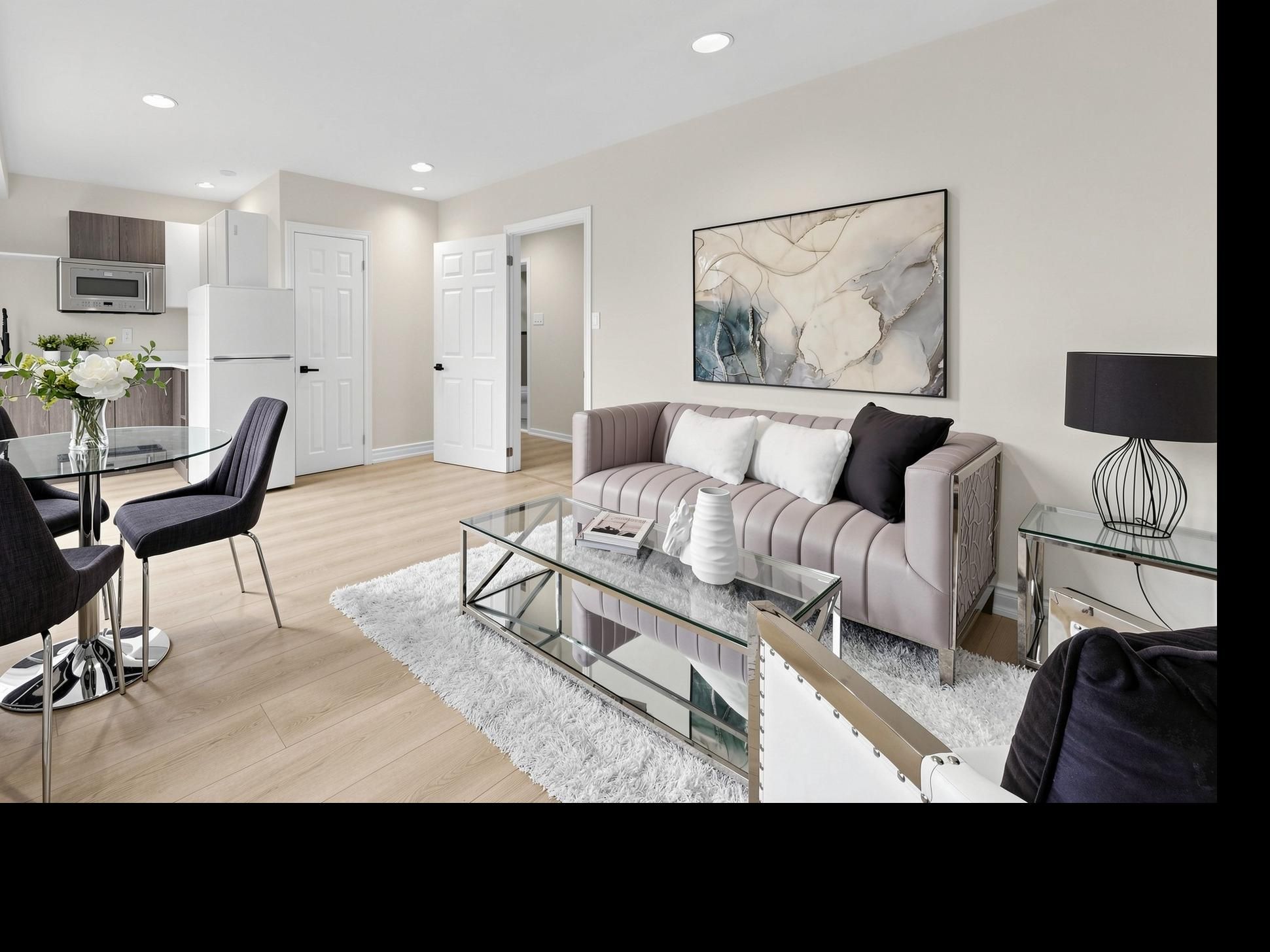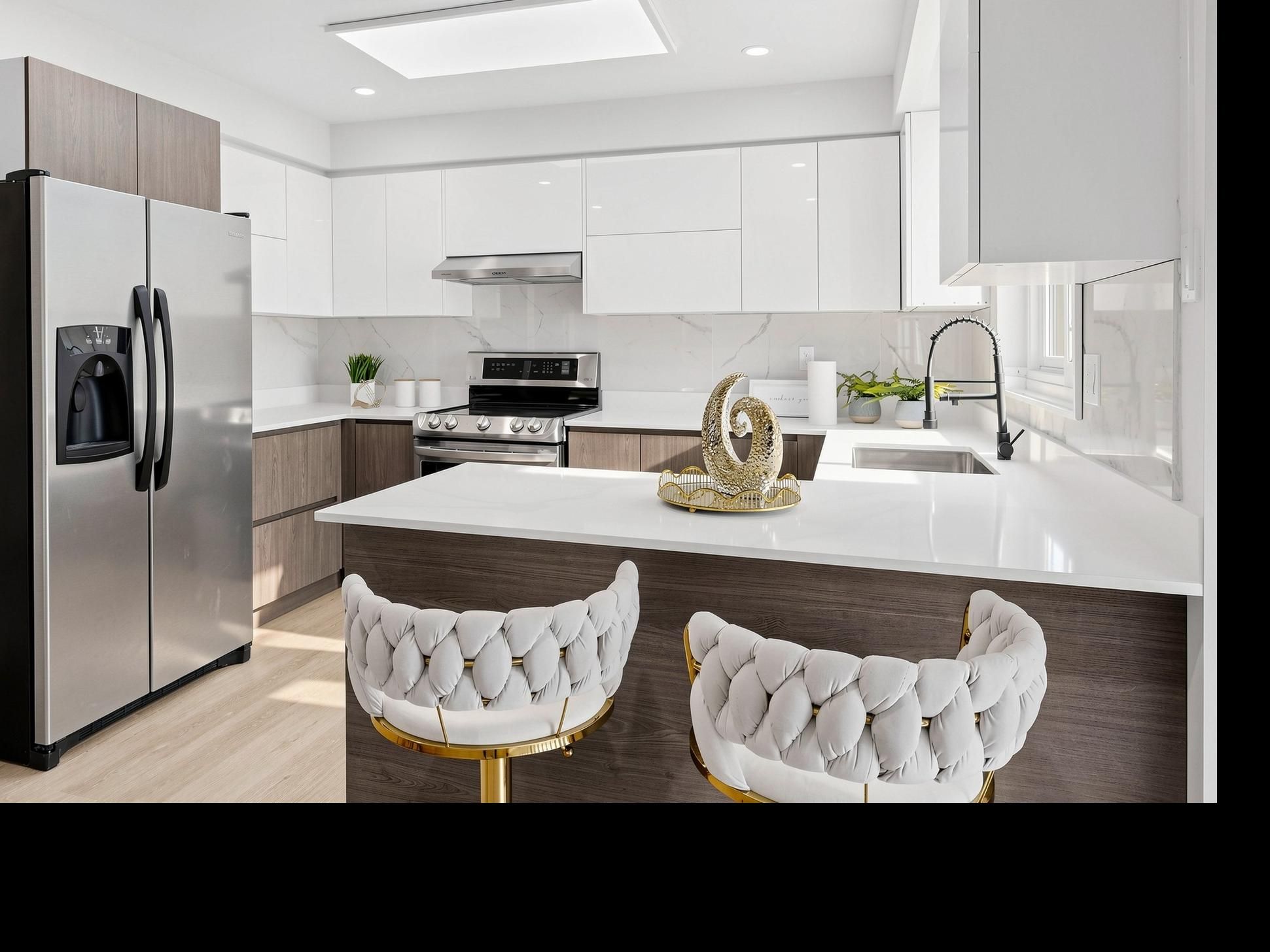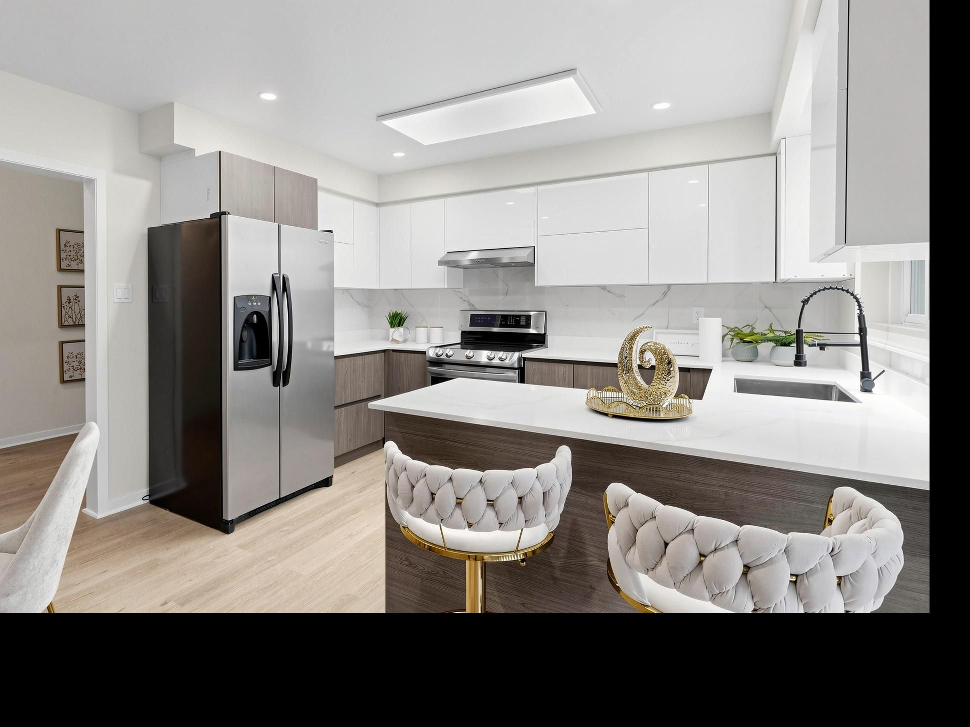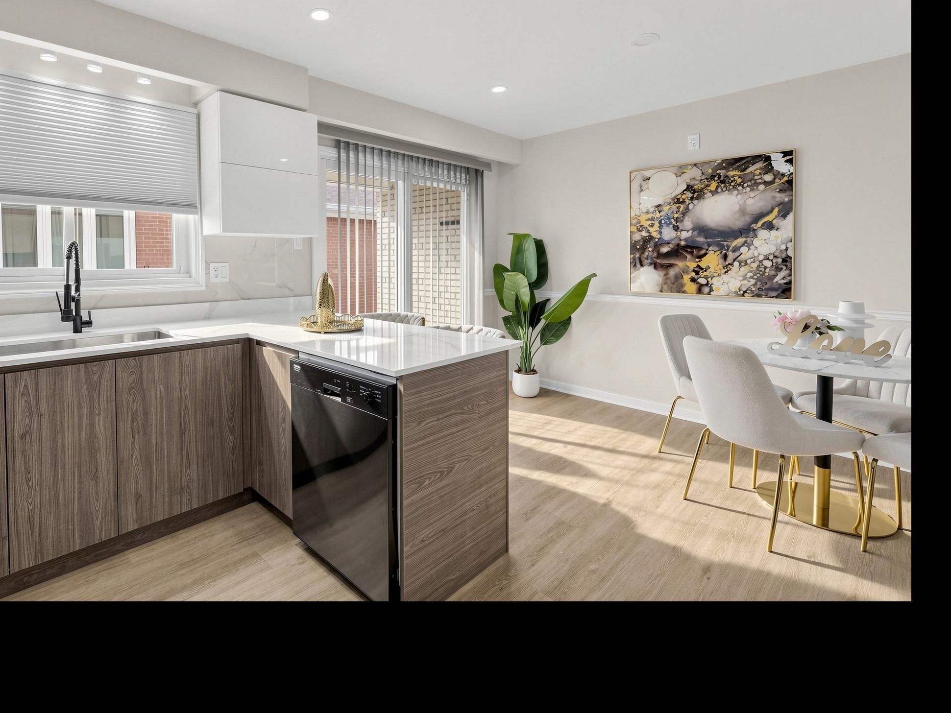 • Bright walk-out level with floor-to-ceiling windows and modern kitchen.