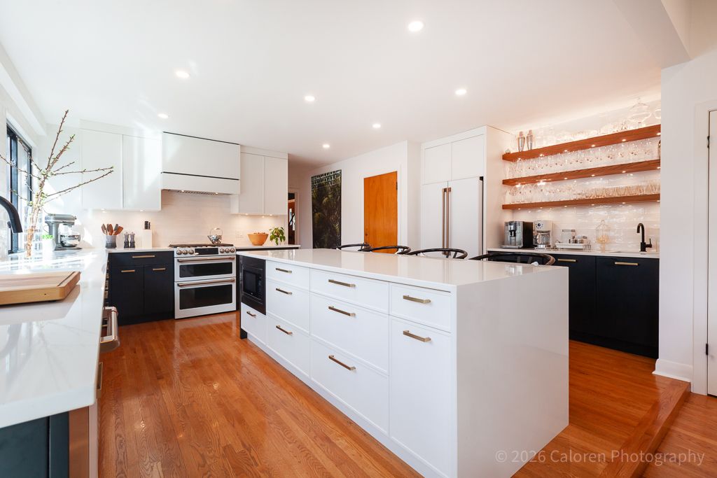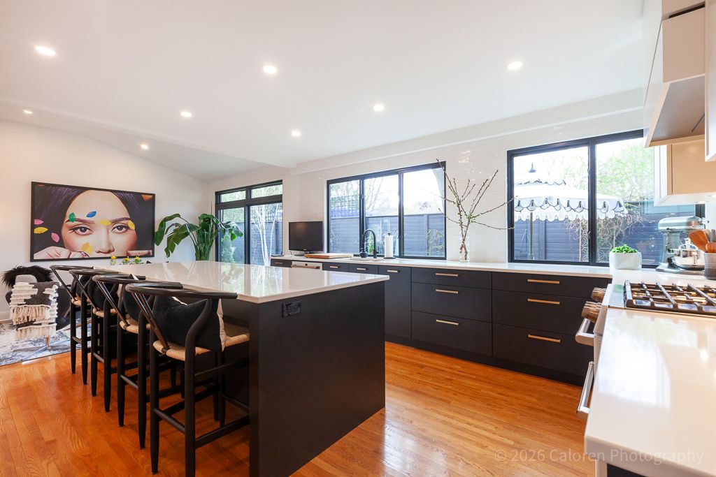 • Sleek kitchen with quartz counters, oversized island, and premium appliances.