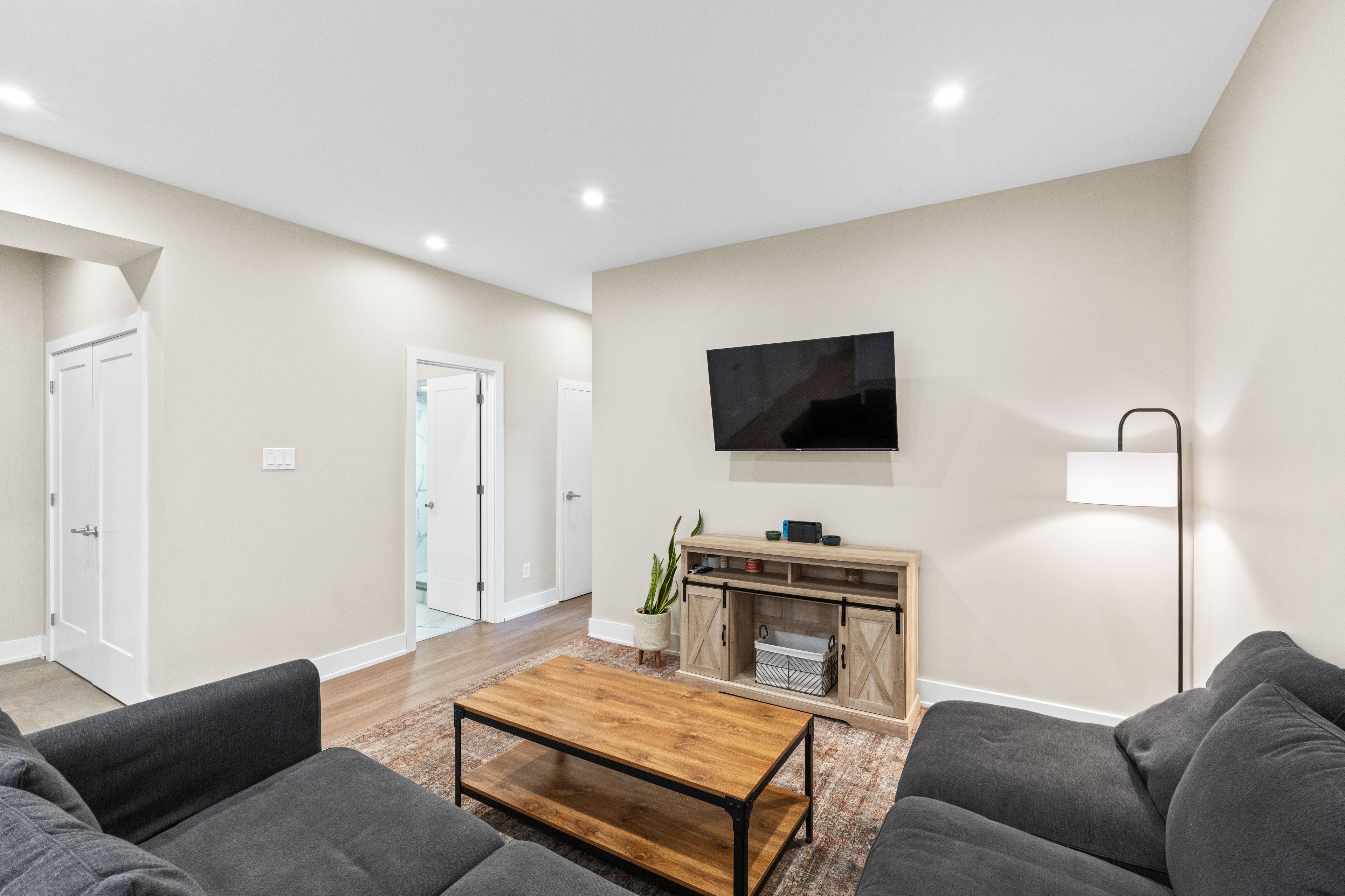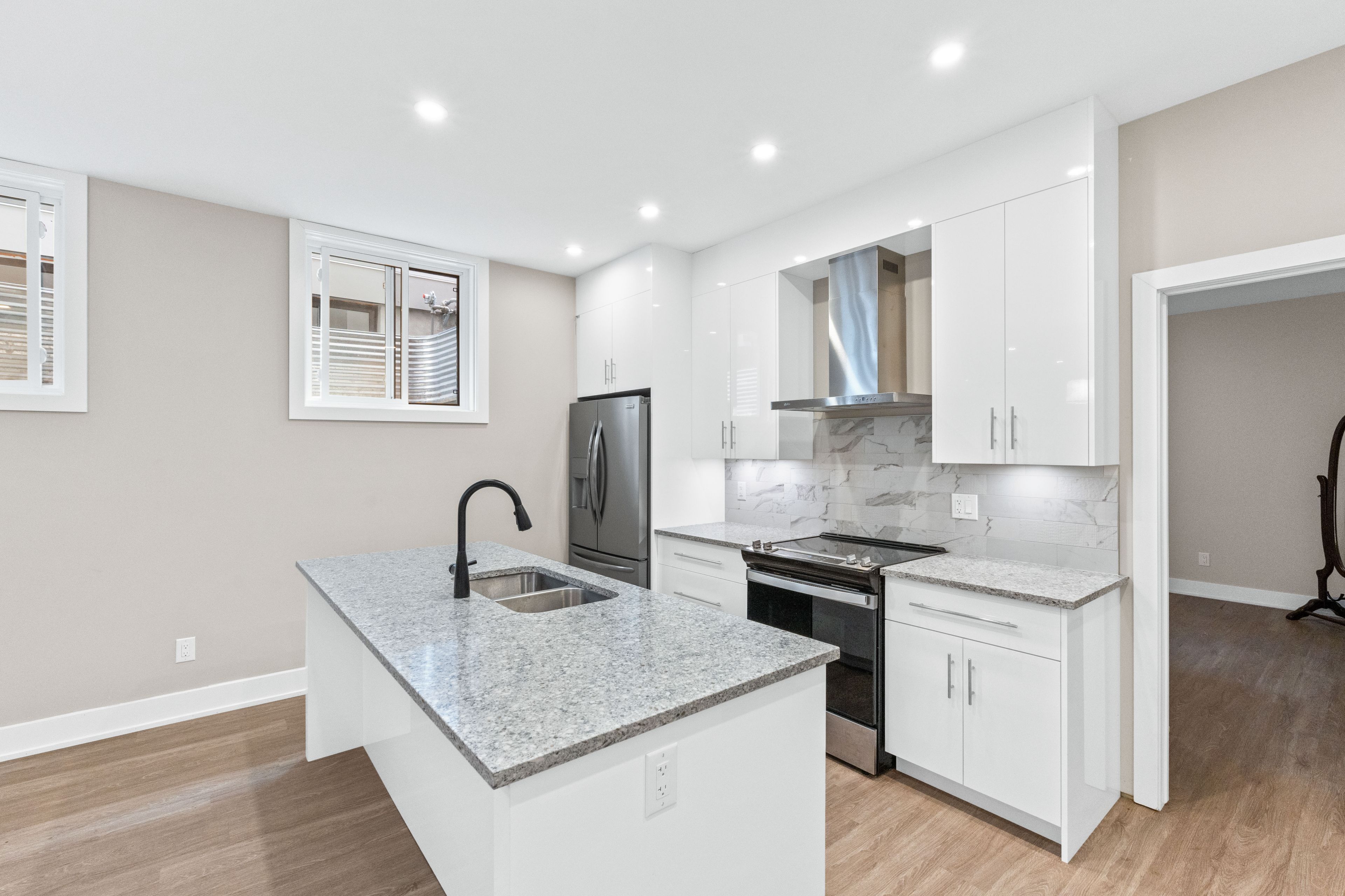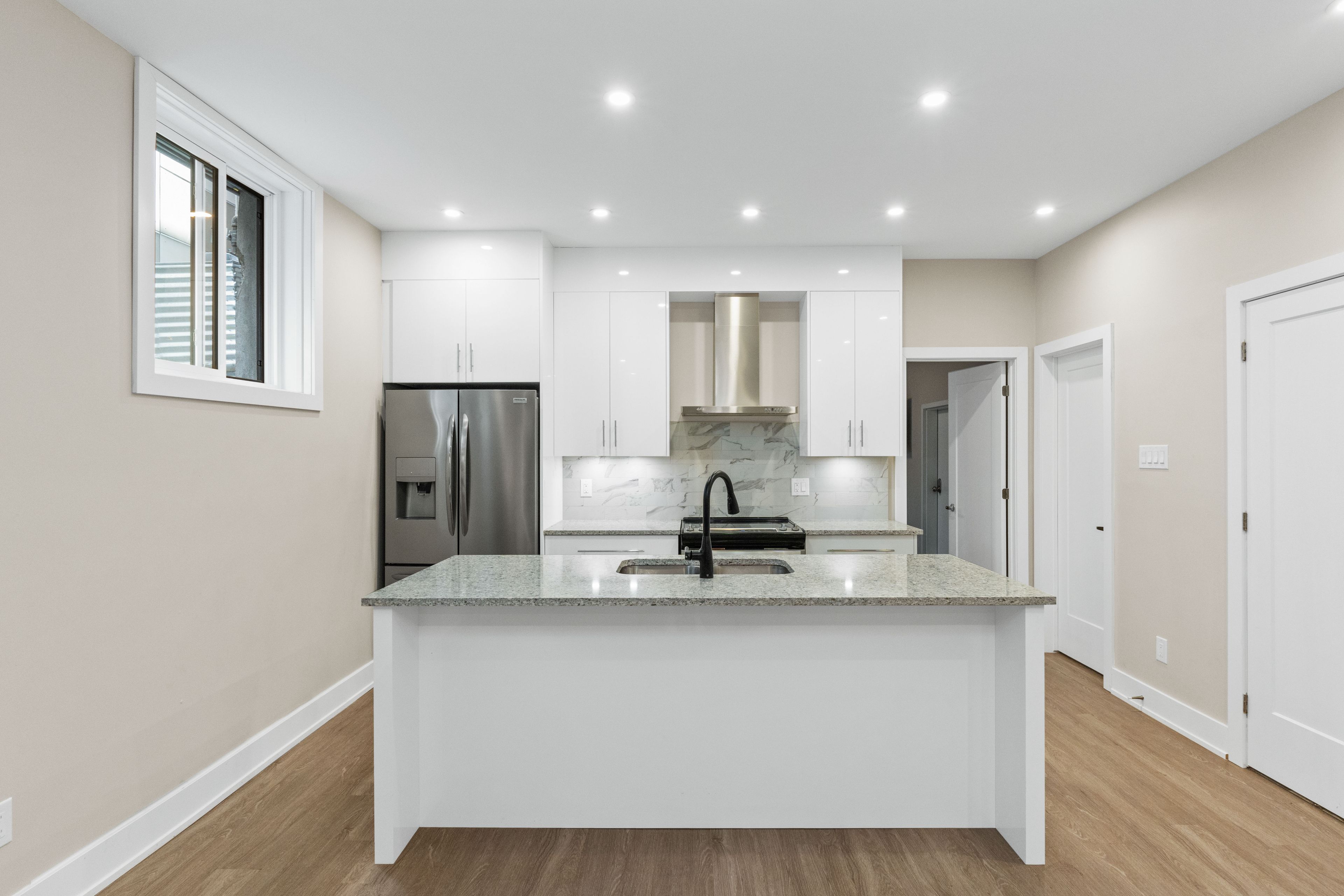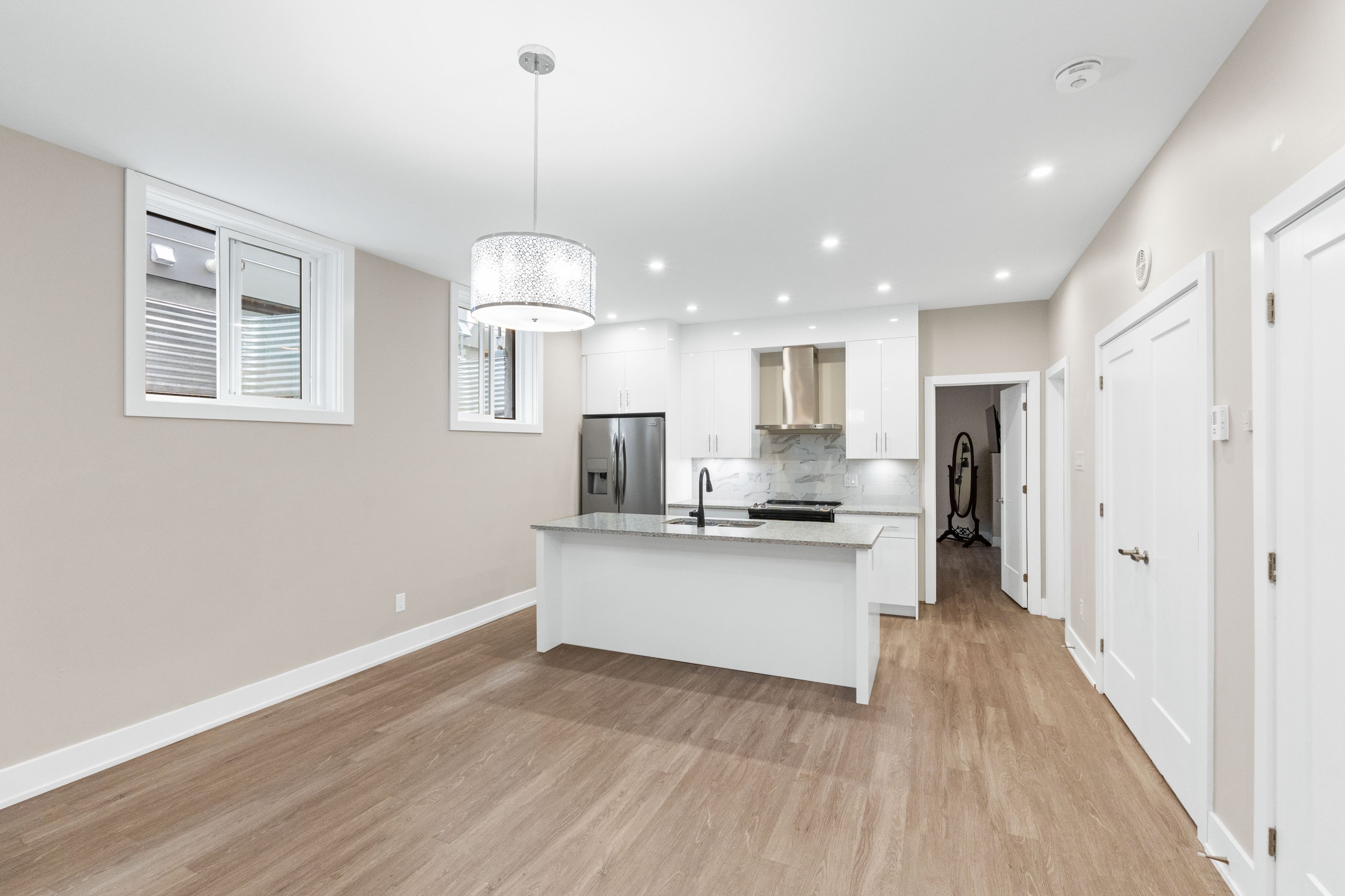 • Bright open-concept area with LED lighting and in-unit laundry.
