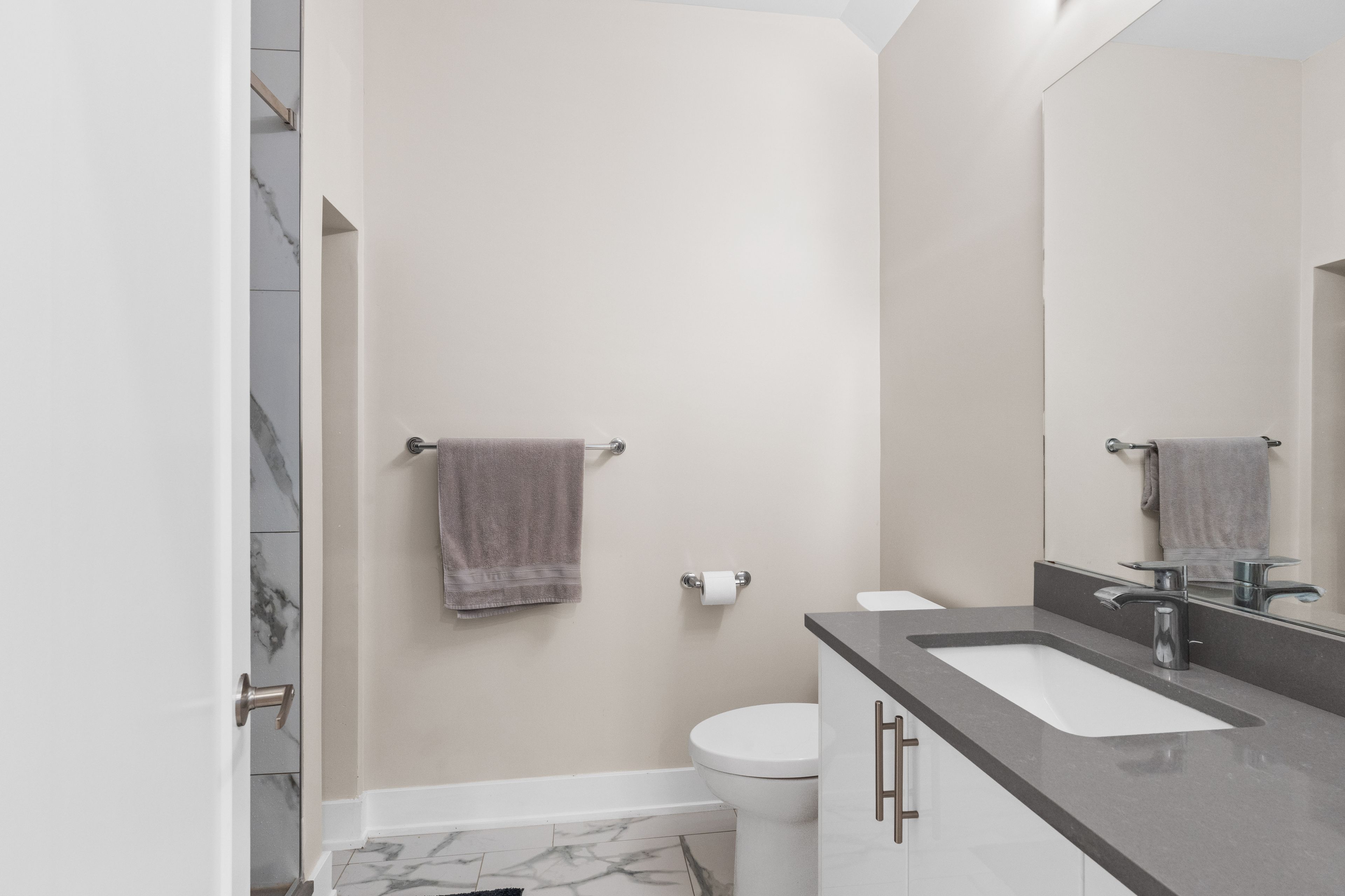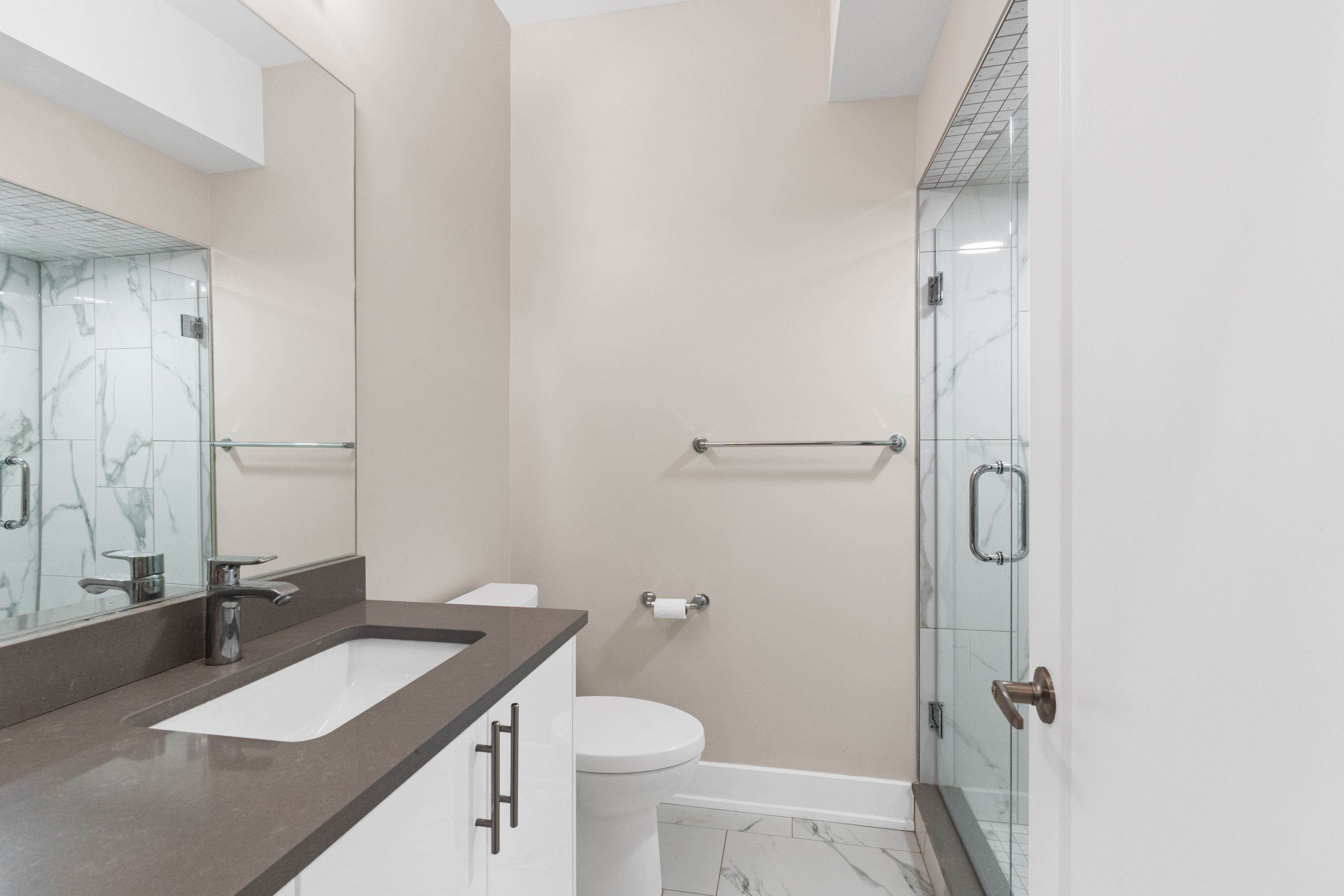 • Modern kitchen with stainless steel appliances and quartz countertops.