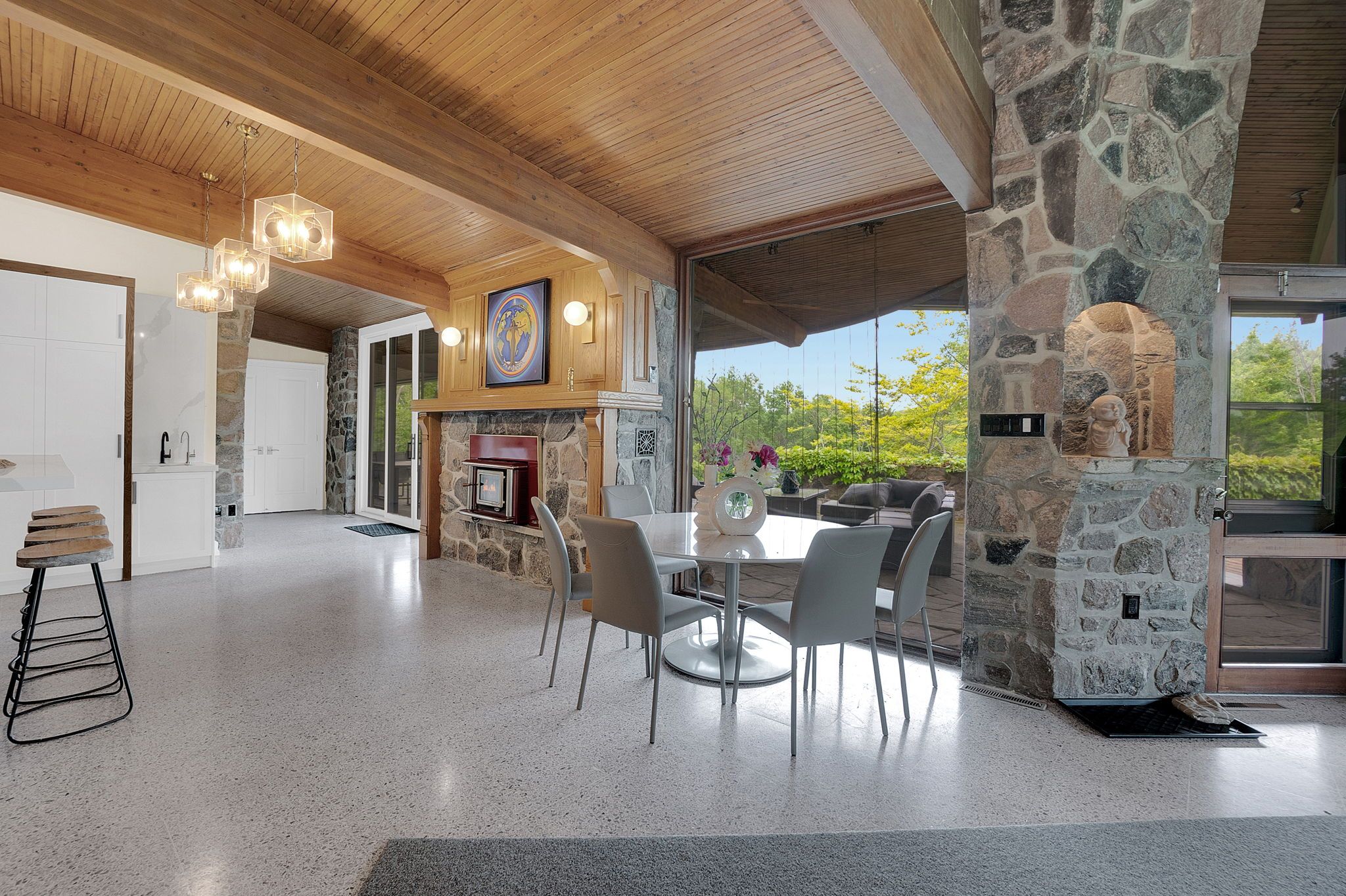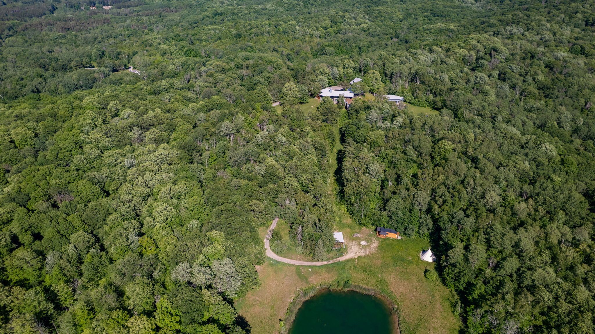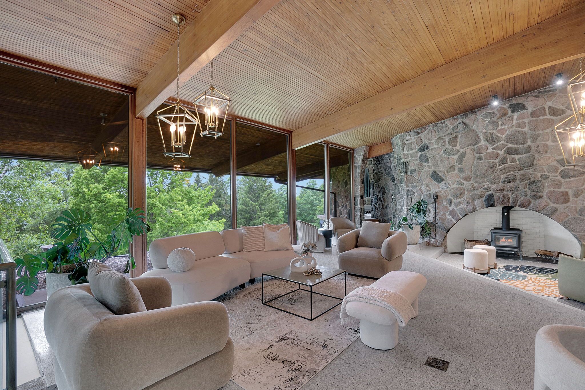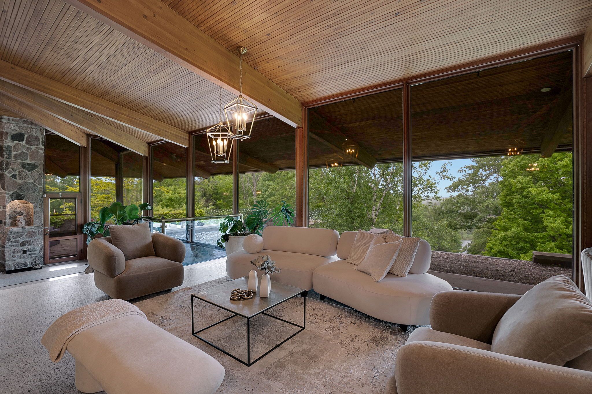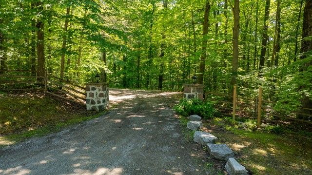 Welcome to an extraordinary estate tucked away behind welcoming stone pillars and a winding forested driveway! This is a work of art designed by the legendary grant whatmough and gardiner cowan, with distinctive frank lloyd wright style of architecture. This iconic mid-century modern residence is gracefully integrated into 32 acres of majestic land, where nature and architecture exist in perfect harmony. From the moment you approach the stunning entry door, you're drawn into a world of timeless design and serene beauty. This home is lovingly maintained with extensive renovations, while preserving the character and soul of this home, including floor-to-ceiling windows bring the outdoors in, stone fireplaces indoor and out, original stone walls and impressive wood beams throughout. Spanning approximately 5,000 sq ft, the main residence features 6 bedrooms, 7 bathrooms, an office, a meditation room, and a separate nanny suite. Multiple terraces and decks surround the home, offering breathtaking views of the land, and a tranquil lake creating the feel of a private luxury retreat. This property features a rare second home- fully renovated and approximately 3,500 sq ft-offering 3 bedrooms, 4 bathrooms, and a massive loft space! This second home is ideal for an extended family! There is an additional yoga studio with an outdoor shower! A detached garage/ workshop, a charming cedar cabin with sauna and cold plunge, a covered cabana for entertaining or relaxing on the property. This is a once-in-a-lifetime opportunity to own an architecturally significant estate in the prestigious king township. With unmatched privacy, lush surroundings, and two beautifully appointed homes, this property is truly a timeless work of art. Don't miss it!