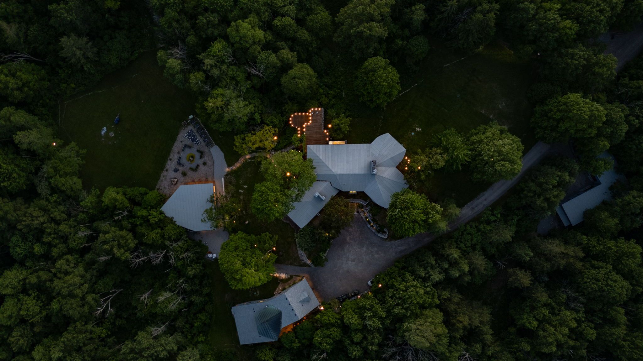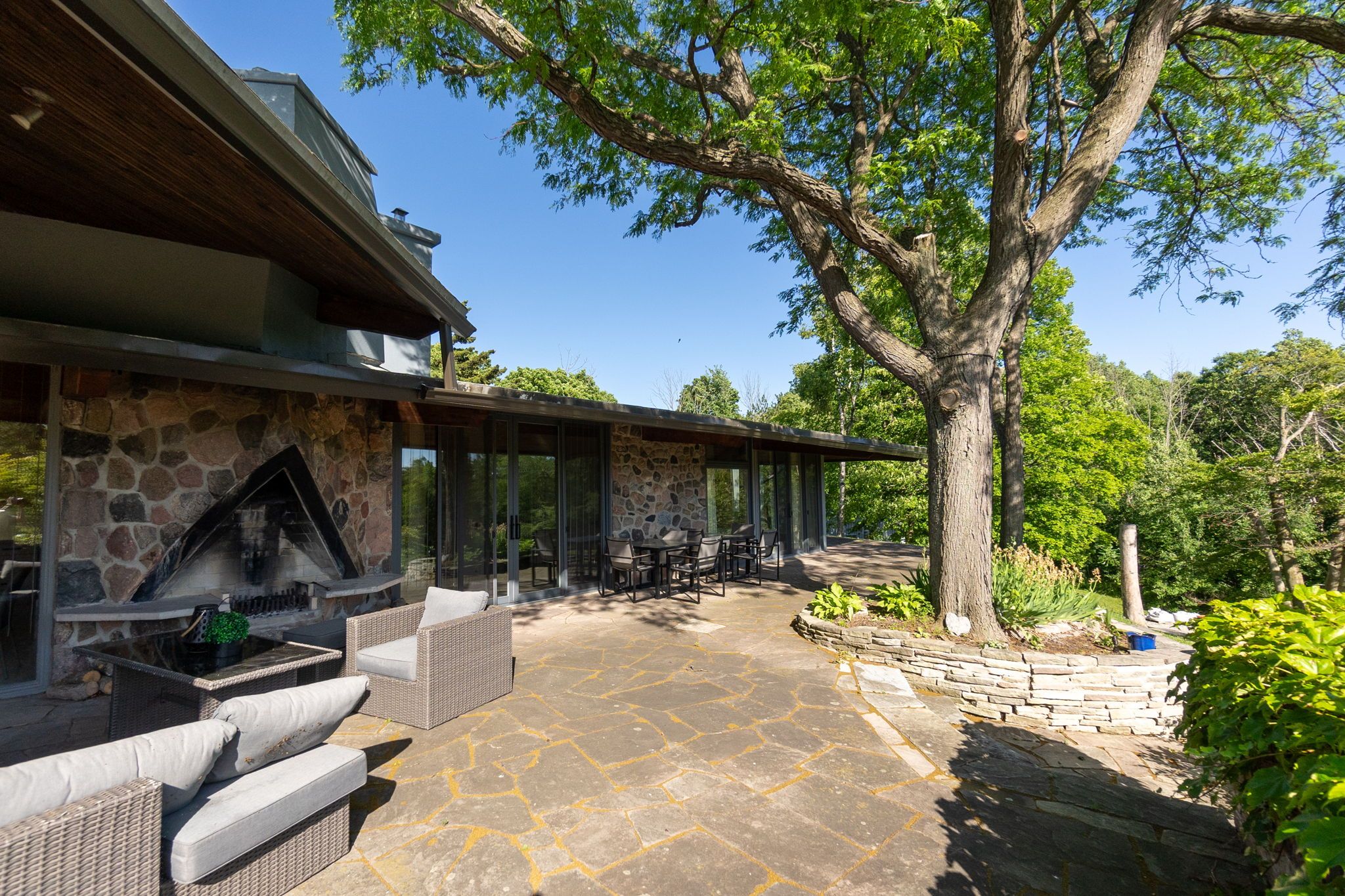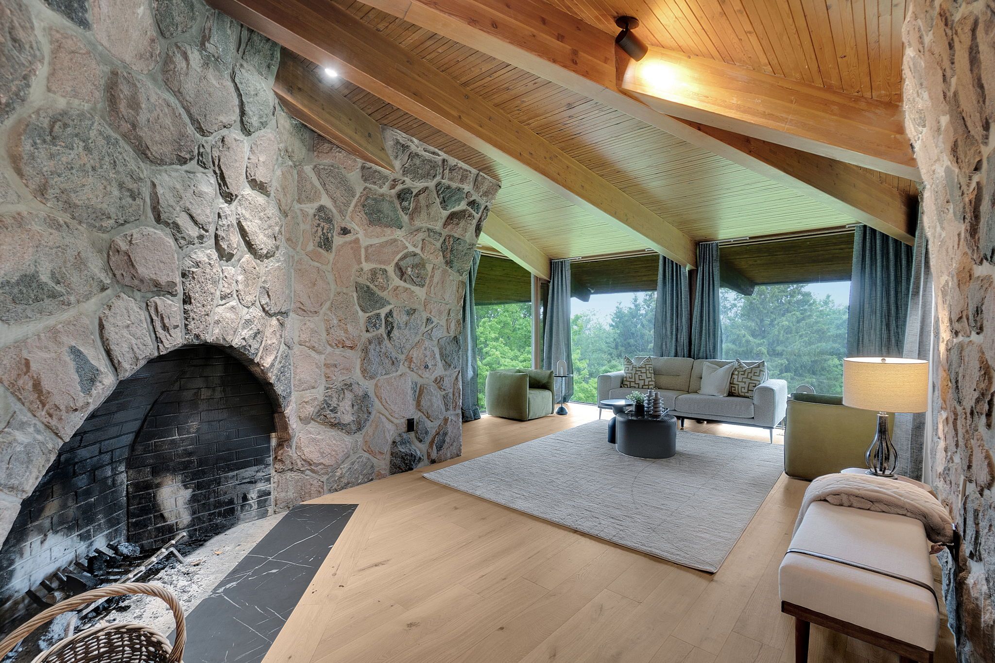 Welcome to an extraordinary estate tucked away behind welcoming stone pillars and a winding forested driveway! This is a work of art designed by the legendary grant whatmough and gardiner cowan, with distinctive frank lloyd wright style of architecture. This iconic mid-century modern residence is gracefully integrated into 32 acres of majestic land, where nature and architecture exist in perfect harmony. From the moment you approach the stunning entry door, you're drawn into a world of timeless design and serene beauty. This home is lovingly maintained with extensive renovations, while preserving the character and soul of this home, including floor-to-ceiling windows bring the outdoors in, stone fireplaces indoor and out, original stone walls and impressive wood beams throughout. Spanning approximately 5,000 sq ft, the main residence features 6 bedrooms, 7 bathrooms, an office, a meditation room, and a separate nanny suite. Multiple terraces and decks surround the home, offering breathtaking views of the land, and a tranquil lake creating the feel of a private luxury retreat. This property features a rare second home- fully renovated and approximately 3,500 sq ft-offering 3 bedrooms, 4 bathrooms, and a massive loft space! This second home is ideal for an extended family! There is an additional yoga studio with an outdoor shower! A detached garage/ workshop, a charming cedar cabin with sauna and cold plunge, a covered cabana for entertaining or relaxing on the property. This is a once-in-a-lifetime opportunity to own an architecturally significant estate in the prestigious king township. With unmatched privacy, lush surroundings, and two beautifully appointed homes, this property is truly a timeless work of art. Don't miss it!