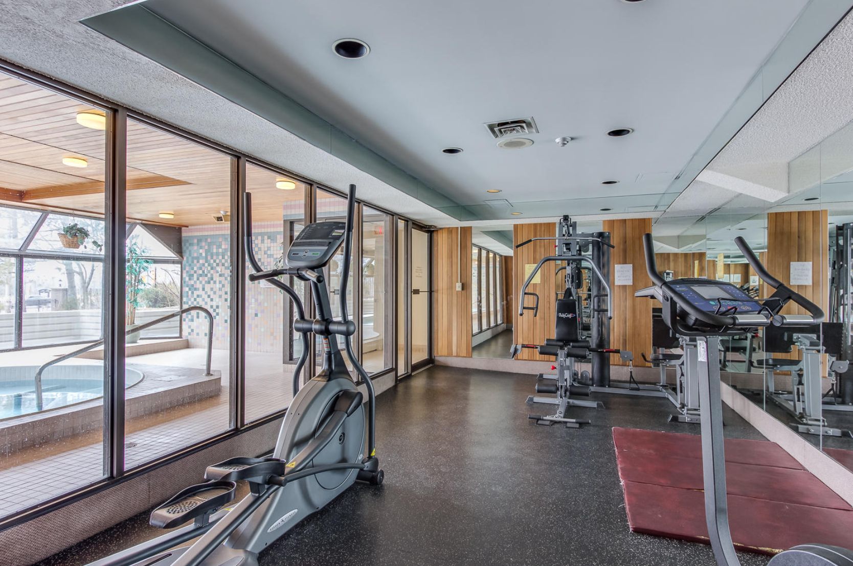 • Building amenities include an indoor pool, gym, and recreational areas.