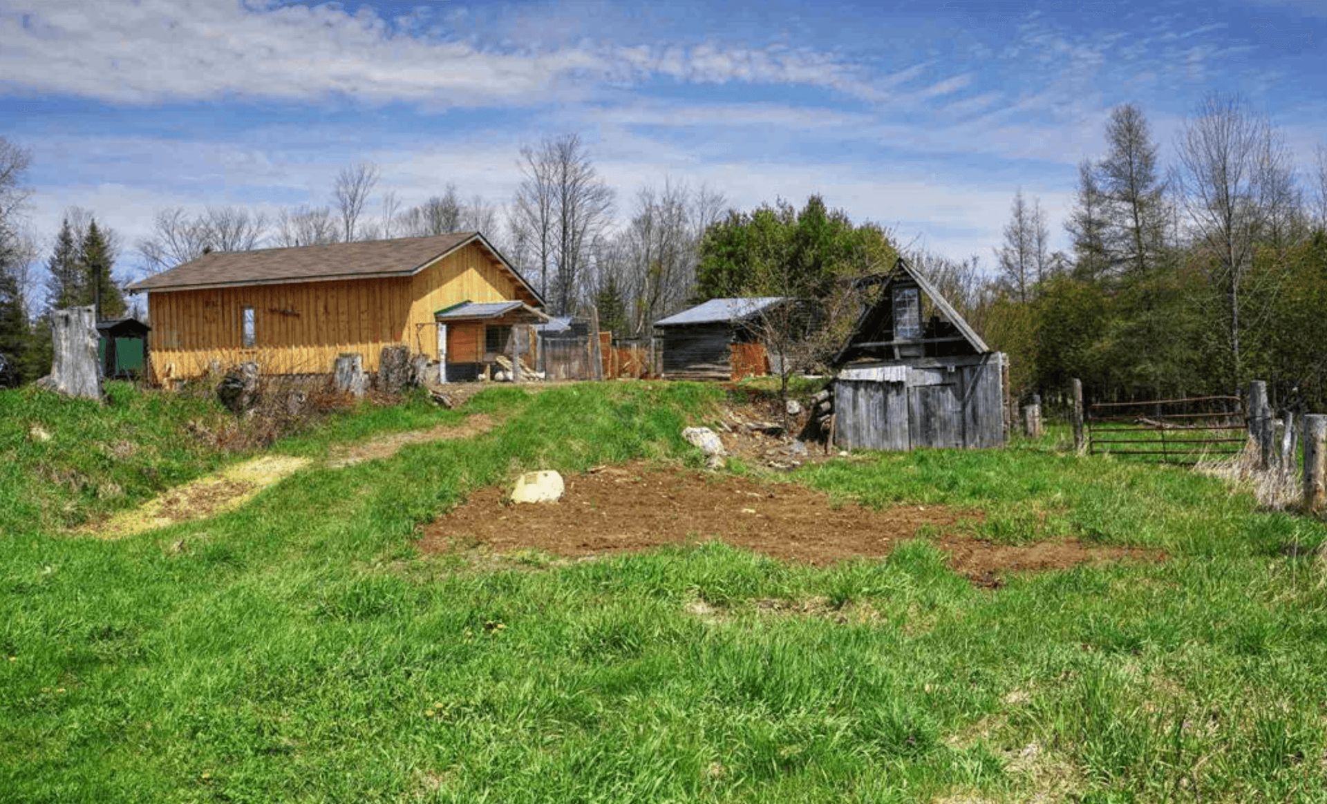 • Multiple outbuildings including a barn and two chicken coops.