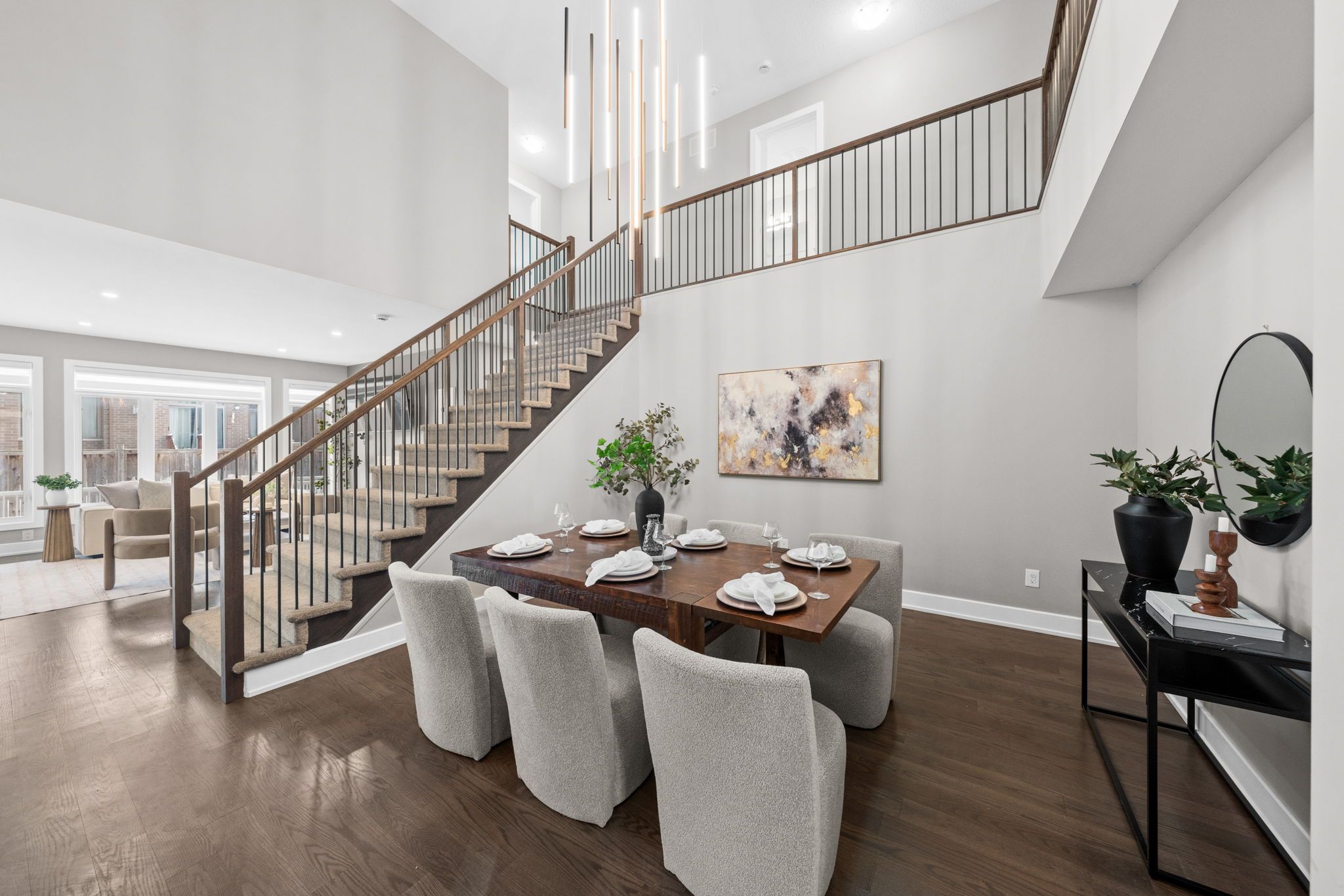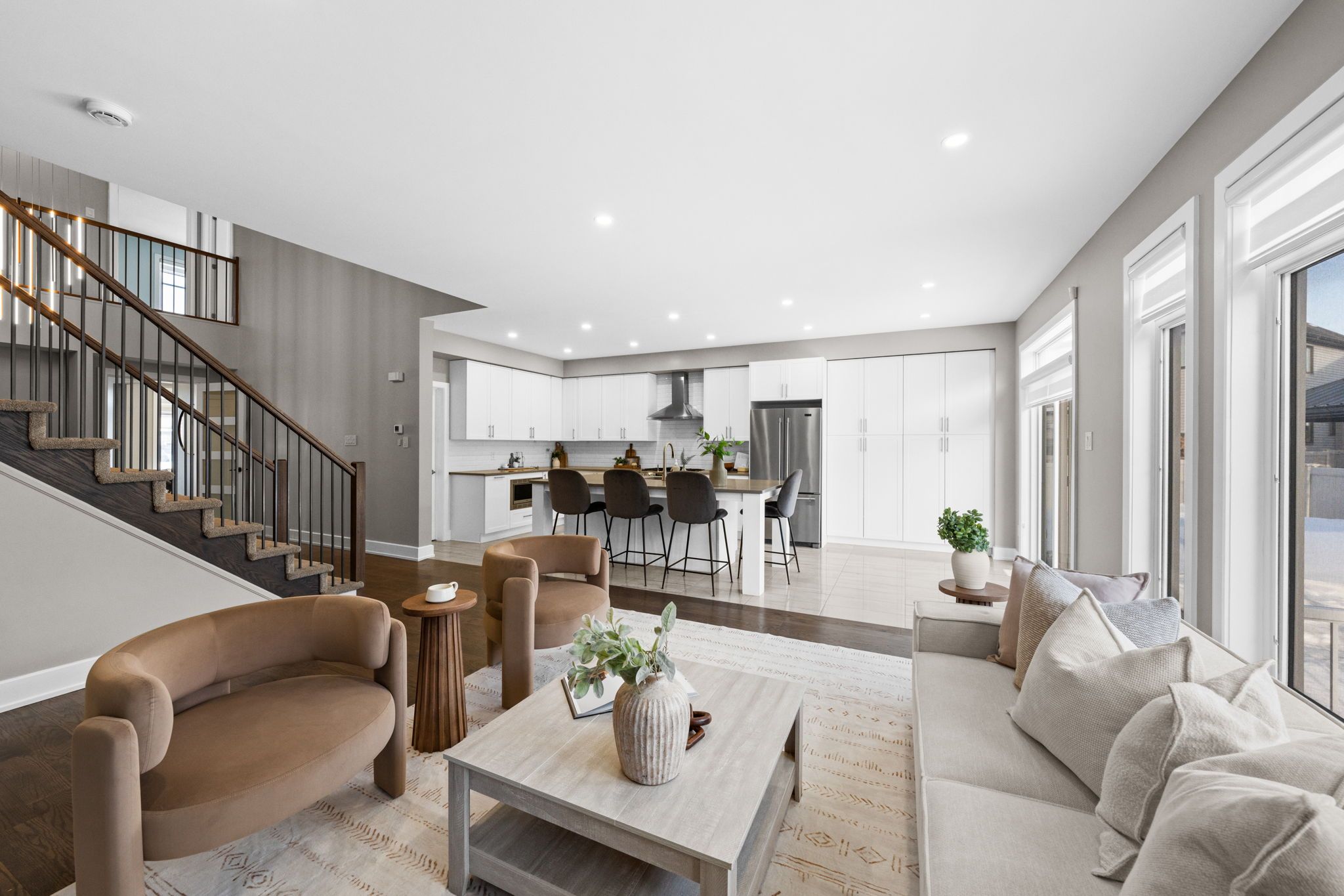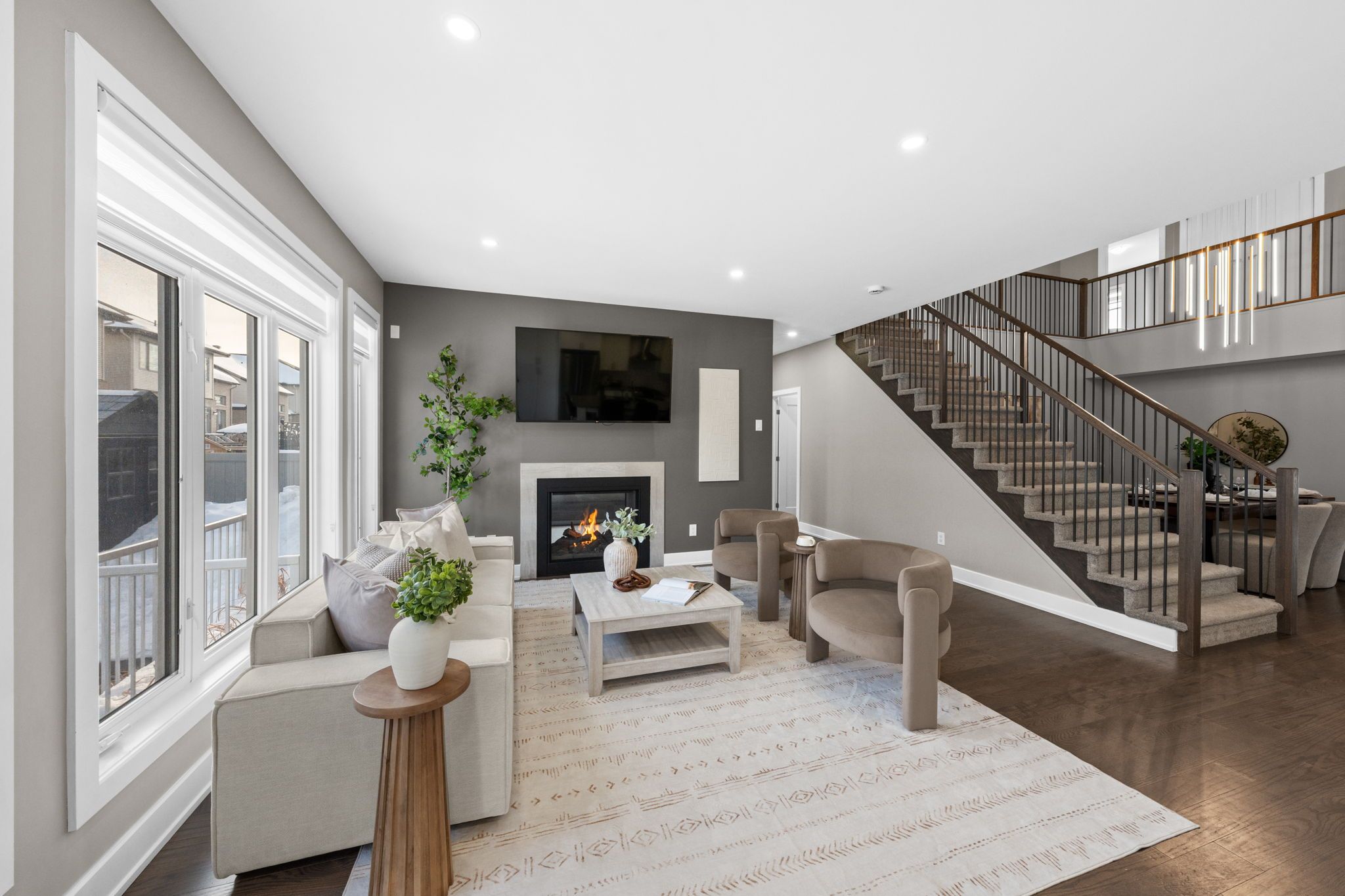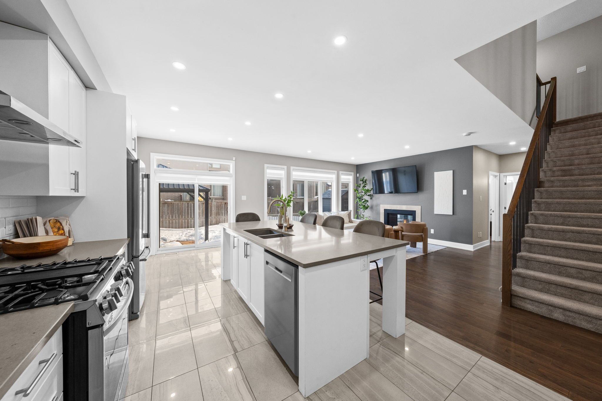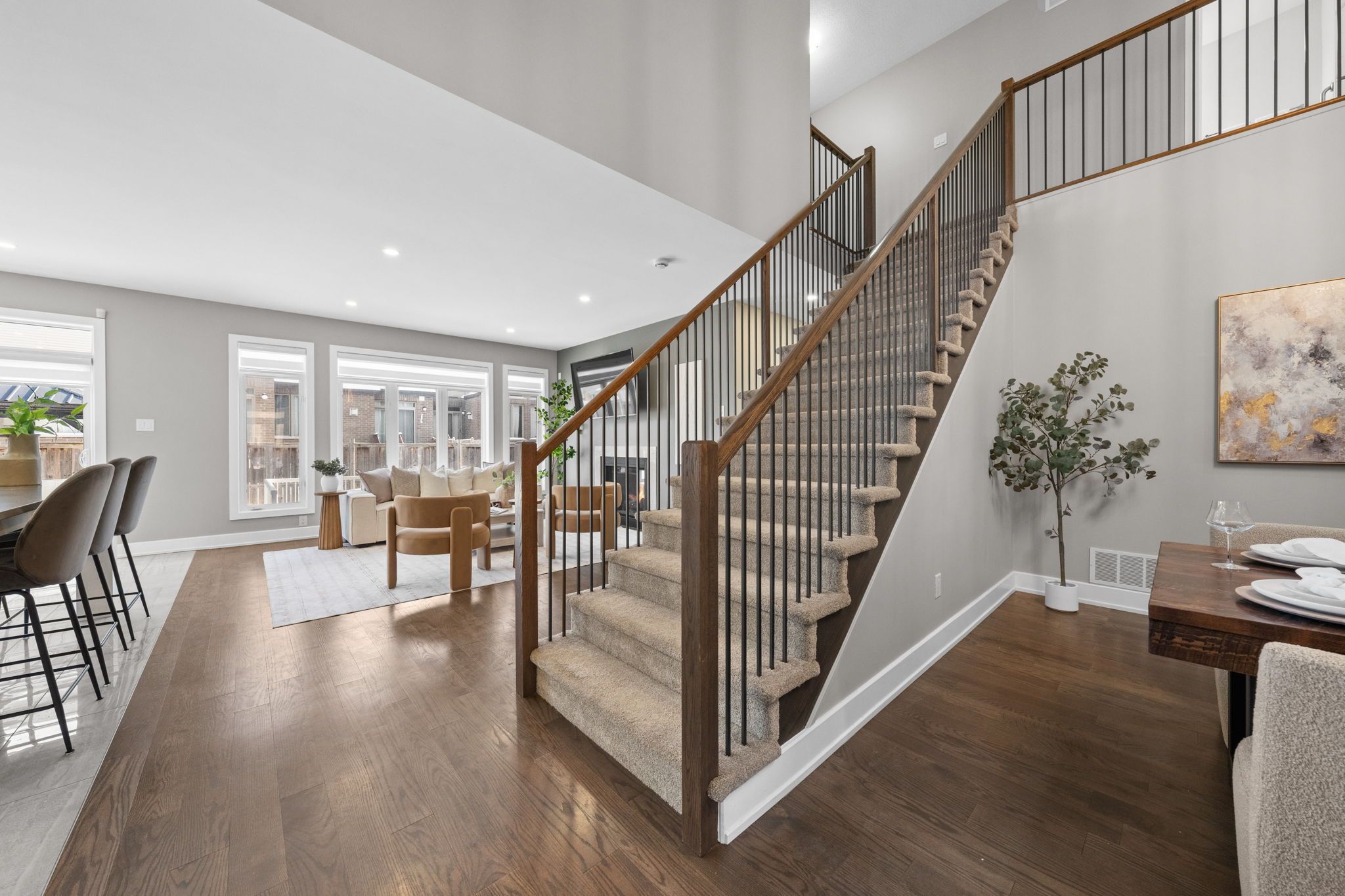 Welcome to 424 golden springs drive, offering over 5,400 sq. Ft. Of finished living space on a premium pie-shaped lot in sought-after riverside south. Designed for sophistication, functionality, and multigenerational living, homes of this size and versatility are rare. A grand entrance opens to an expansive main floor with soaring ceilings and a smart layout. A private enclosed flex space is ideal for a home office, gym, or formal living room. The open-concept kitchen features quartz countertops, stainless steel appliances, abundant cabinetry, an oversized island with seating, and a large walk-in pantry, flowing into the dining and family rooms with a double-sided gas fireplace. An additional flex space off the family room offers versatility as a playroom, office, or lounge. A spacious mudroom and laundry area with garage access and a separate side entrance add convenience and direct lower-level access. The second level offers five generous bedrooms and three full bathrooms. The primary suite includes a large walk-in closet and spa-inspired ensuite with soaker tub and glass shower. One bedroom features a jack and jill bath, another has a private ensuite, and four bedrooms include walk-in closets. The fully finished lower level offers a legal secondary dwelling with separate entrance, two bedrooms, two bathrooms, a full kitchen, living and dining areas, separate laundry, radiant floor heating, and ample storage, ideal for extended family or income potential. The pool-sized pie-shaped lot includes a deck and gazebo, welcoming front porch, extended stone walkway, and extra parking. Located steps to parks, schools, trails, and minutes to shopping and amenities, this exceptional riverside south home combines space, comfort, and flexibility.