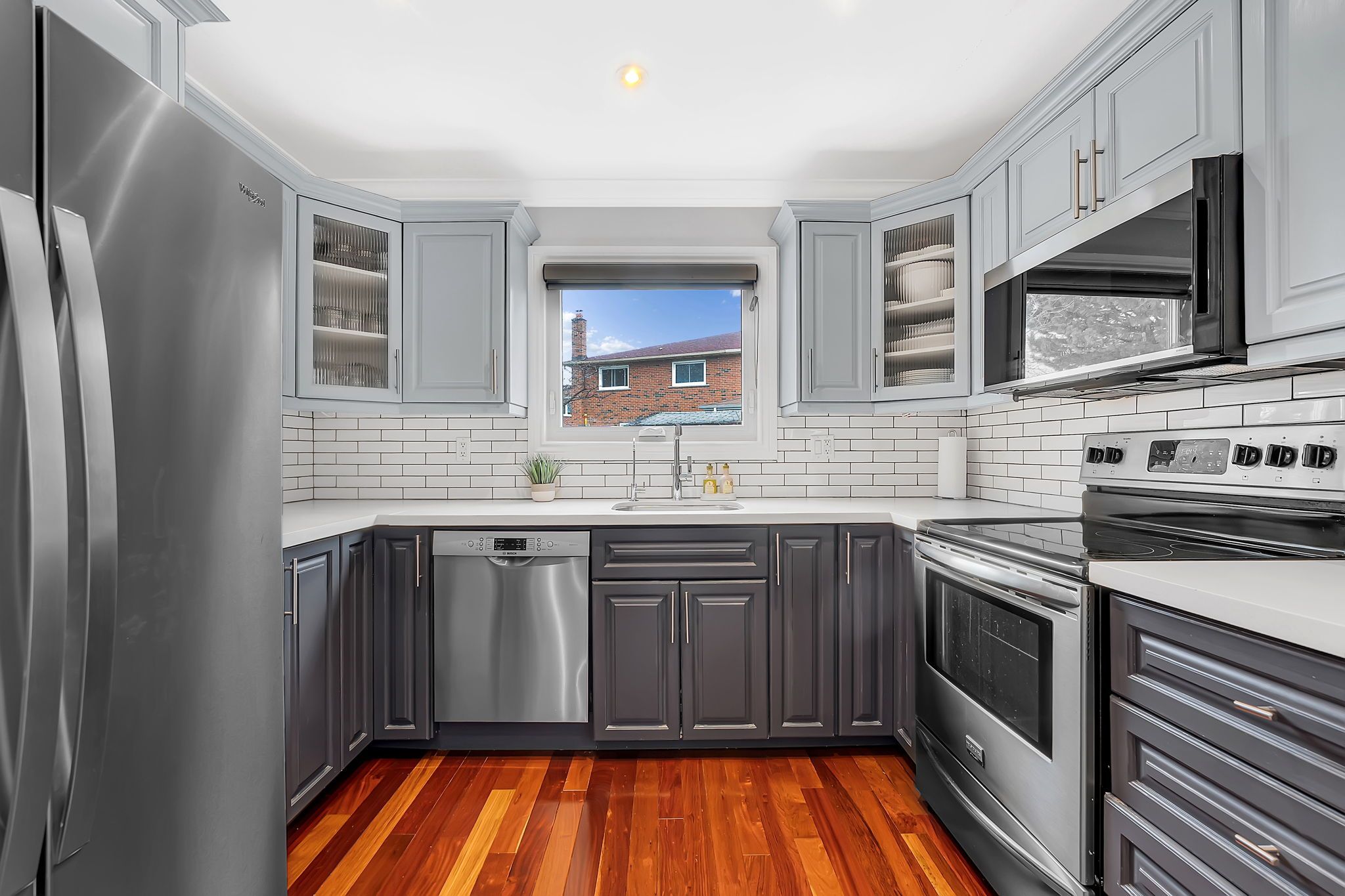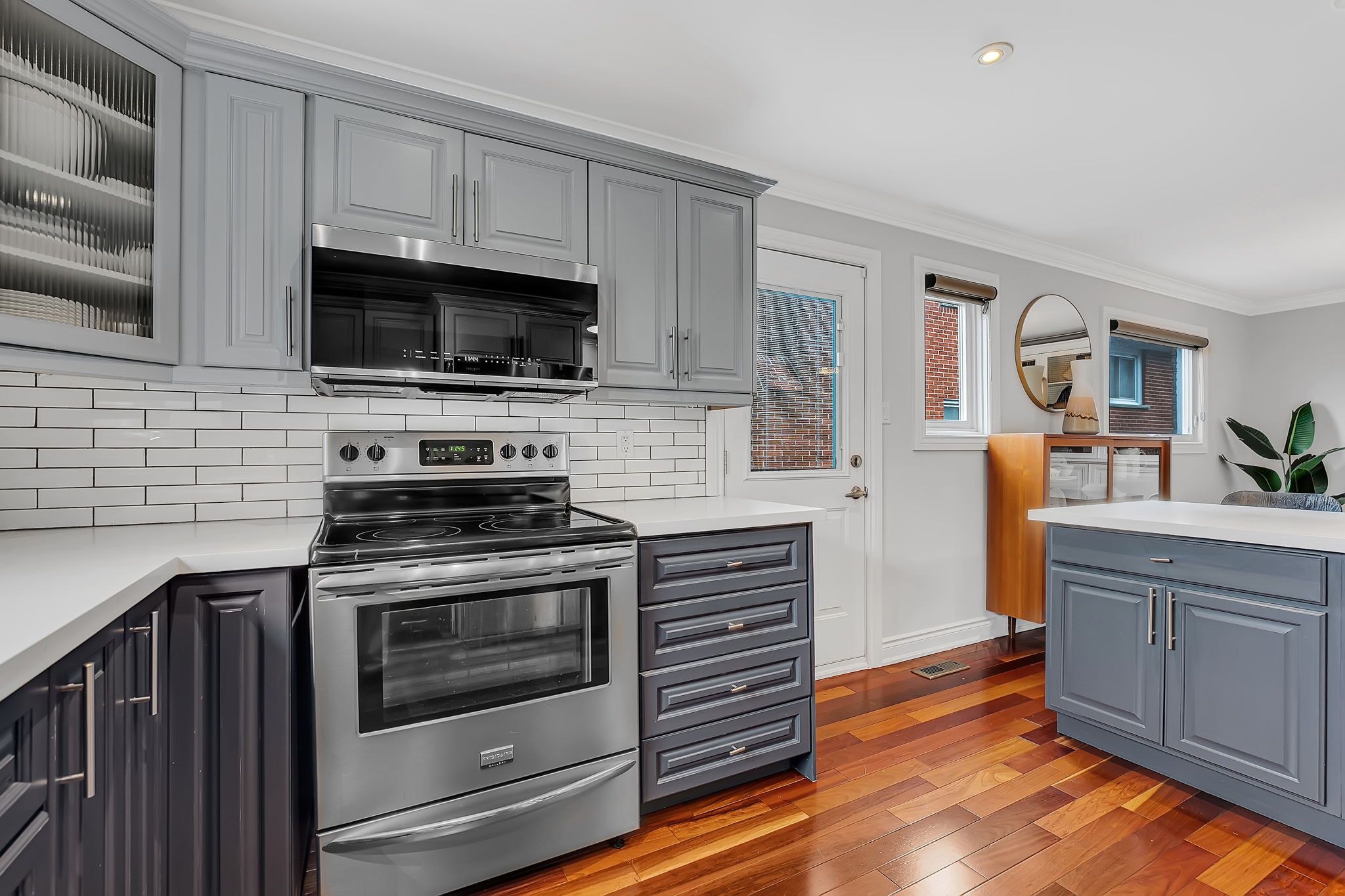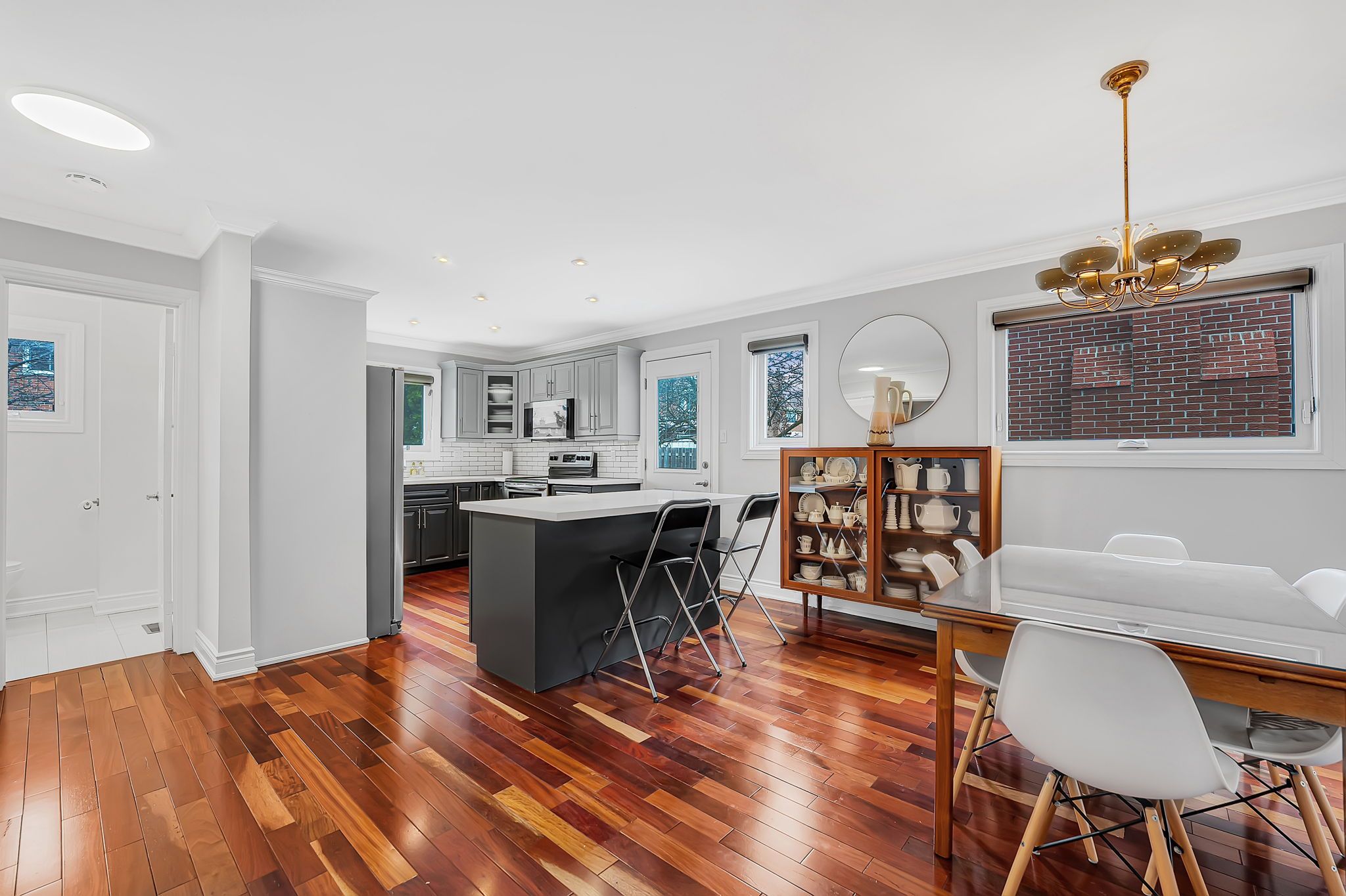 • Updated kitchen with stainless steel appliances and a large center island.