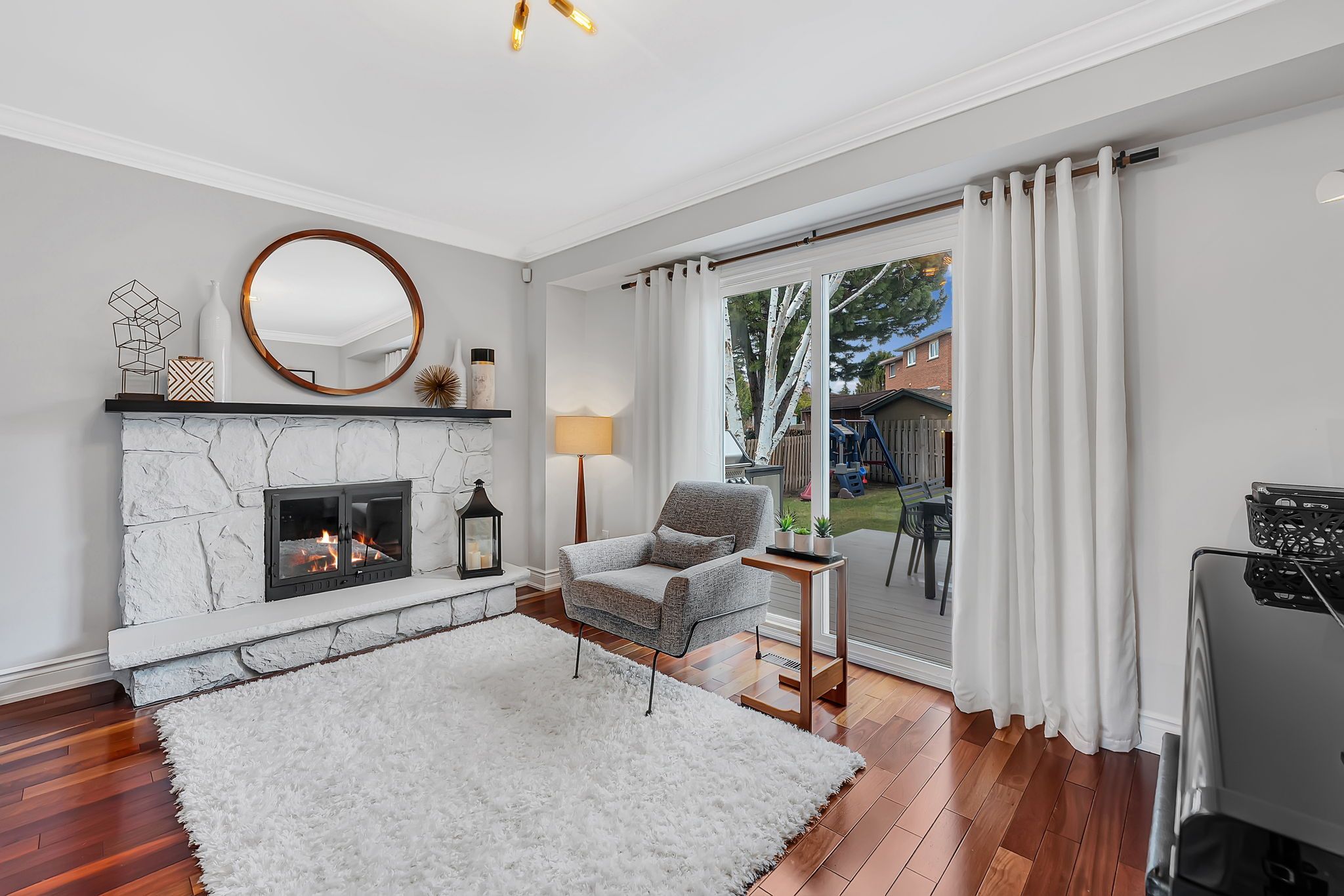 • Inviting family room with a cozy fireplace overlooking a fenced backyard.