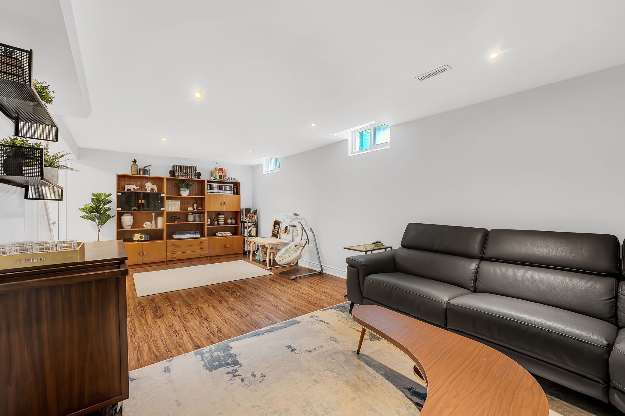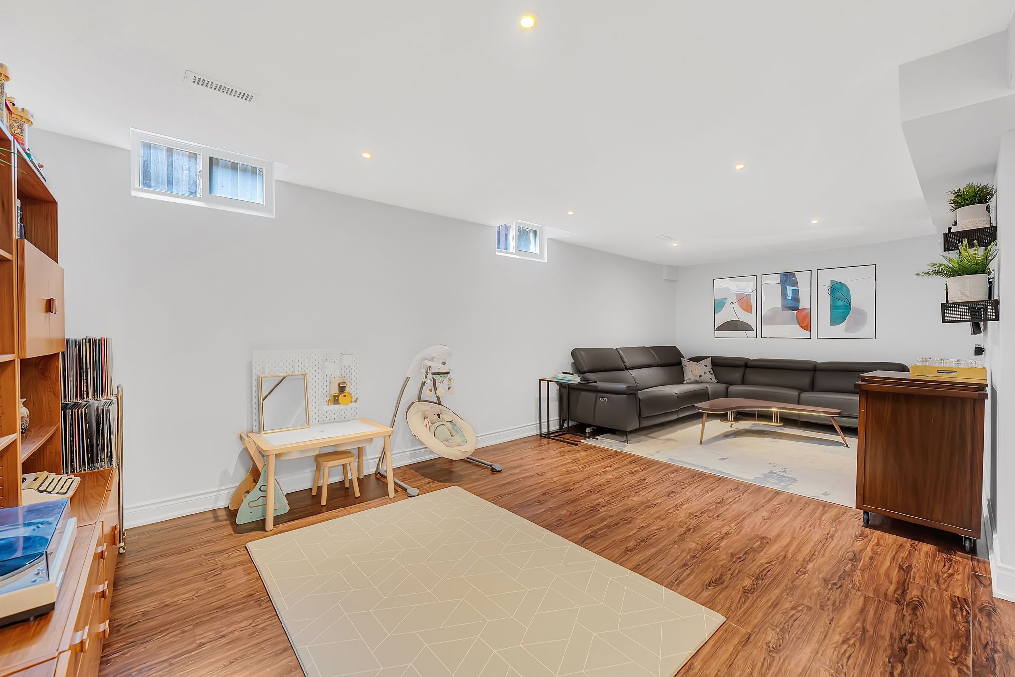 • Finished basement with recreation area, additional bedroom, and ample storage.