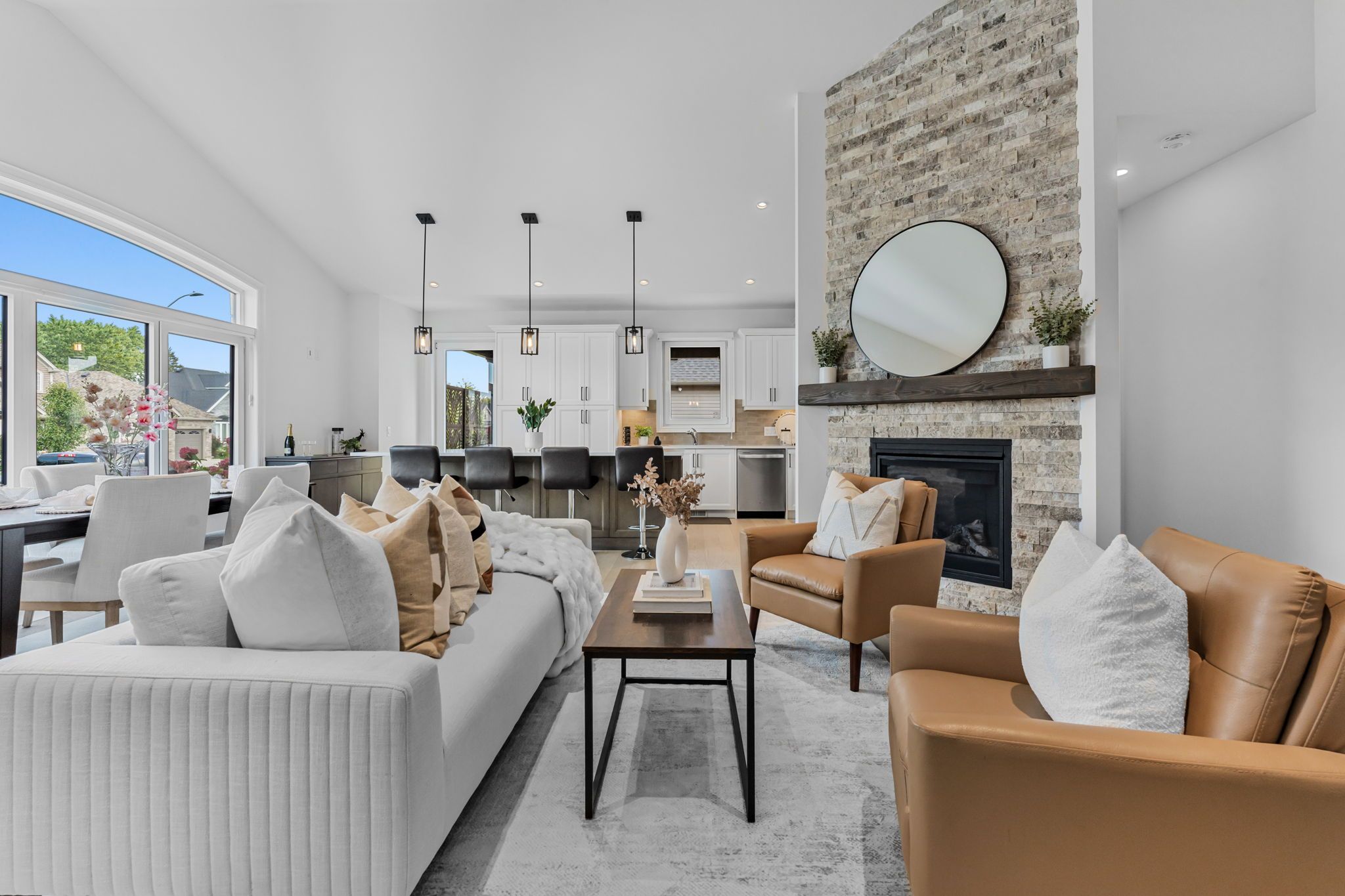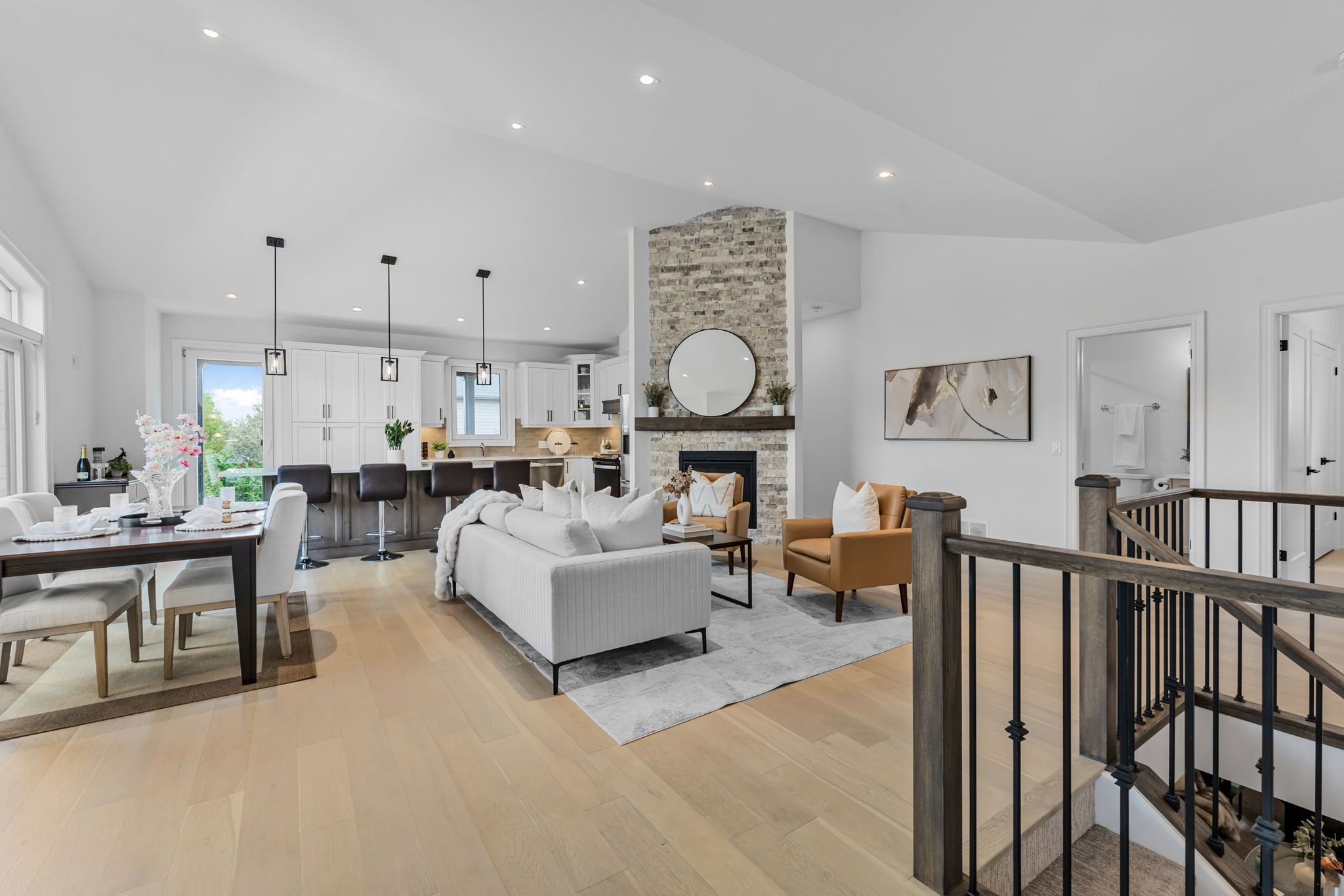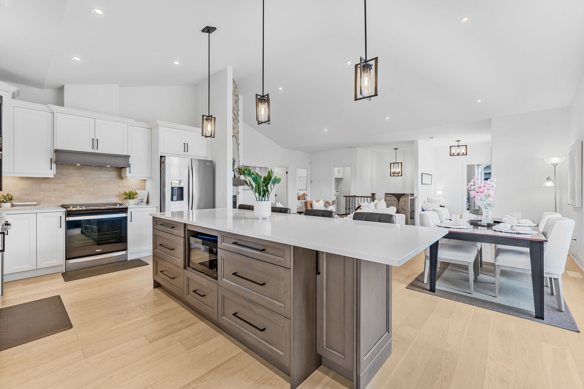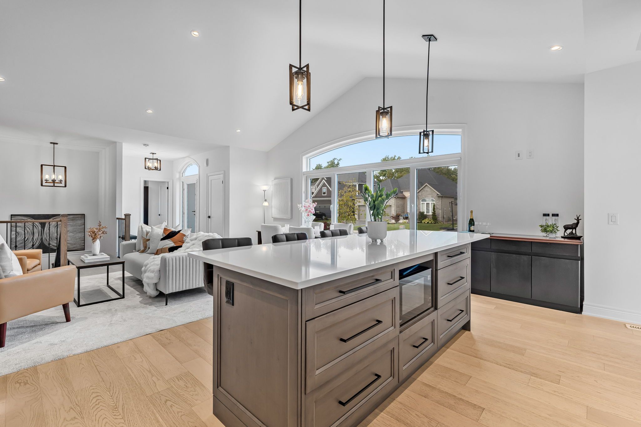 • Open-concept great room with cathedral ceilings and hardwood flooring.