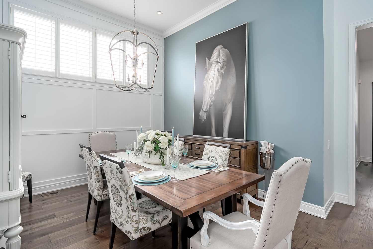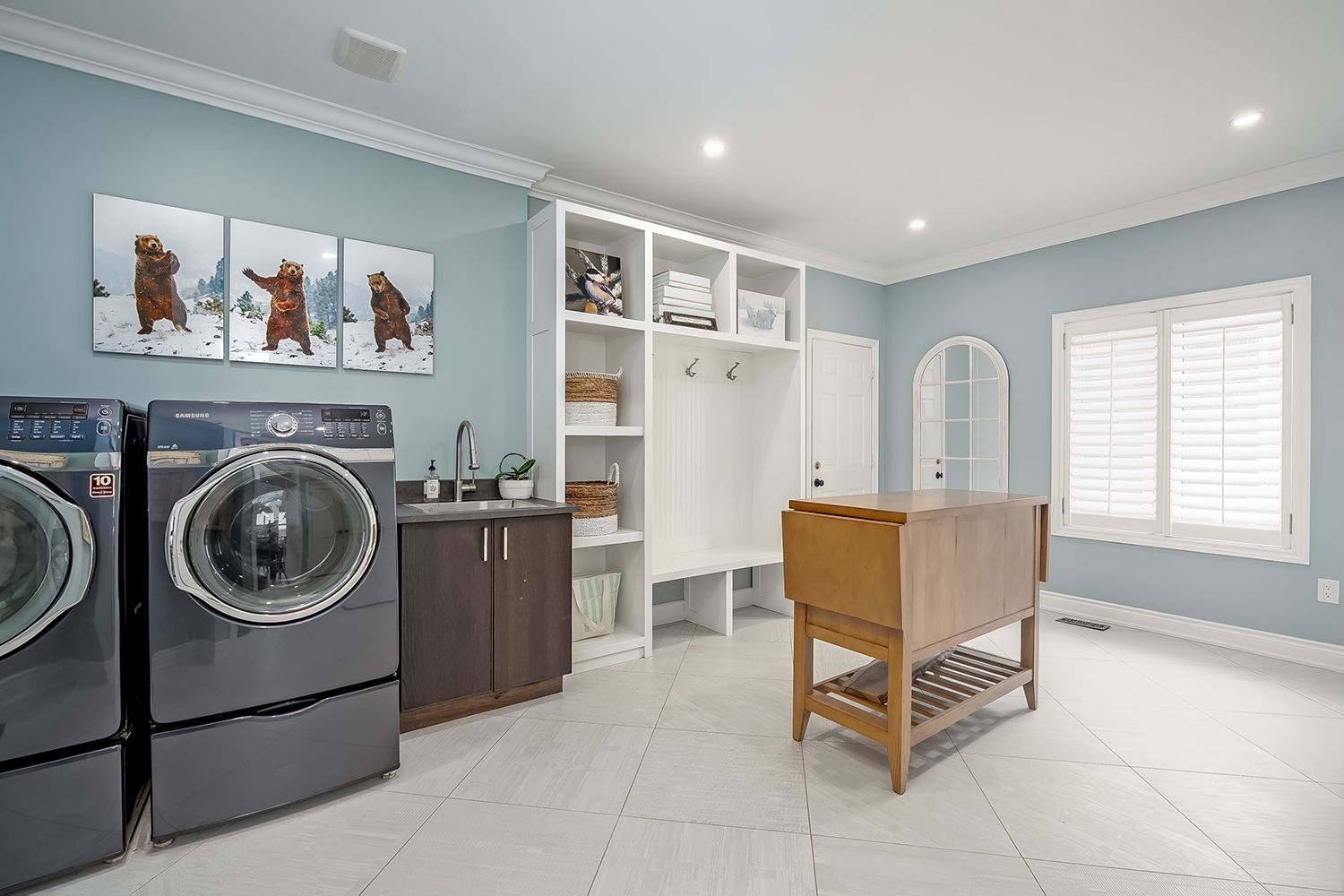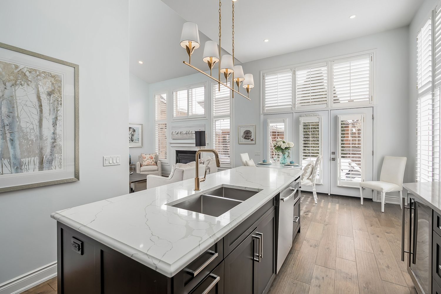 • Stylish kitchen with custom cabinetry, large island, and stainless steel appliances.