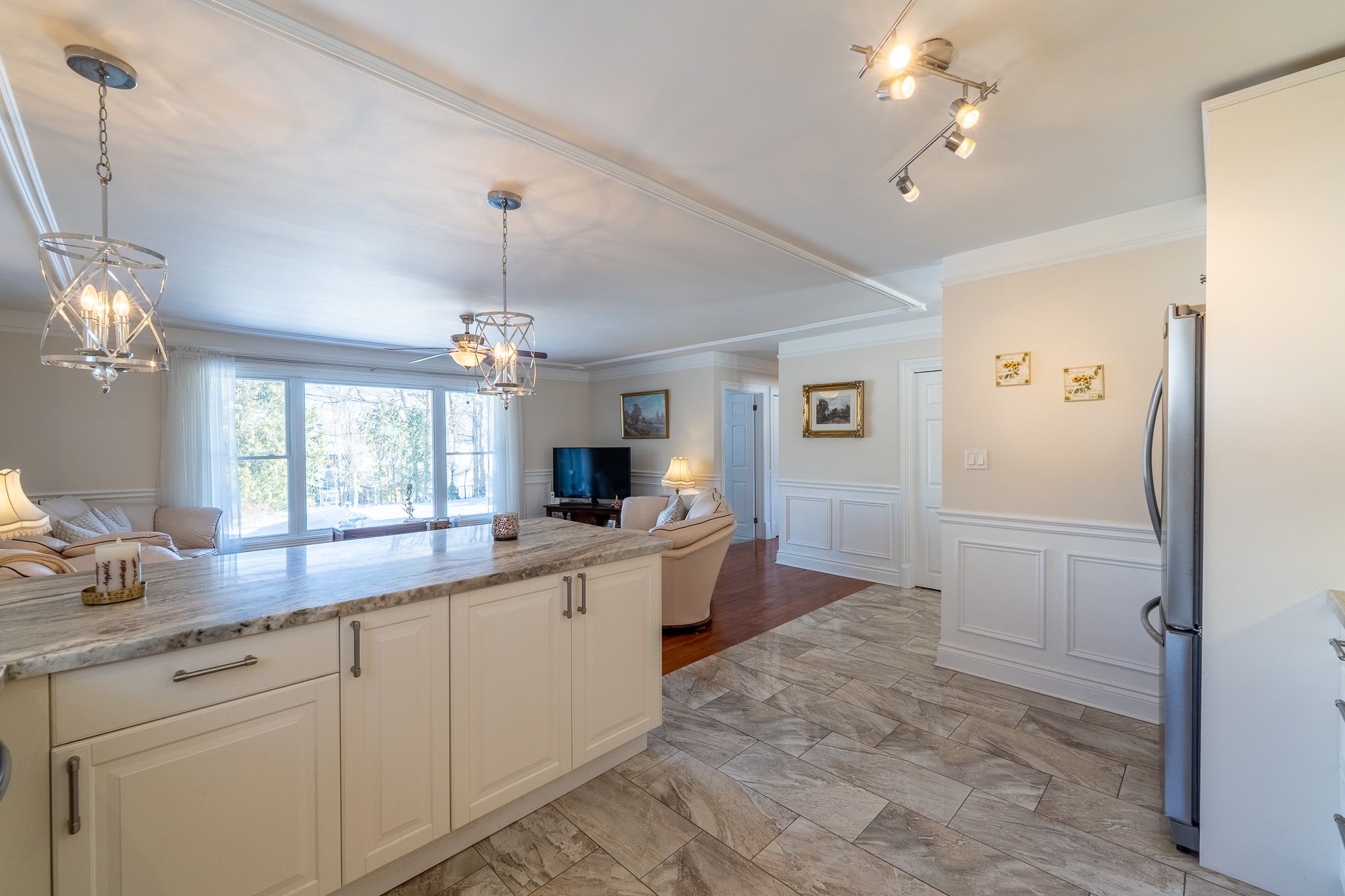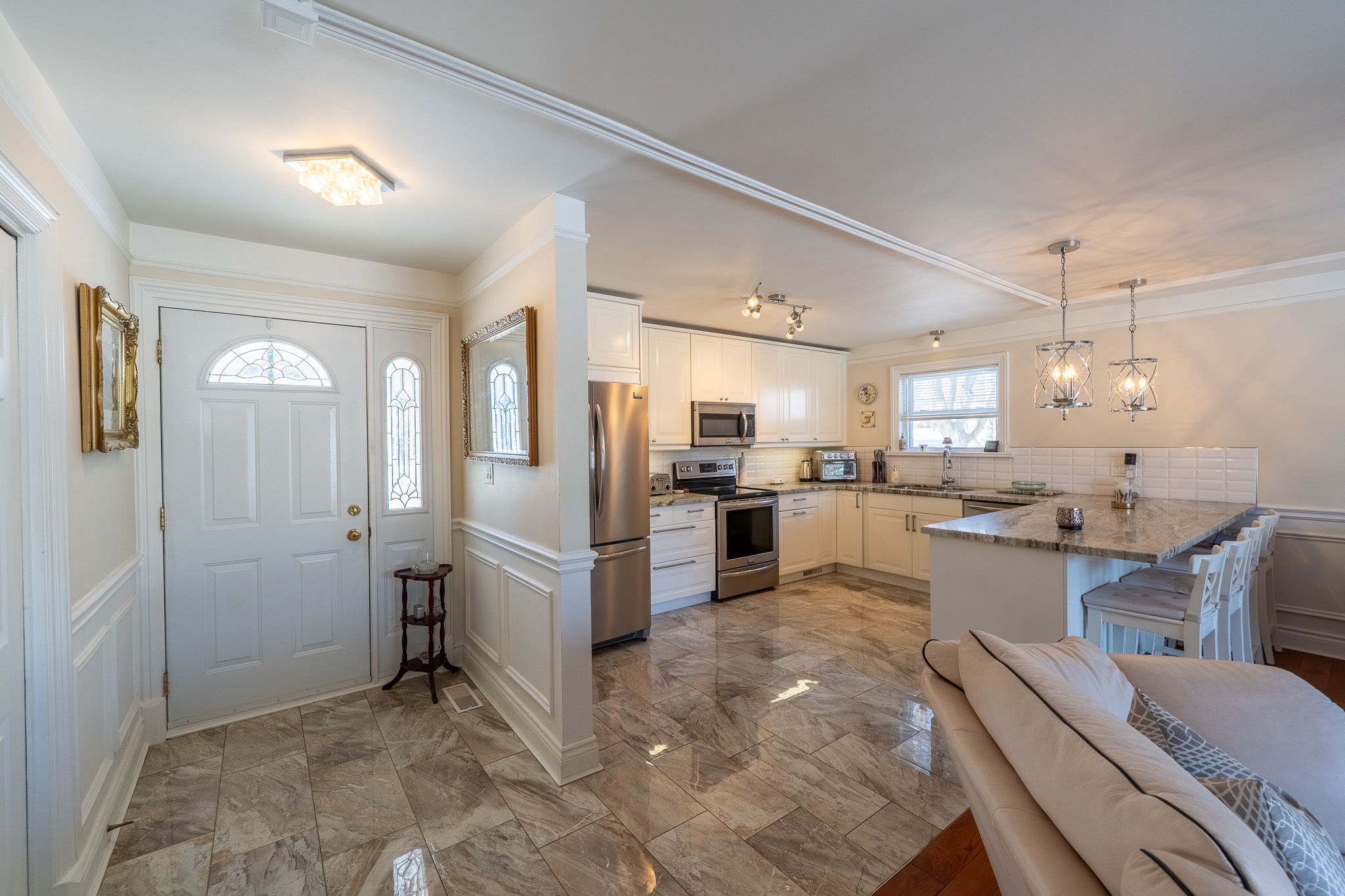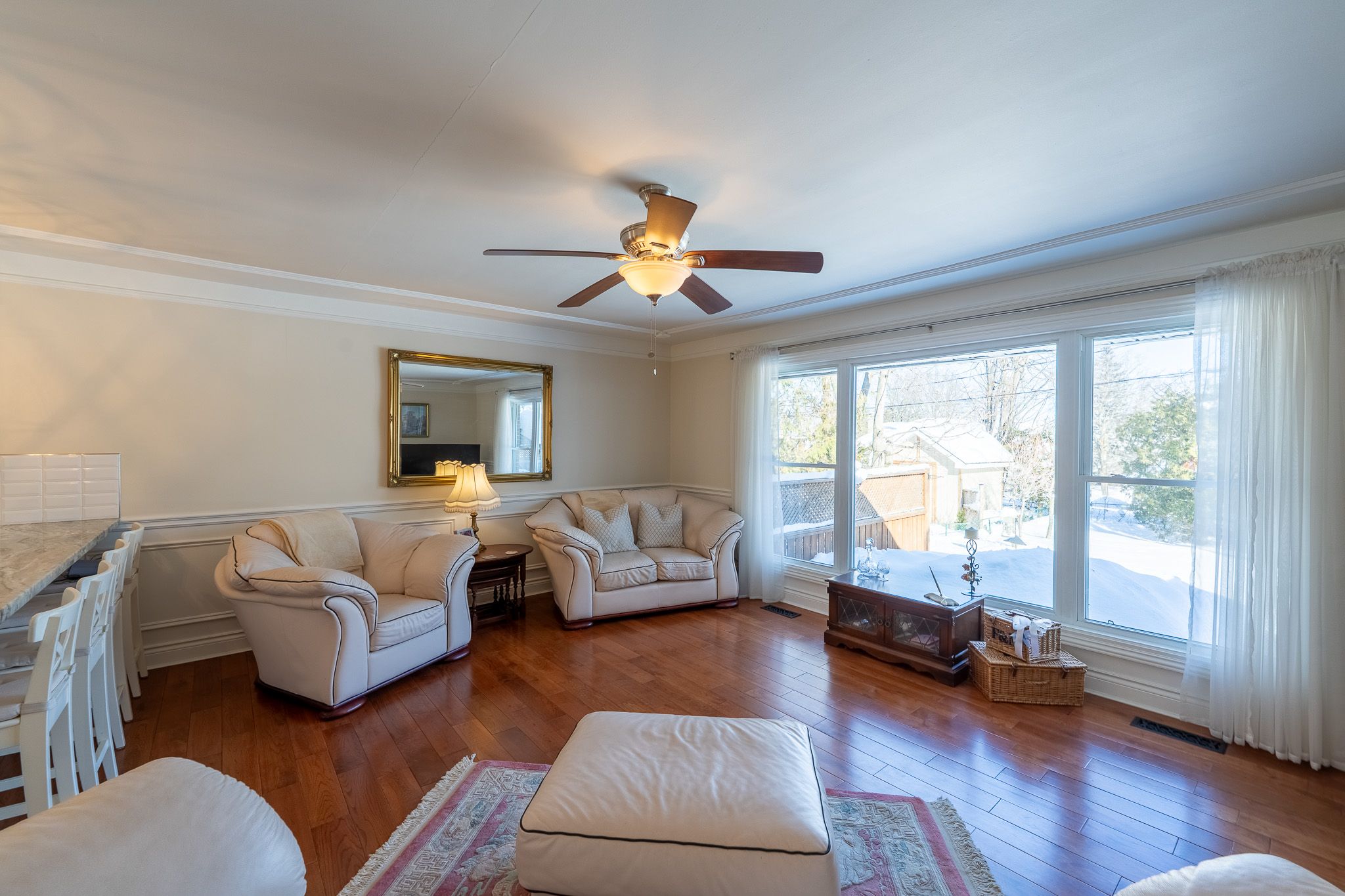 Beautifully maintained 3-bedroom brick bungalow situated on a meticulously landscaped 68' x 125' lot in the highly desirable north ward neighbourhood. From the moment you enter, you'll appreciate the bright, open-concept main floor designed for comfortable everyday living and entertaining. The spacious living area features gunstock hardwood flooring, custom trim and large picture windows that flood the space with natural light and offer views of the private backyard. The updated kitchen is both functional and stylish, complete with ample cabinetry, breakfast bar seating, porcelain tile flooring and stainless steel appliances. Three bedrooms on the main floor feature original hardwood flooring and are served by an updated 4-piece bathroom. The fully finished basement offers exceptional additional living space and excellent potential for in-law or multi-generational living with its separate exterior access. Renovated to the exterior walls, waterproofed and foam insulated, this level provides a warm, dry and comfortable environment year-round. The lower level includes a large family room with gas fireplace and custom surround, wet bar, recessed lighting, office or games area, and a spacious, beautifully updated laundry room. The luxurious lower-level 4-piece bathroom features a walk-in tiled shower, in-floor heating and double vanity. Extensively renovated over the past 10 years, this home offers peace of mind with major upgrades including electrical panel, plumbing, on-demand hot water system, gas furnace, central air conditioning and updated ductwork, along with quality custom trim throughout. Outdoor living is equally impressive with updated decking, a 14' x 12' gazebo, covered bbq area and unistone patio-perfect for relaxing or entertaining. Ideally located within walking distance to lake couchiching and downtown orillia, and close to shopping, golf, pharmacy and everyday amenities. Single garage & widened driveway w/updated walkway to front door.