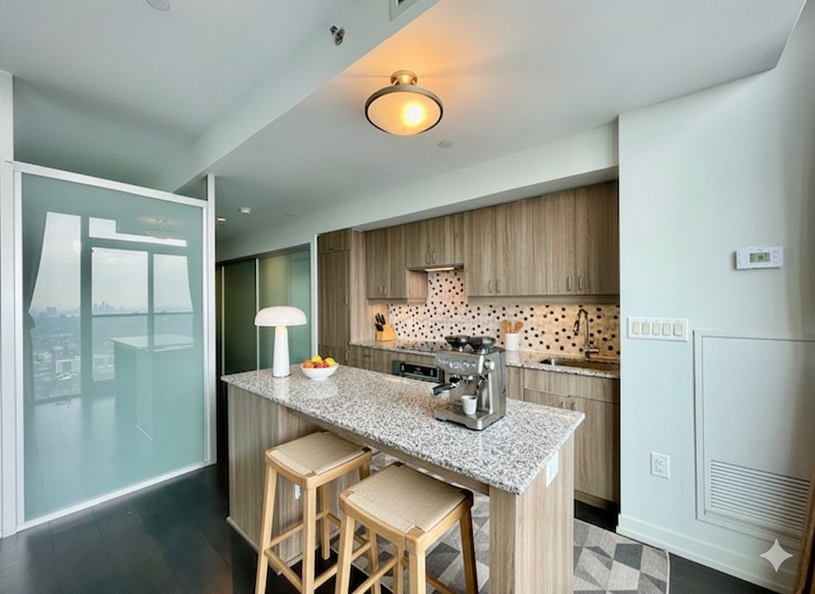 • Bright interior with floor-to-ceiling windows and modern kitchen features.