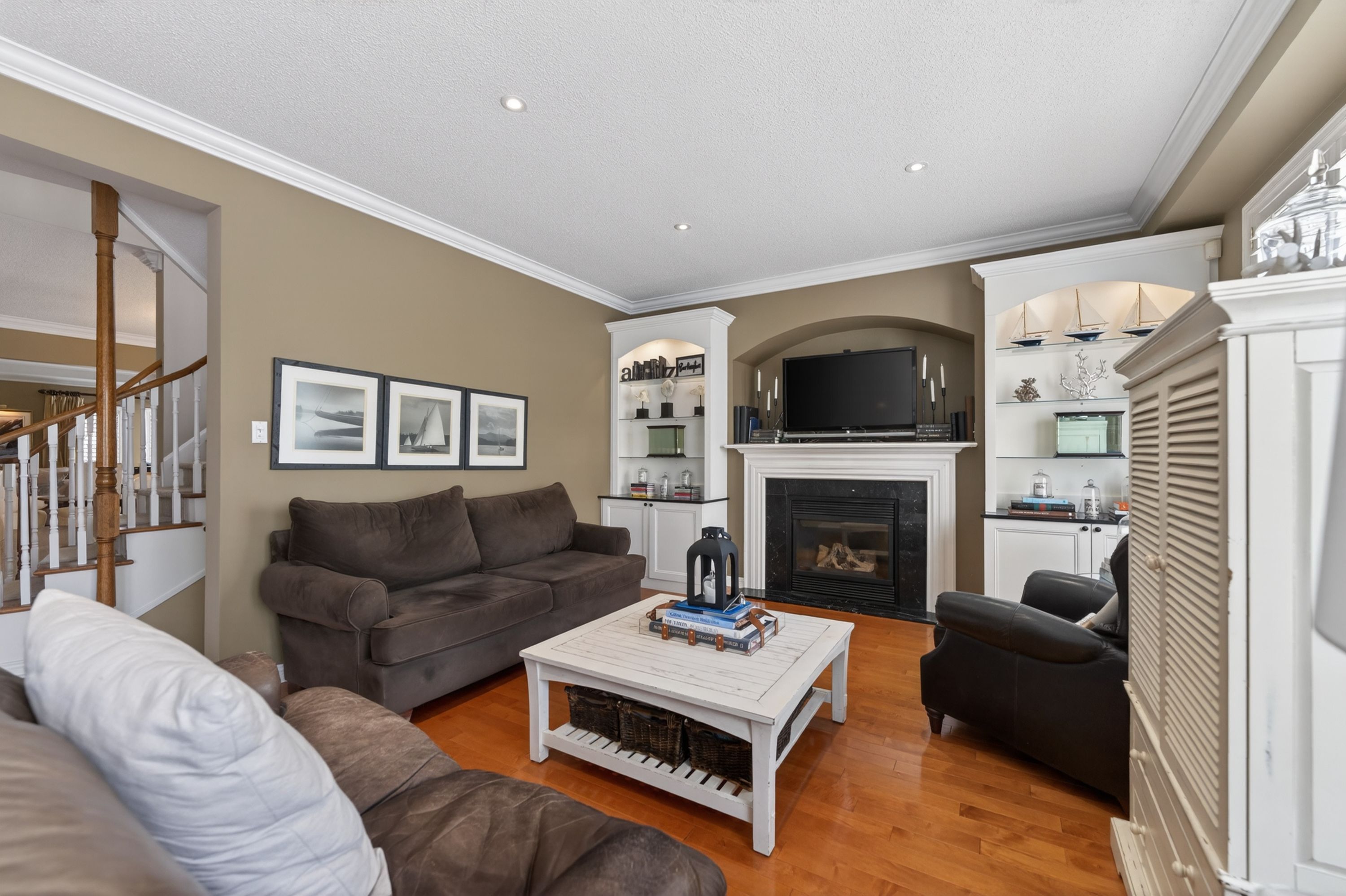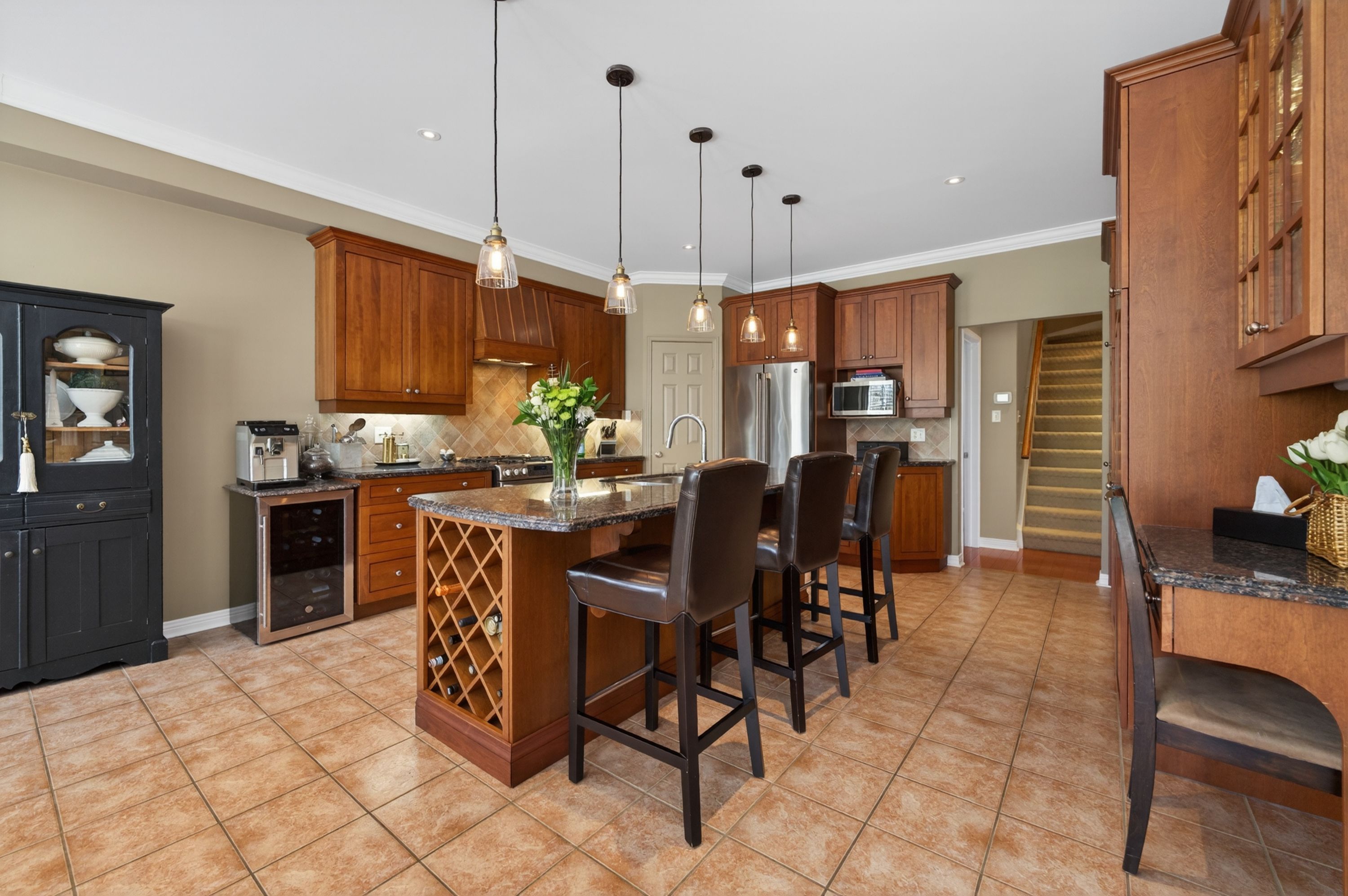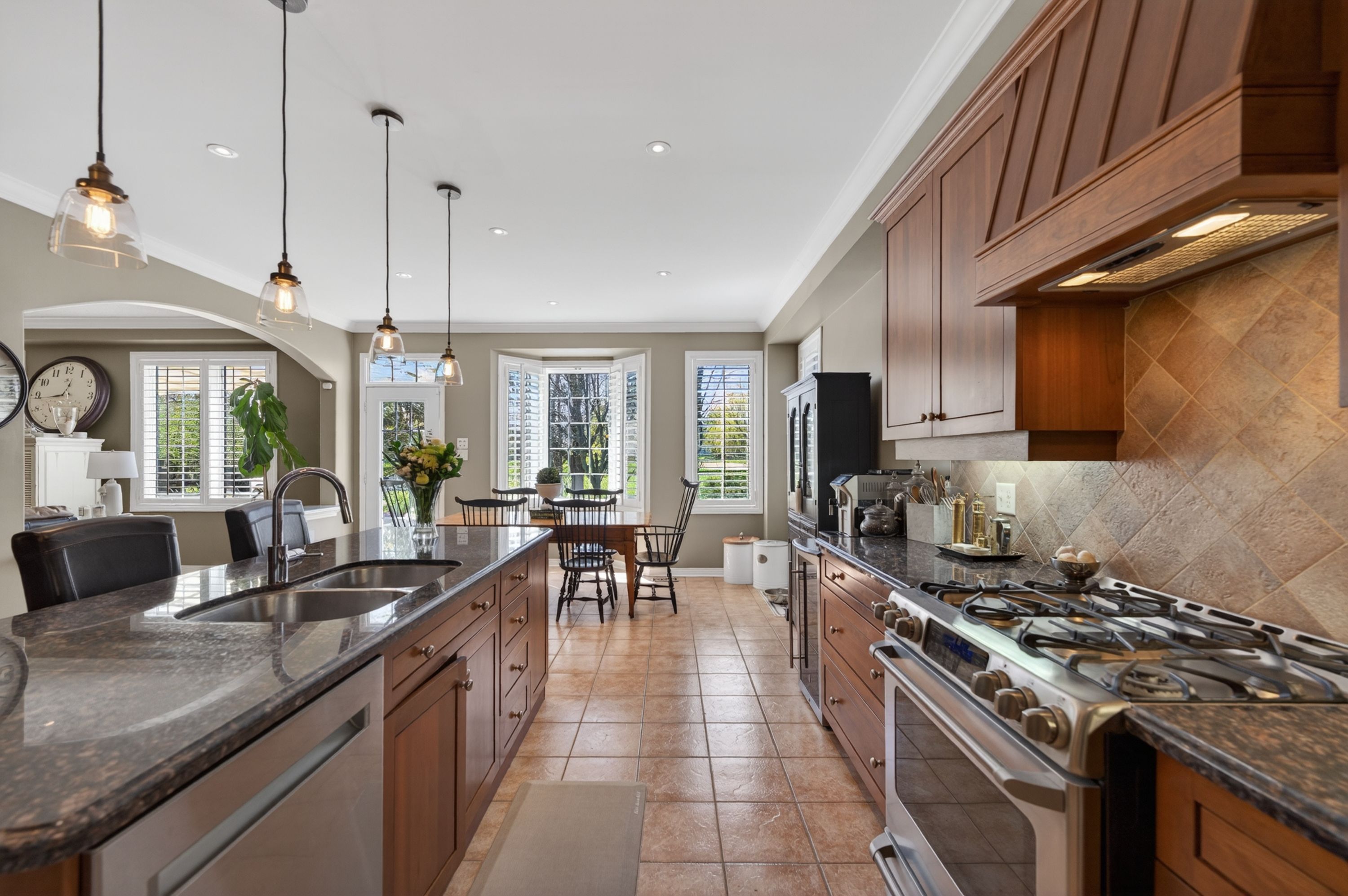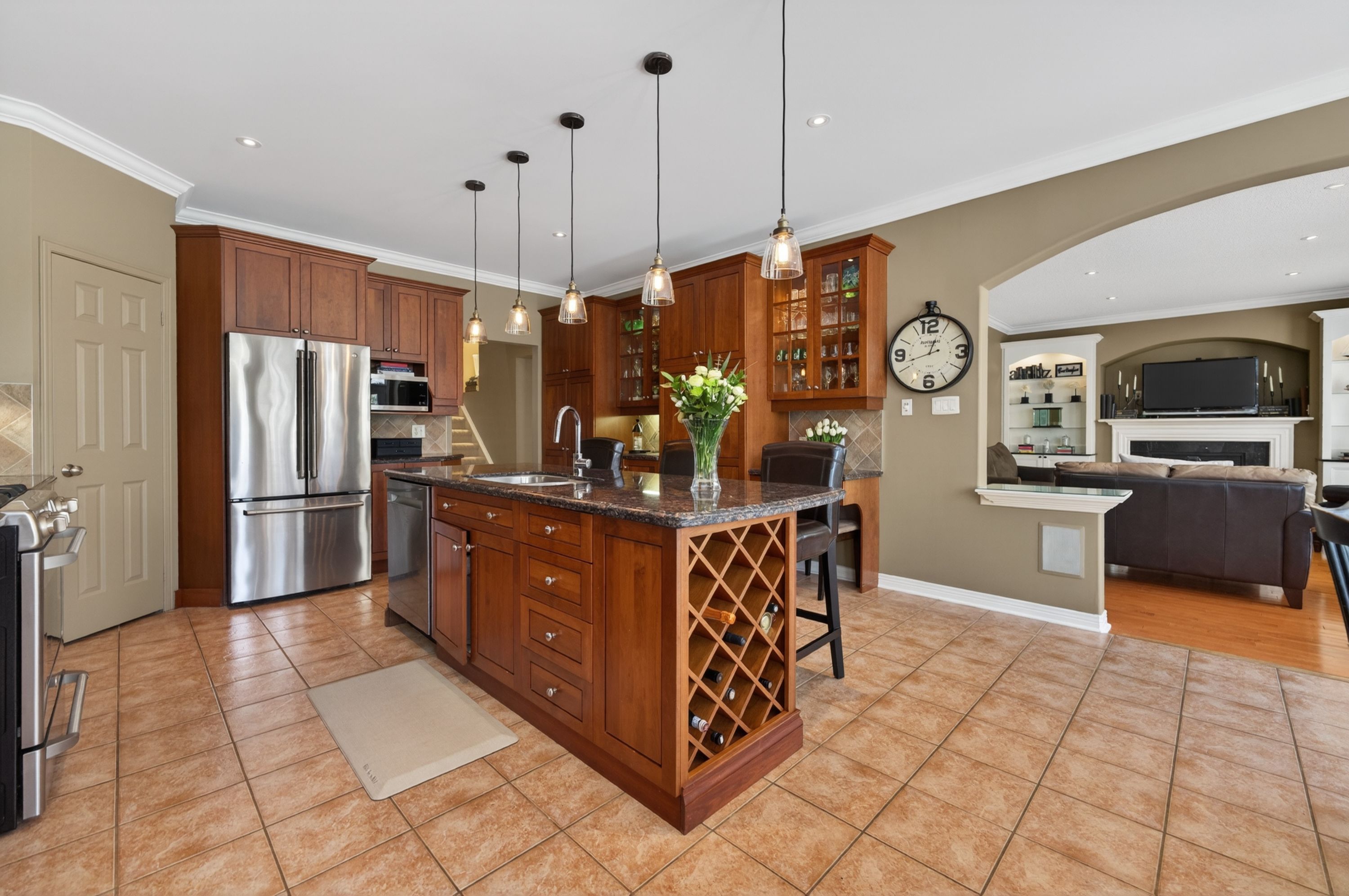• Open-concept kitchen with modern appliances and a warm family room.