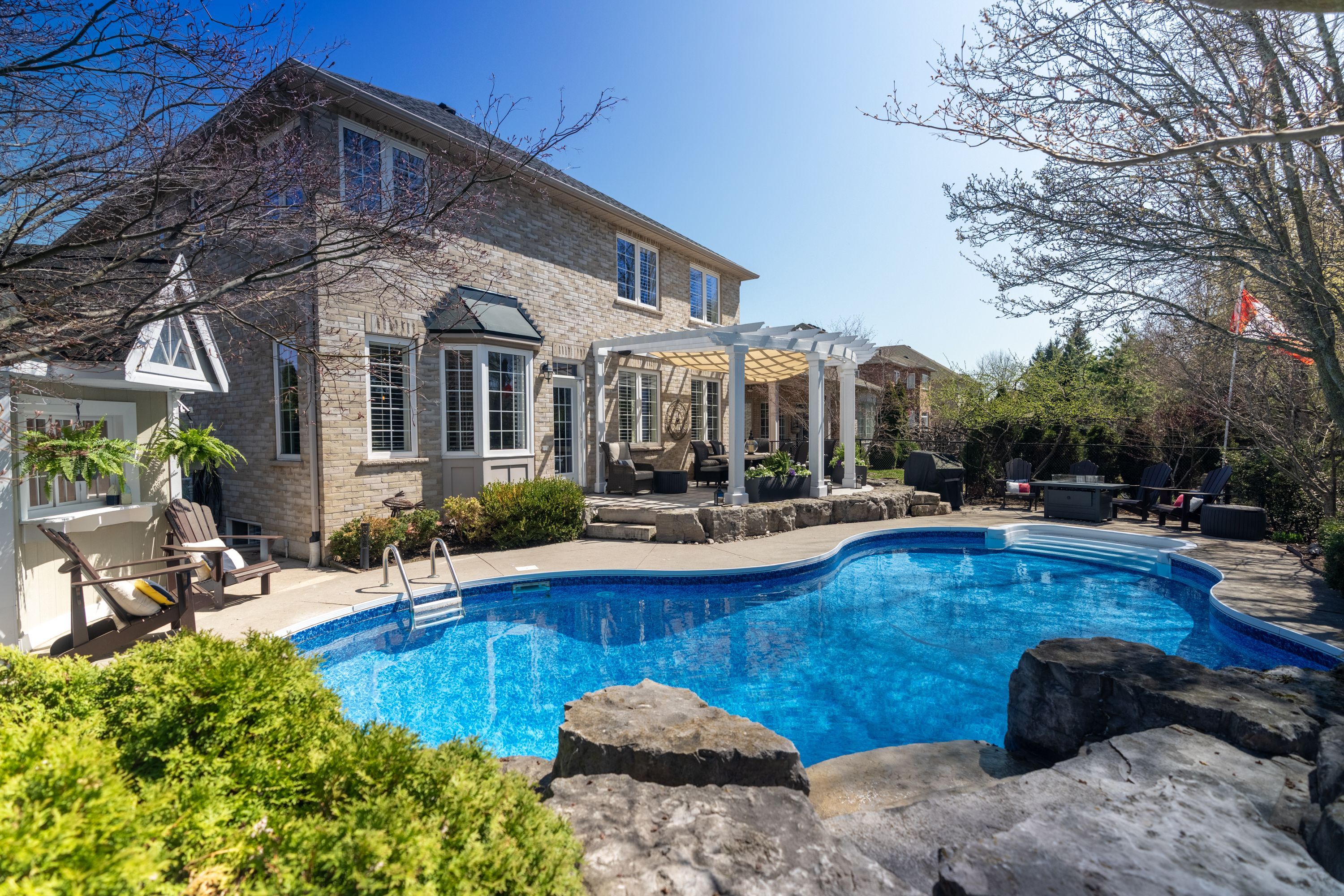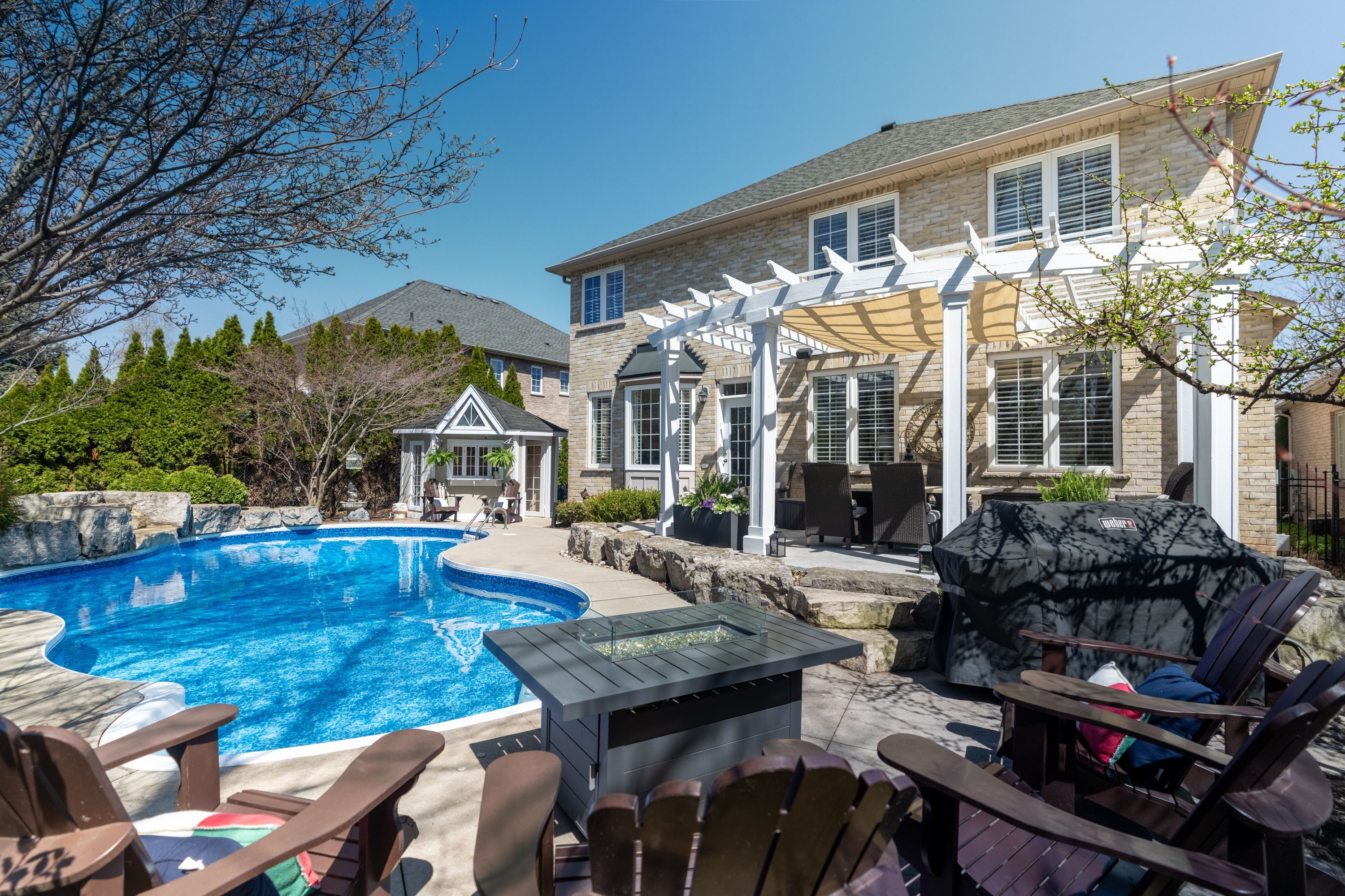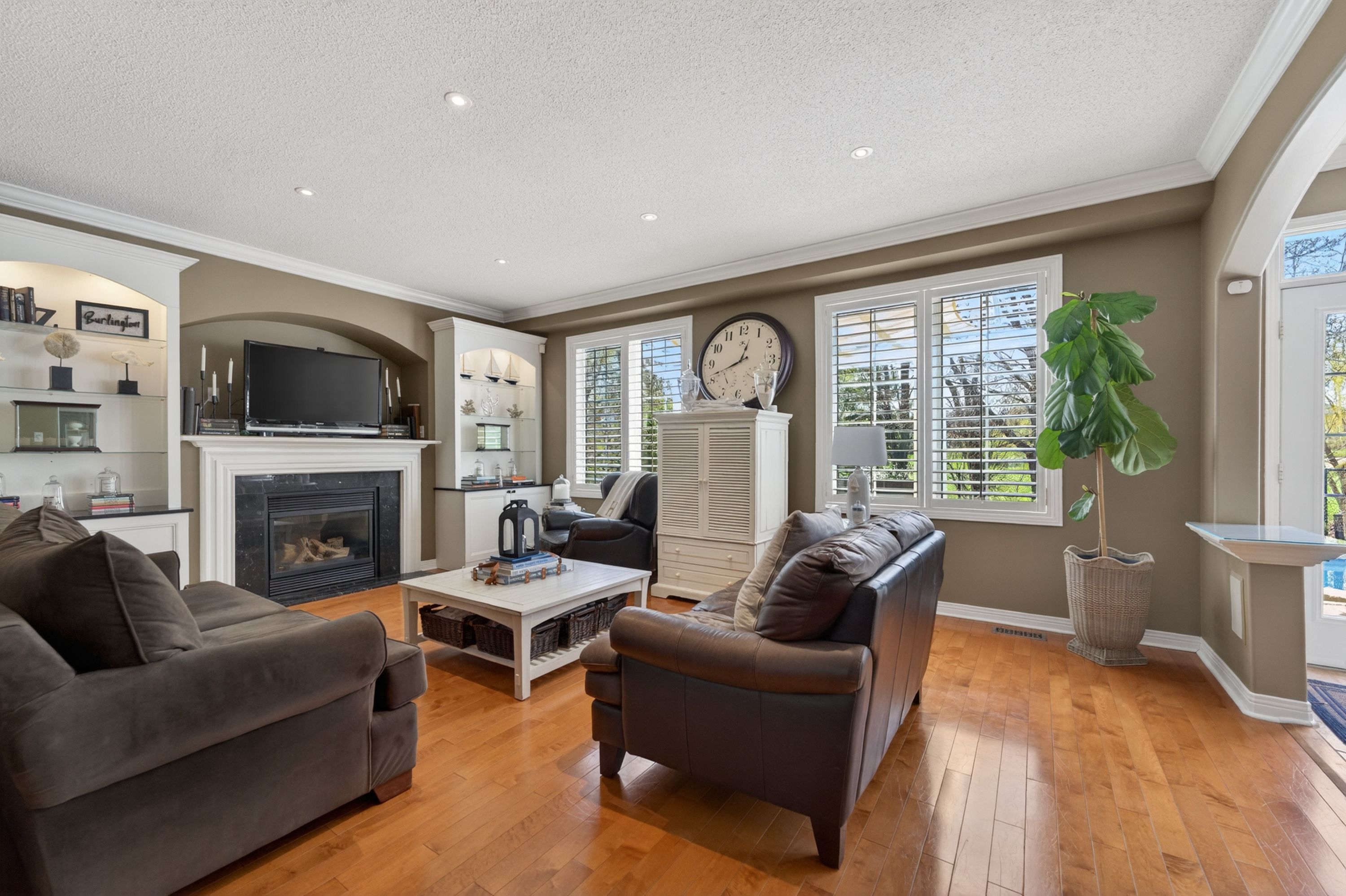 Welcome to 4266 clubview drive in burlington, an exceptional home offering 3,878 sq ft above grade, set in a quiet, highly sought-after area backing directly onto millcroft golf course and just a 5-minute walk to charles beaudoin public school. This beautifully landscaped property features a stunning 18x34 saltwater in-ground pool with concrete surround, pergola, garden pool shed, gas bbq line, and a covered front patio, creating the perfect outdoor retreat. Inside, the main floor showcases 10' ceilings, hardwood flooring, california wood shutters, crown molding, and a built-in sound system throughout. The spacious layout offers a formal living and dining room, a private office, and an open-concept kitchen and dinette overlooking the backyard, complete with cherry cabinetry, granite countertops, a large island with sink, and stainless steel appliances, flowing into a warm and inviting family room with gas fireplace and custom built-ins with lighting. Additional conveniences include main floor laundry, central vac, and a security system. The second level features five generously sized bedrooms, all carpeted, with two jack and jill bathrooms plus a luxurious primary suite with a 5-piece ensuite including a large tub, glass walk-in shower, double sinks, and his and hers walk-in closets. The fully finished basement offers laminate flooring, a sixth bedroom, full bathroom, spacious rec room with gas fireplace and built-ins with lighting, and a wet bar with fridge, perfect for entertaining. With a 3-car attached garage, 200 amp service, and double staircases to both the upper and lower levels, this home combines function, space, and elegance, all just minutes to amenities and quick access to highway 403.