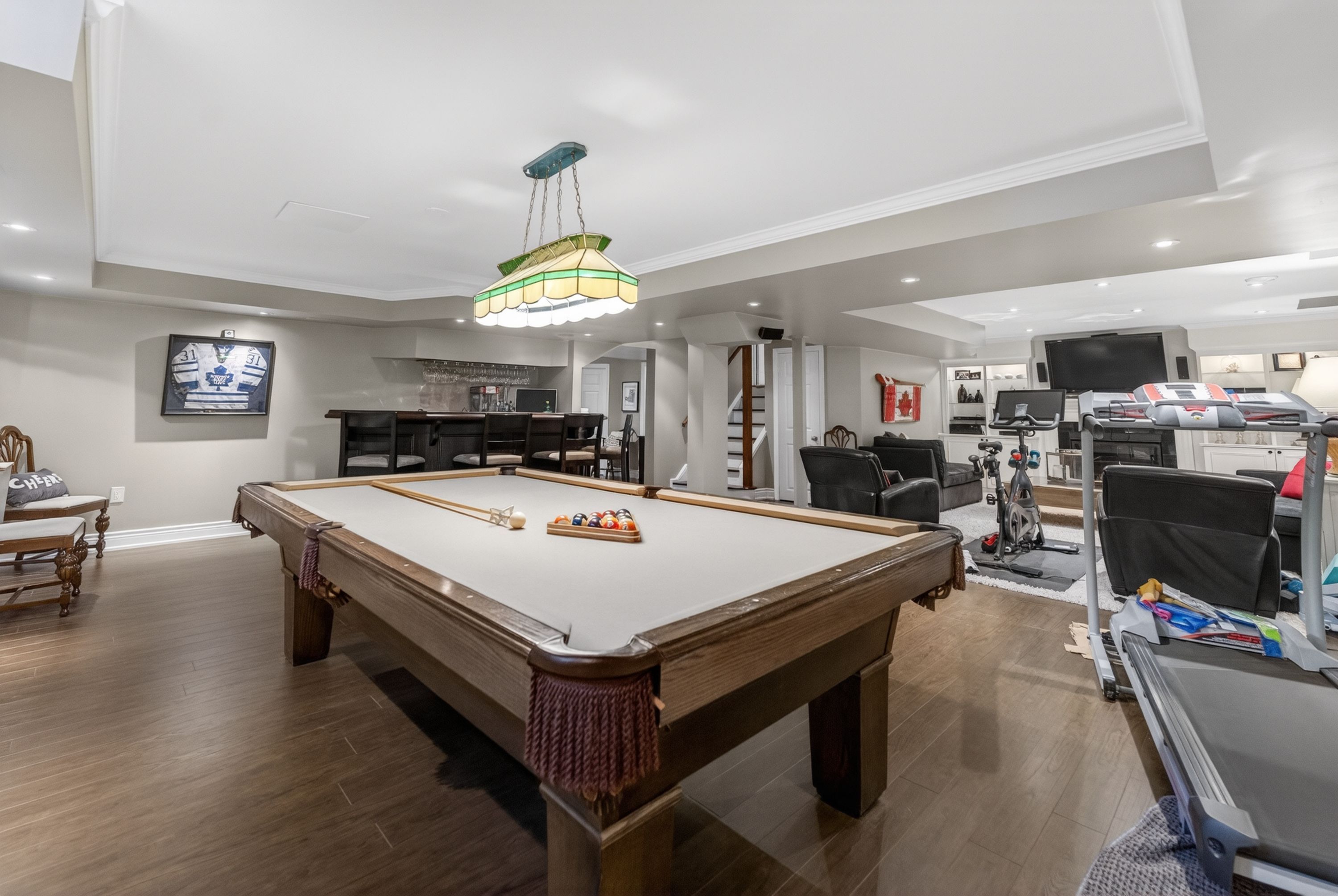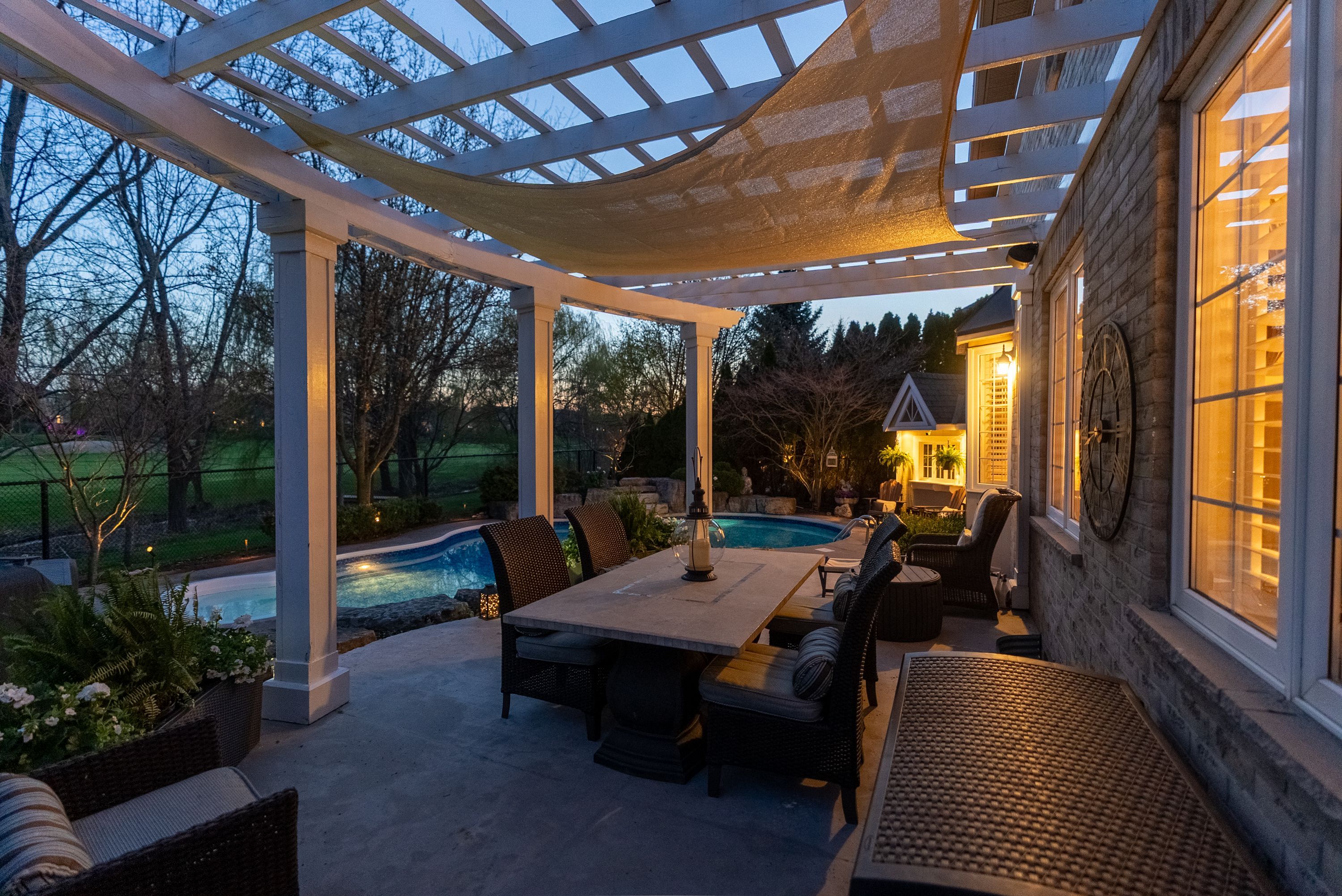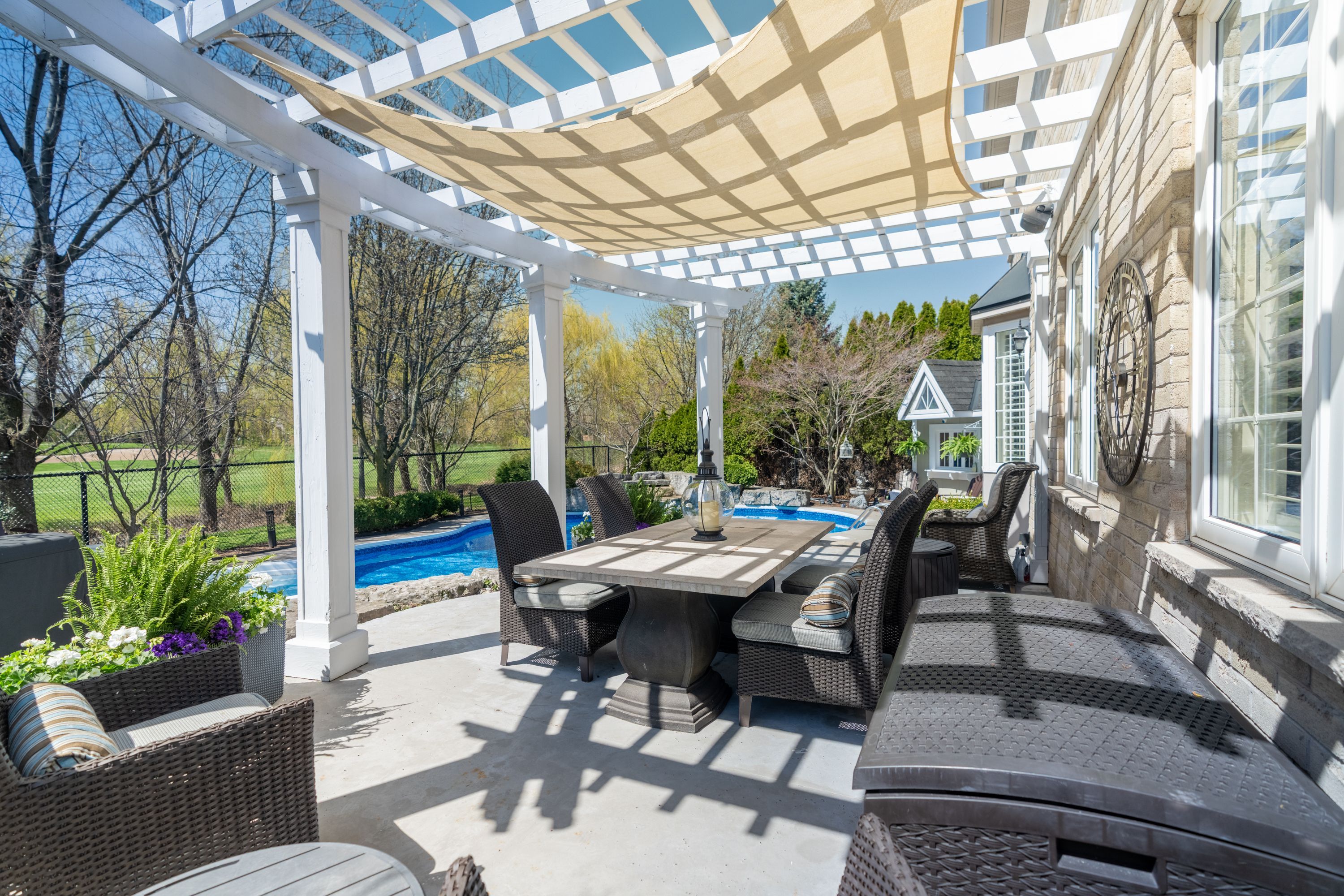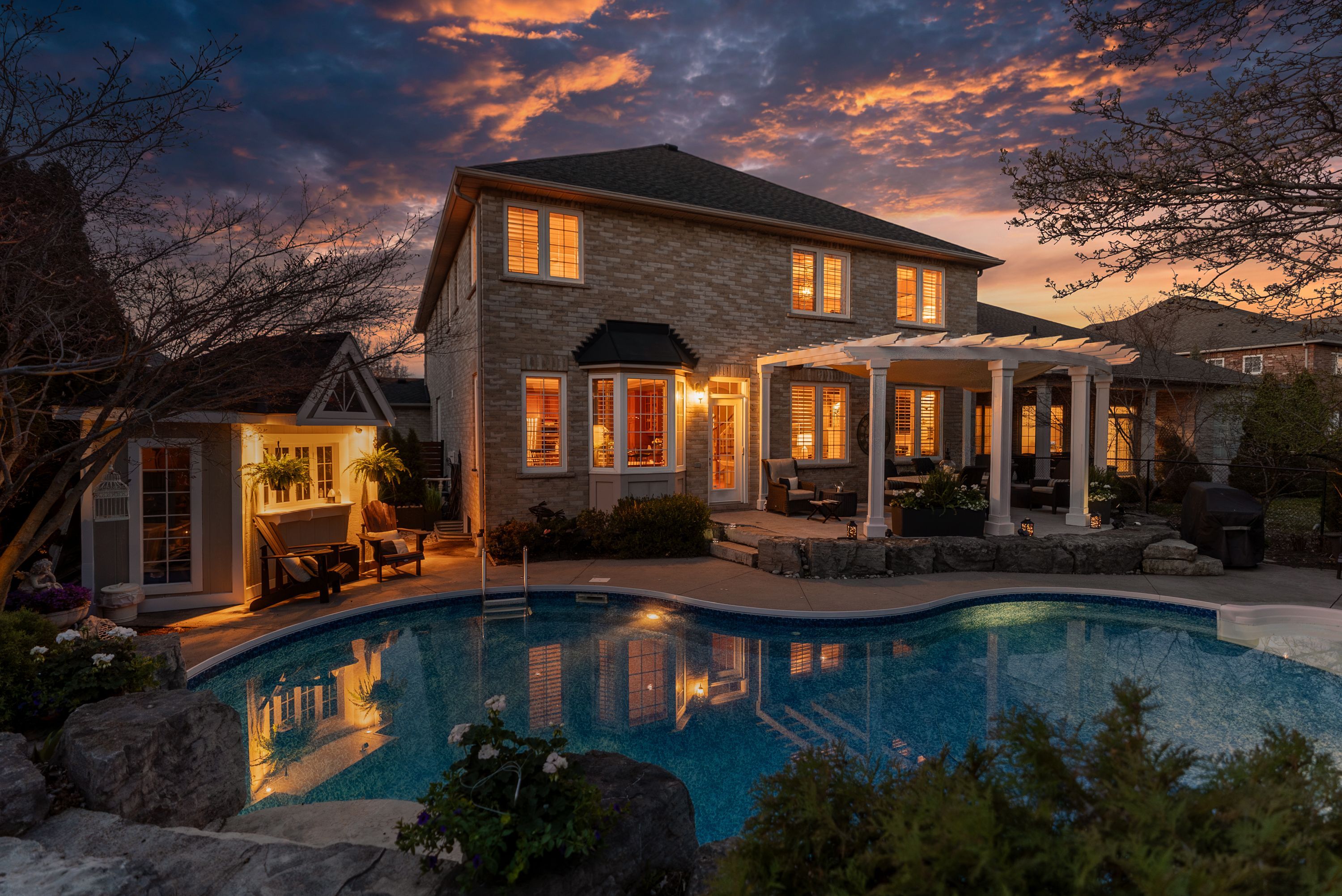 Welcome to 4266 clubview drive in burlington, an exceptional home offering 3,878 sq ft above grade, set in a quiet, highly sought-after area backing directly onto millcroft golf course and just a 5-minute walk to charles beaudoin public school. This beautifully landscaped property features a stunning 18x34 saltwater in-ground pool with concrete surround, pergola, garden pool shed, gas bbq line, and a covered front patio, creating the perfect outdoor retreat. Inside, the main floor showcases 10' ceilings, hardwood flooring, california wood shutters, crown molding, and a built-in sound system throughout. The spacious layout offers a formal living and dining room, a private office, and an open-concept kitchen and dinette overlooking the backyard, complete with cherry cabinetry, granite countertops, a large island with sink, and stainless steel appliances, flowing into a warm and inviting family room with gas fireplace and custom built-ins with lighting. Additional conveniences include main floor laundry, central vac, and a security system. The second level features five generously sized bedrooms, all carpeted, with two jack and jill bathrooms plus a luxurious primary suite with a 5-piece ensuite including a large tub, glass walk-in shower, double sinks, and his and hers walk-in closets. The fully finished basement offers laminate flooring, a sixth bedroom, full bathroom, spacious rec room with gas fireplace and built-ins with lighting, and a wet bar with fridge, perfect for entertaining. With a 3-car attached garage, 200 amp service, and double staircases to both the upper and lower levels, this home combines function, space, and elegance, all just minutes to amenities and quick access to highway 403.